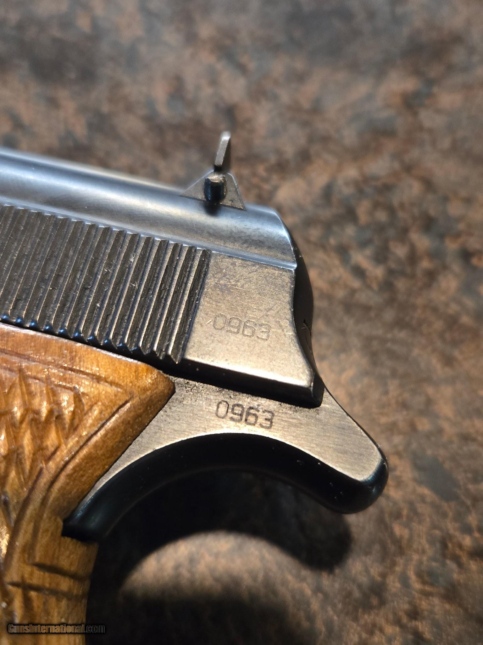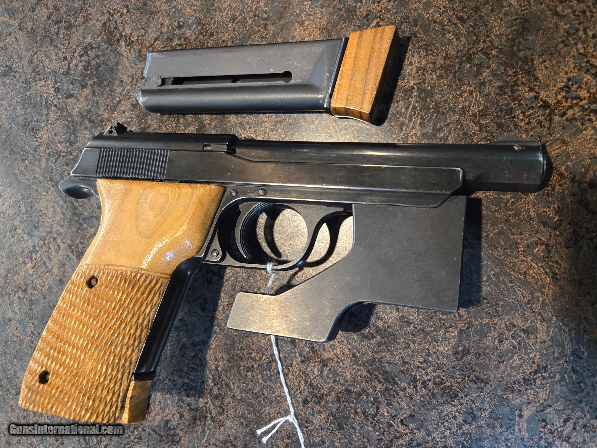 Description: Guns Listing ID: 581530 JUST FIREARM WITH TWO MAGAZINES. The pistol shown is a Erma Werke ET22 / TT Olympia .22LR target pistol, made in Germany by Erma-Werke (Erfurter Maschinenfabrik). Here’s a detailed breakdown: ?? Identification Marking: “TT-Olympia Pistole – Cal. .22 L.R." Logo: The heraldic-style crest with a knight’s head is Erma Werke’s trademark. Serial Number: “0963" — early production example. Caliber: .22 Long Rifle. Configuration: Heavy barrel, adjustable sights, anatomical target grip. ?? Background The Erma TT Olympia was a West German target pistol inspired by the Walther Olympia and Hammerli designs from pre-war Germany and Switzerland. It was produced primarily in the 1960s and 1970s, when German and Swiss manufacturers competed to create precision .22 LR pistols for ISSF-style shooting and club matches. The “TT" in the model name references target training (“Training und Turnier"), reflecting its purpose as a precision sport pistol. ?? Features Single-action only, blowback operation. Adjustable target sights. Heavy milled steel frame with optional barrel weights. Custom-style wooden grips — often handmade or aftermarket (your example has very well-crafted checkered grips). Detachable magazine (usually 8 or 10 rounds). Weight block under the barrel for balance — the squared extension visible in your photos. Manufacturer: ERMA-WERKE Model: TT Olympia Caliber Info: .22 LR Condition: Used - Non-Certified Barrels: 4.5" BARREL Action: SEMI AUTOMATIC Finish: blue Price: $599.99 Contact Seller |