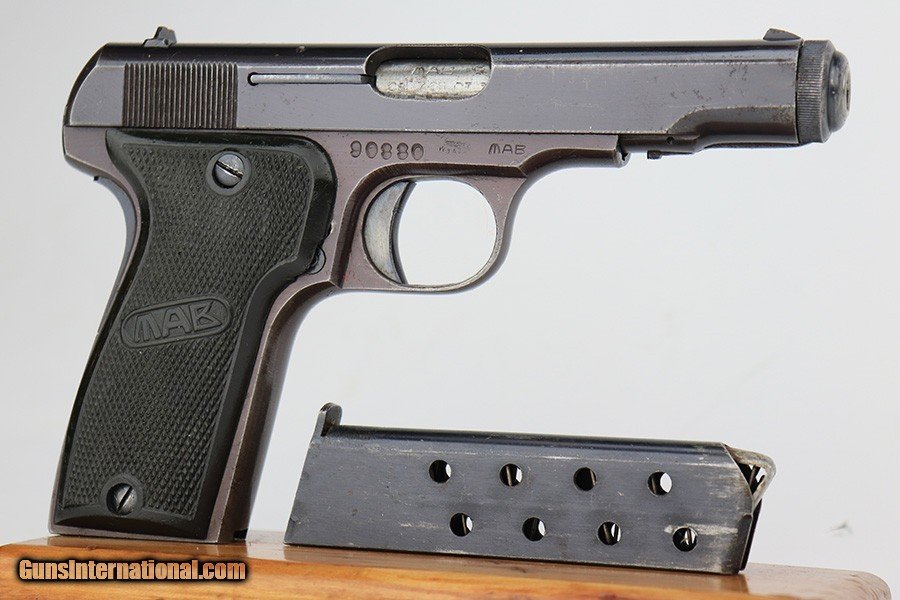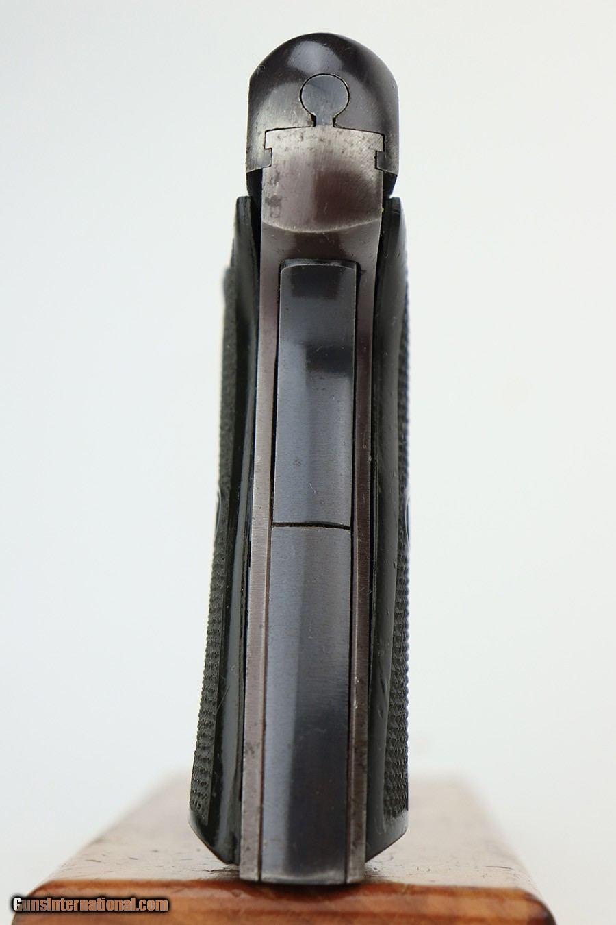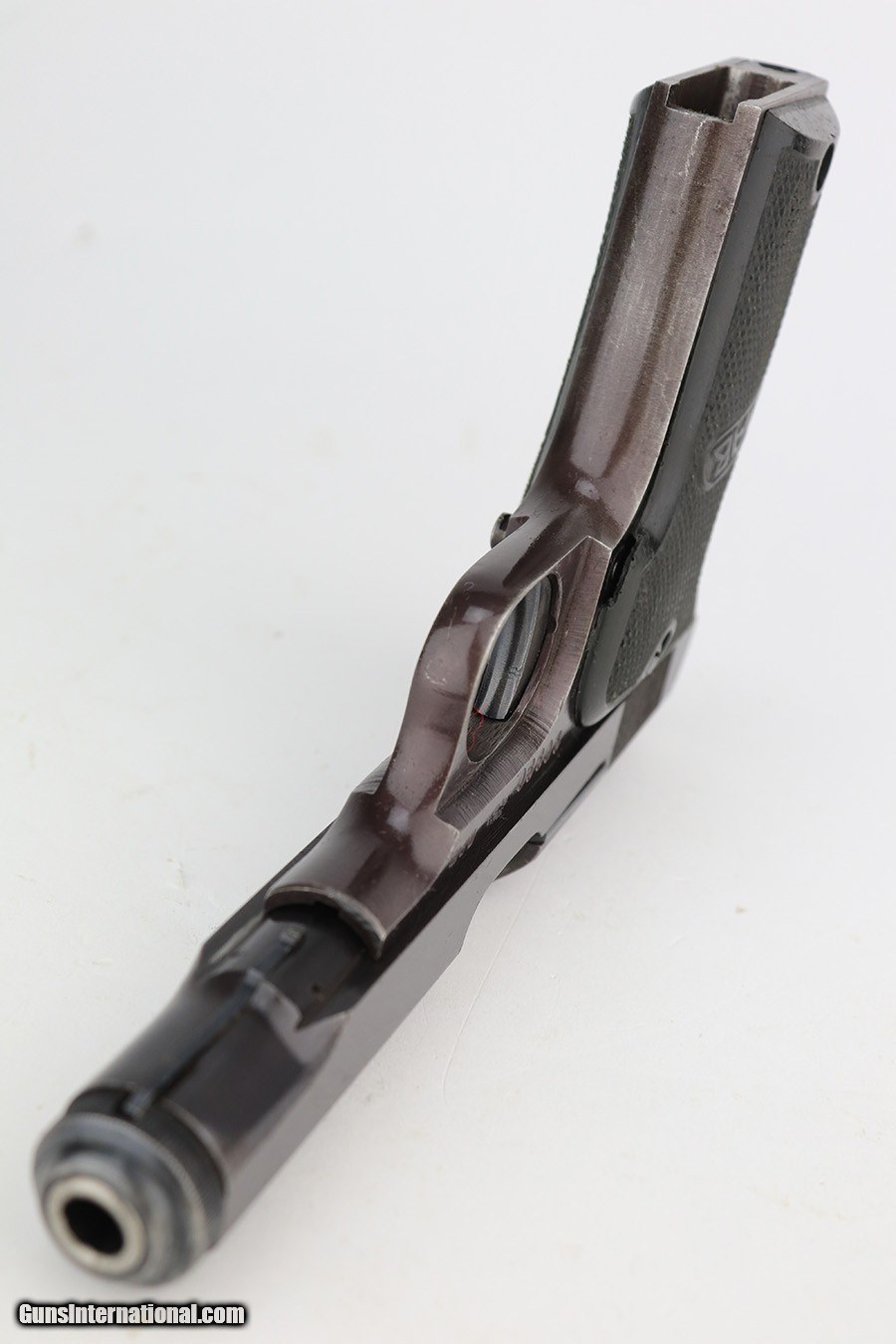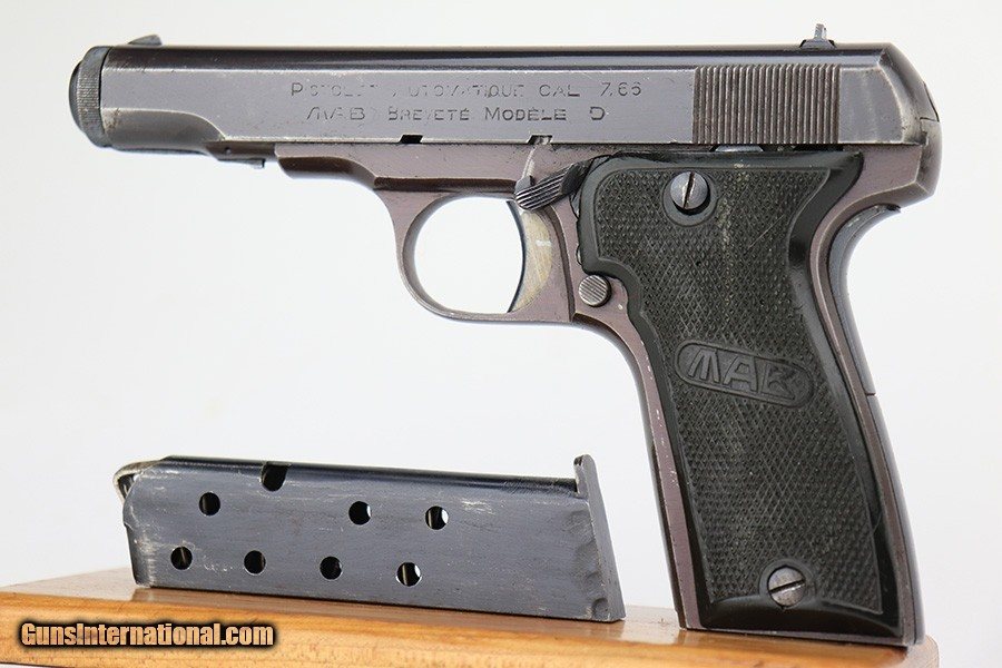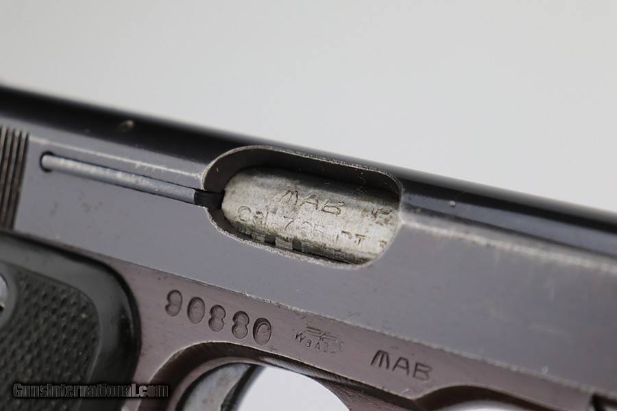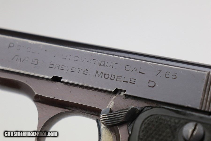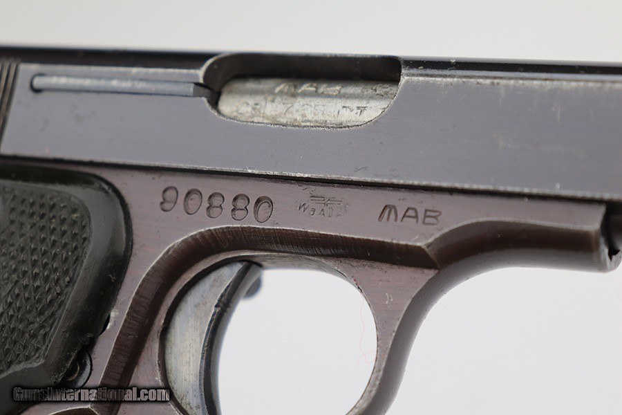 Description: This is an excellent example of a French MAB Model D issued to the Nazi military during WW2. It is all matching and has the proper "Waffen D20" Nazi military acceptance proof on the right side of the frame. It has retained about 96-97% of its original finish. The frame has a really nice plum tint to it. There is very minor thinning on the front strap and very minor wear on the high edges in general. Fitted with black plastic grips and comes with one magazine. Mint bore. SOLD Curio/Relic: Yes Handgun Caliber: 7.65x22mm Parabellum (7.65x22mm Luger, .30 Luger) |
