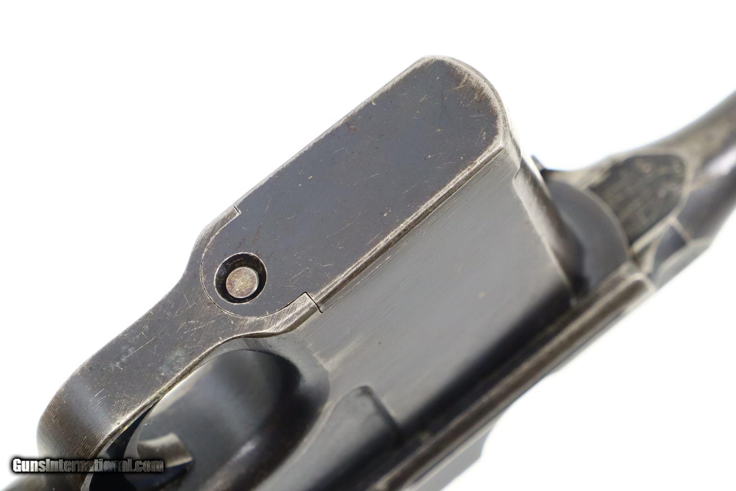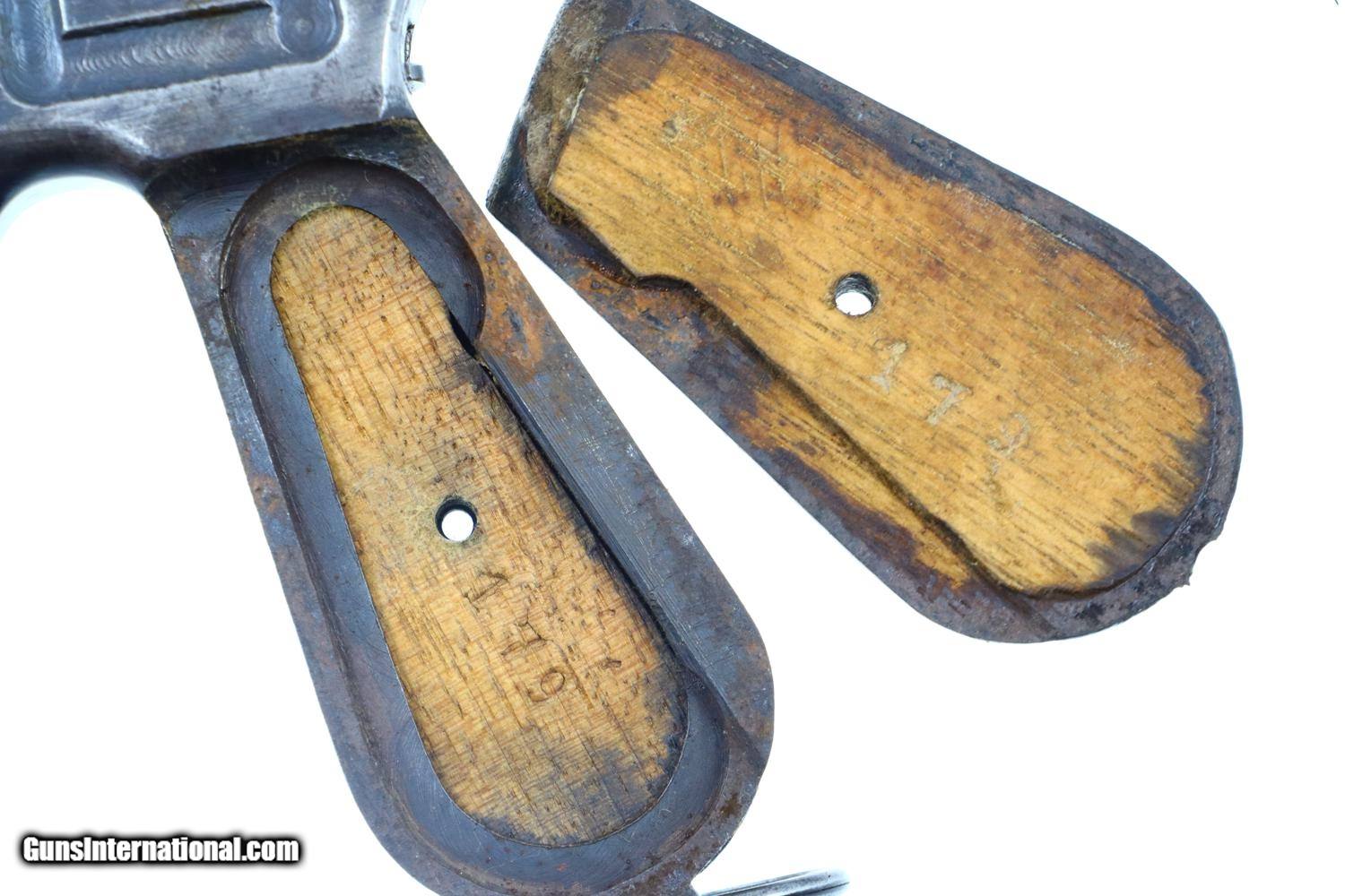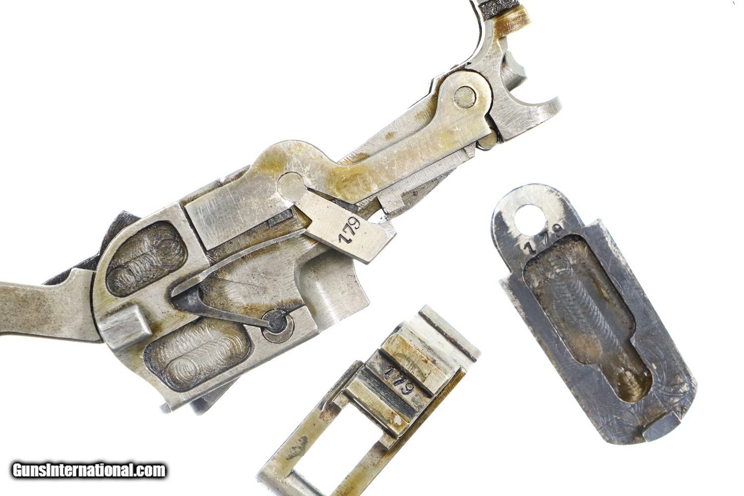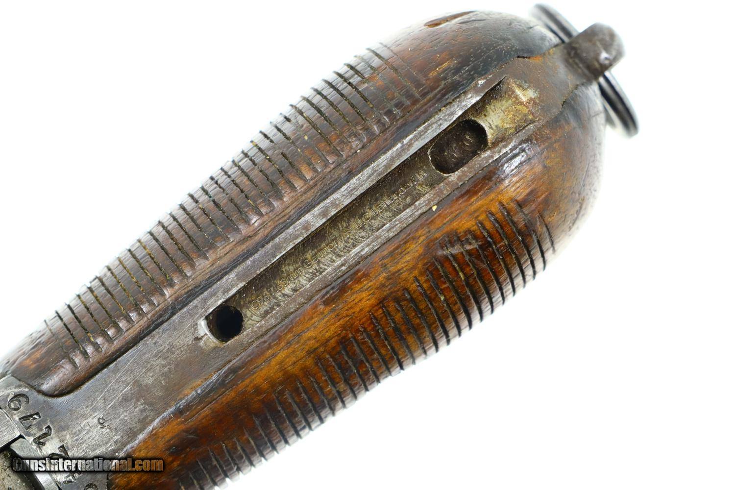 Description: Synopsis: Mauser, C96, WWI, Standard Wartime Commercial Pistol, Military accepted, 7.63mm, 342179, FB00829 Description: Wartime Standard Commercial C96 caliber 7.63mm with 5.5" barrel, fixed front sight, and slip-in 50-1000 rear sight. Short extractor, two lug firing pin, SR hammer. Mauser address on top of chamber, full serial number on left chamber flat. C/C/U on left side of barrel extension; Imperial acceptance on right side. Two line Mauser address on right side of frame. Serrated walnut grips, lanyard ring present. Disassembly shows all matching serial numbers including the grips. Condition: VG original finish with thinning and patchy discoloration as one might expect from a pistol that has been used through much of WWI. Comparable condition fire blued parts with extensive fading over cusor and bolt stop, none showing any suggestion of enhancement. Dark oil soaked grips with scattered handling marks and blunted serrations. Dull etched bore with easily discernable rifling. Correct manual mechanics. A nice representative C96 that was used by German Military in WWI. ~~Insured shipping fee of $55; most packages shipped using FedEx 2nd Day.~~ SOLD Curio/Relic: Yes Manufacturer: Mauser Serial Number: 342179 Caliber Info: 7.63mm |