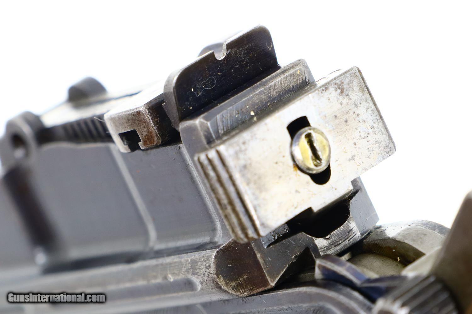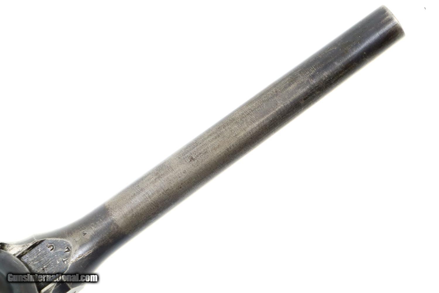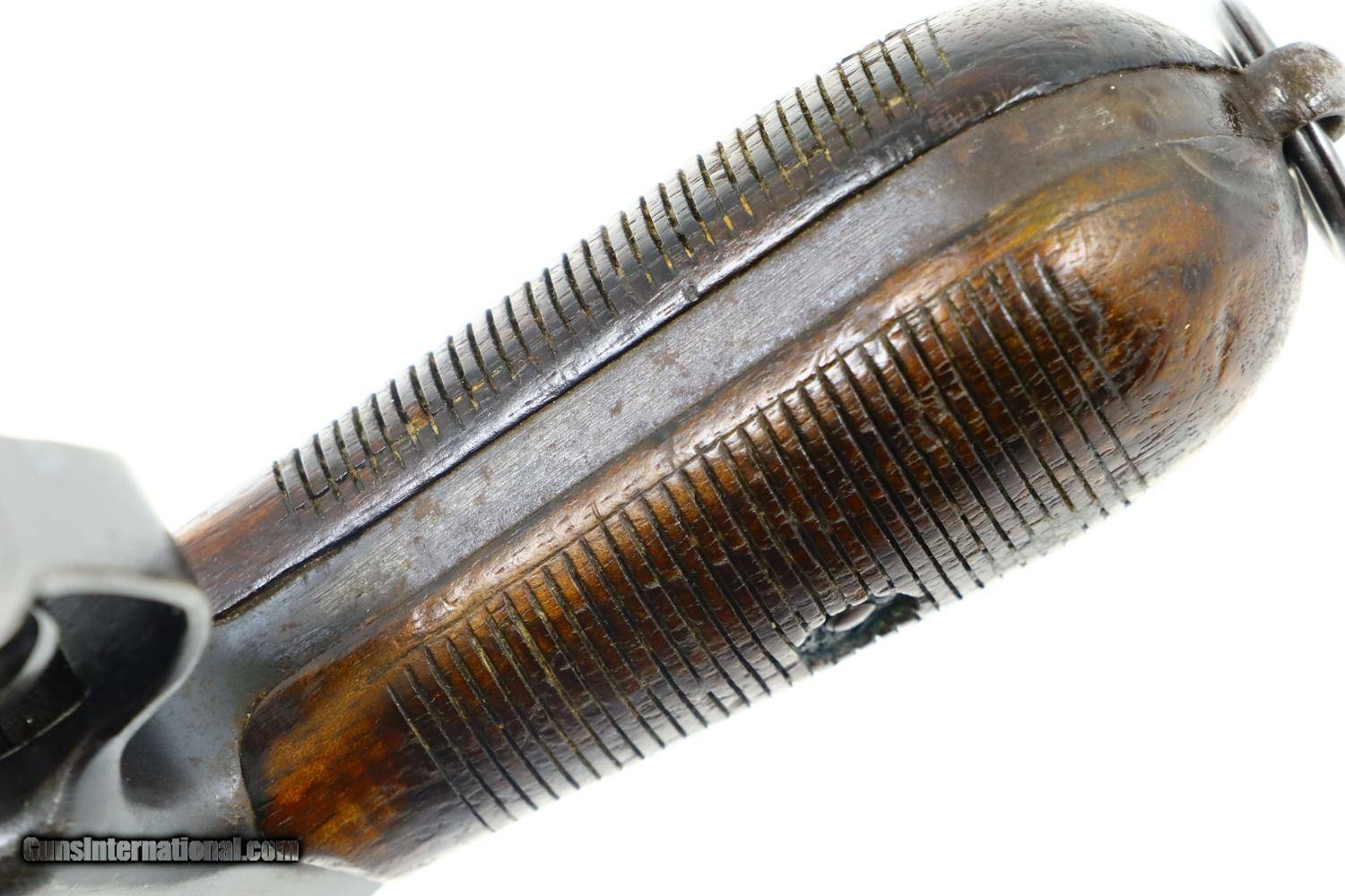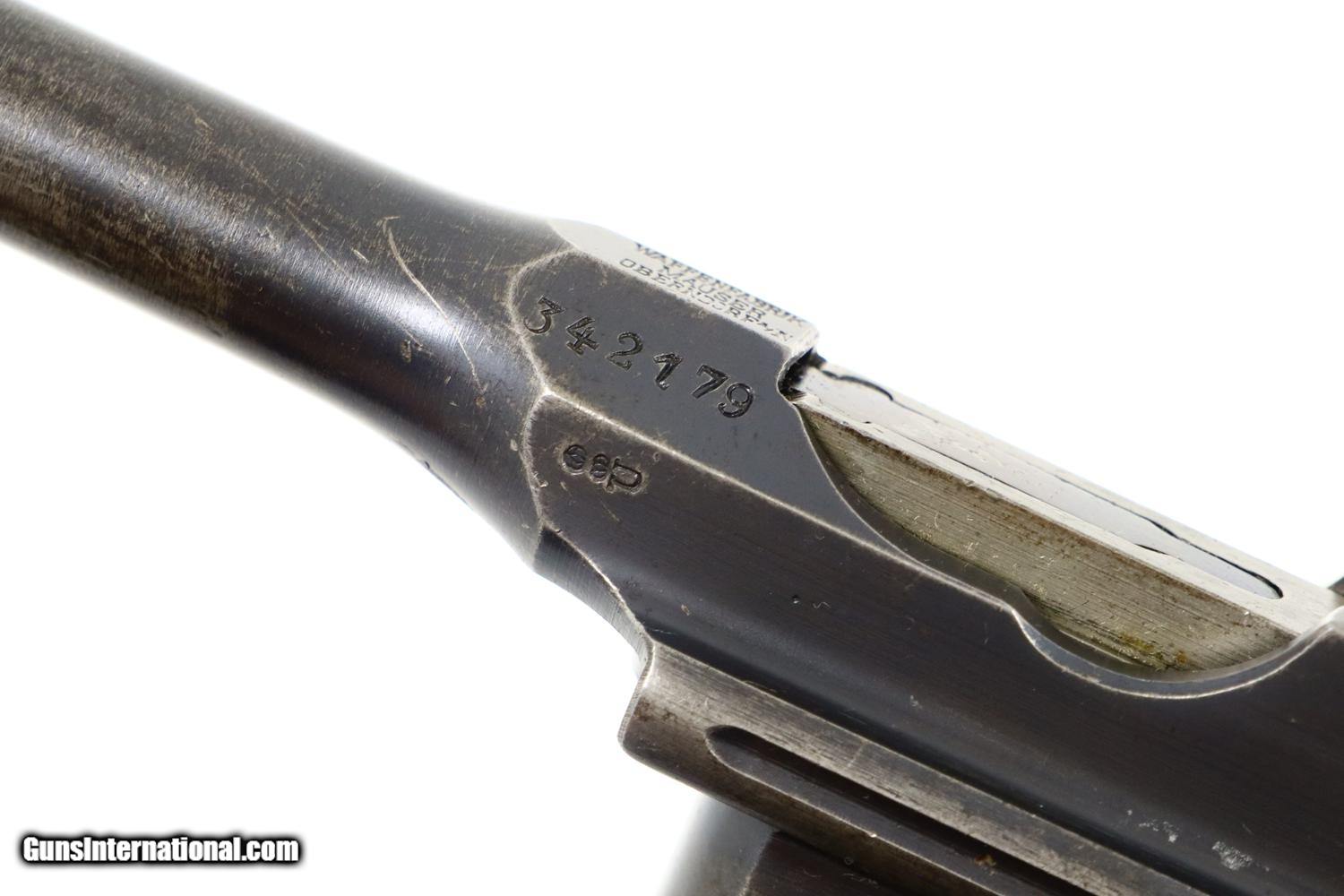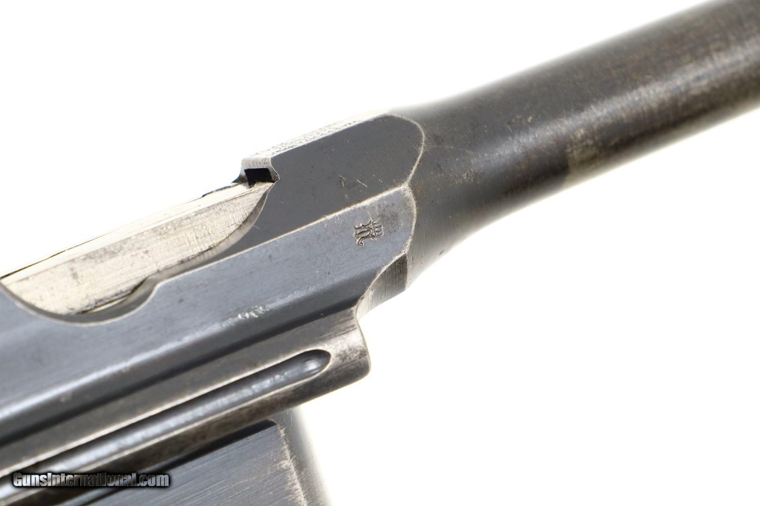 Description: Synopsis: Mauser, C96, WWI, Standard Wartime Commercial Pistol, Military accepted, 7.63mm, 342179, FB00829 Description: Wartime Standard Commercial C96 caliber 7.63mm with 5.5" barrel, fixed front sight, and slip-in 50-1000 rear sight. Short extractor, two lug firing pin, SR hammer. Mauser address on top of chamber, full serial number on left chamber flat. C/C/U on left side of barrel extension; Imperial acceptance on right side. Two line Mauser address on right side of frame. Serrated walnut grips, lanyard ring present. Disassembly shows all matching serial numbers including the grips. Condition: VG original finish with thinning and patchy discoloration as one might expect from a pistol that has been used through much of WWI. Comparable condition fire blued parts with extensive fading over cusor and bolt stop, none showing any suggestion of enhancement. Dark oil soaked grips with scattered handling marks and blunted serrations. Dull etched bore with easily discernable rifling. Correct manual mechanics. A nice representative C96 that was used by German Military in WWI. ~~Insured shipping fee of $55; most packages shipped using FedEx 2nd Day.~~ SOLD Curio/Relic: Yes Manufacturer: Mauser Serial Number: 342179 Caliber Info: 7.63mm |