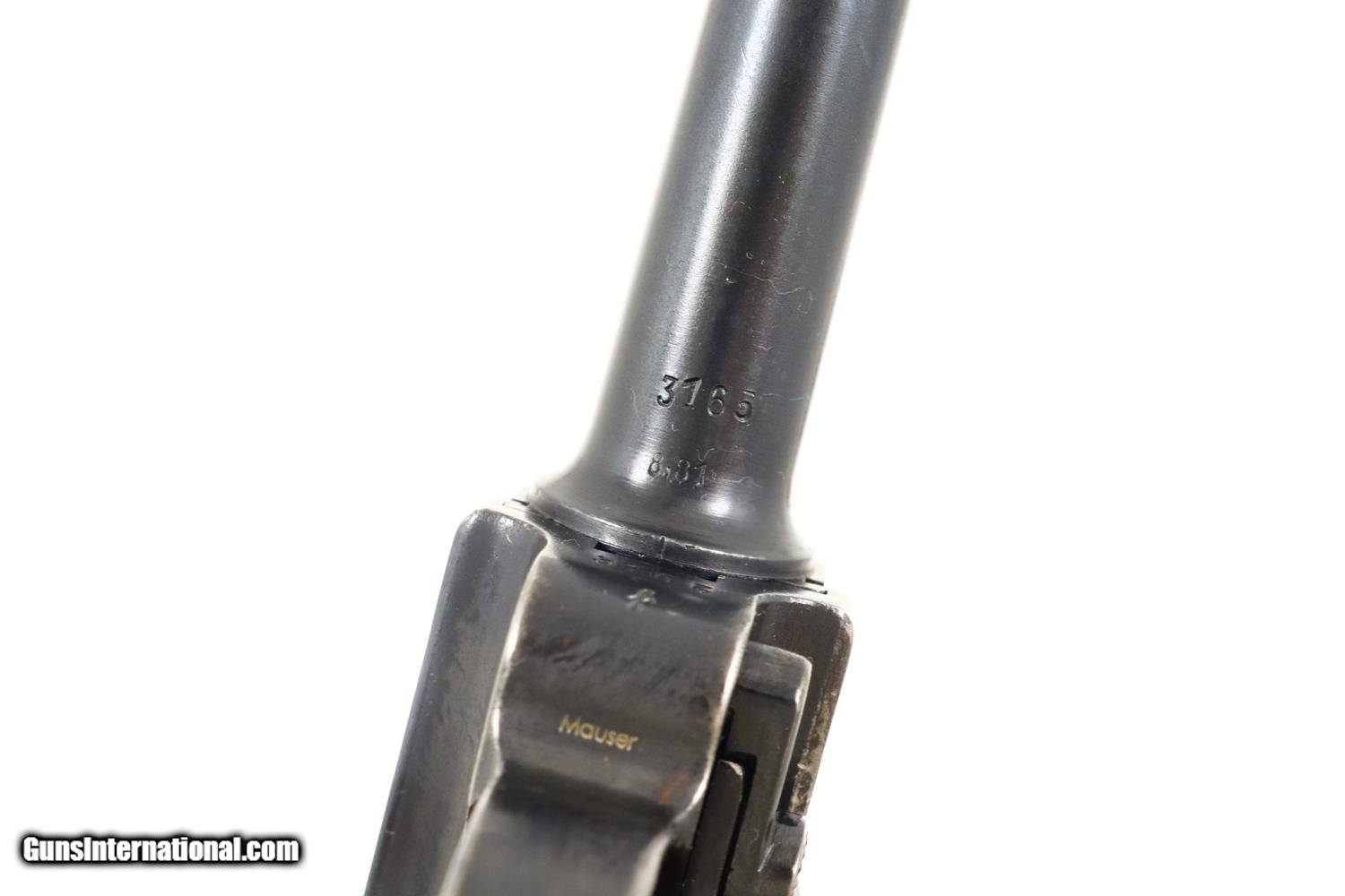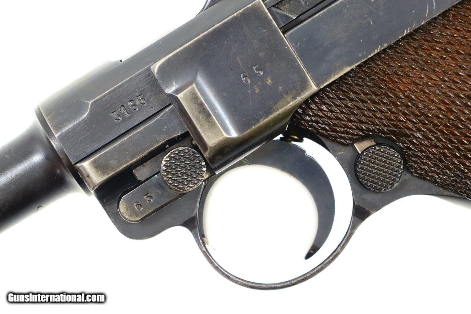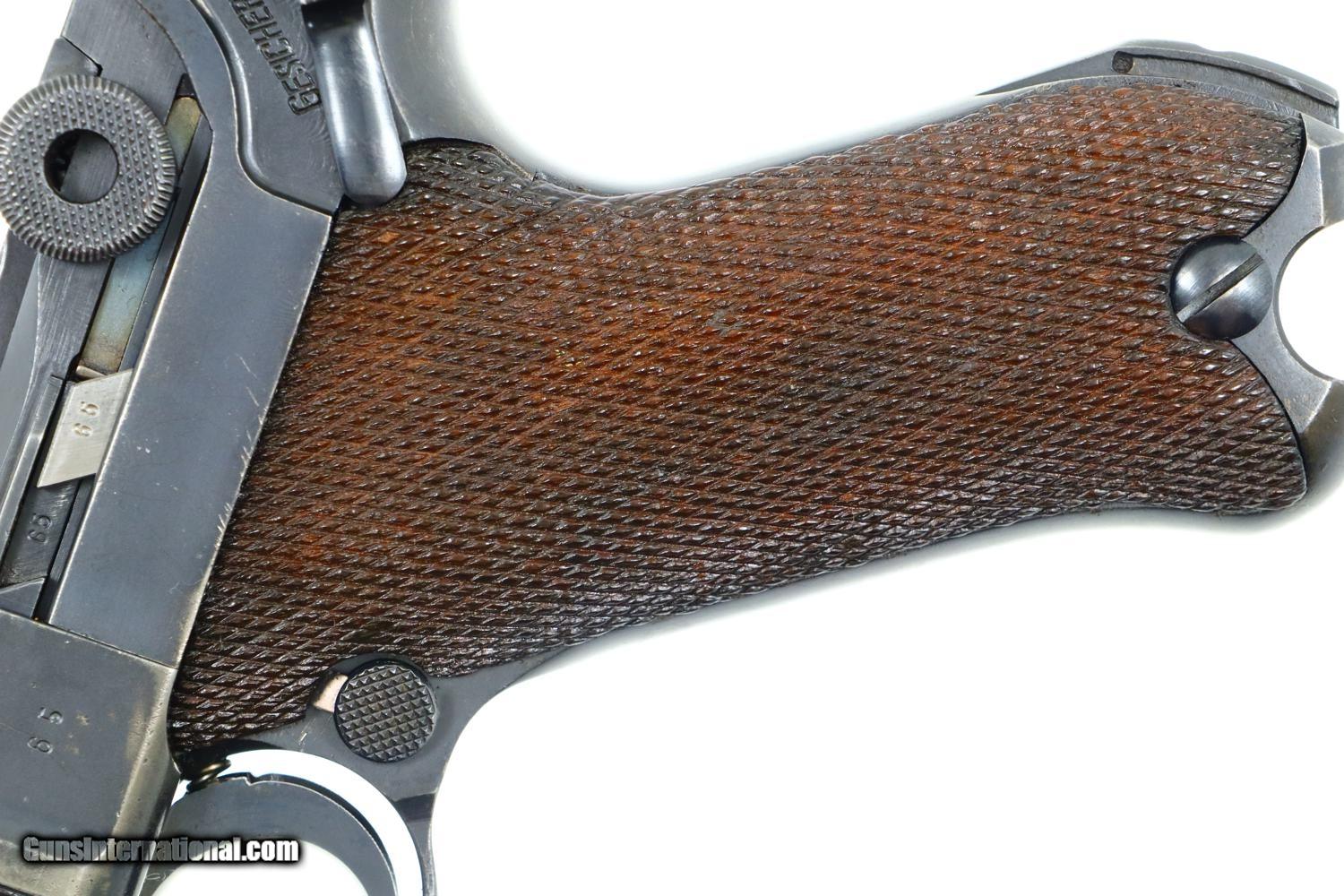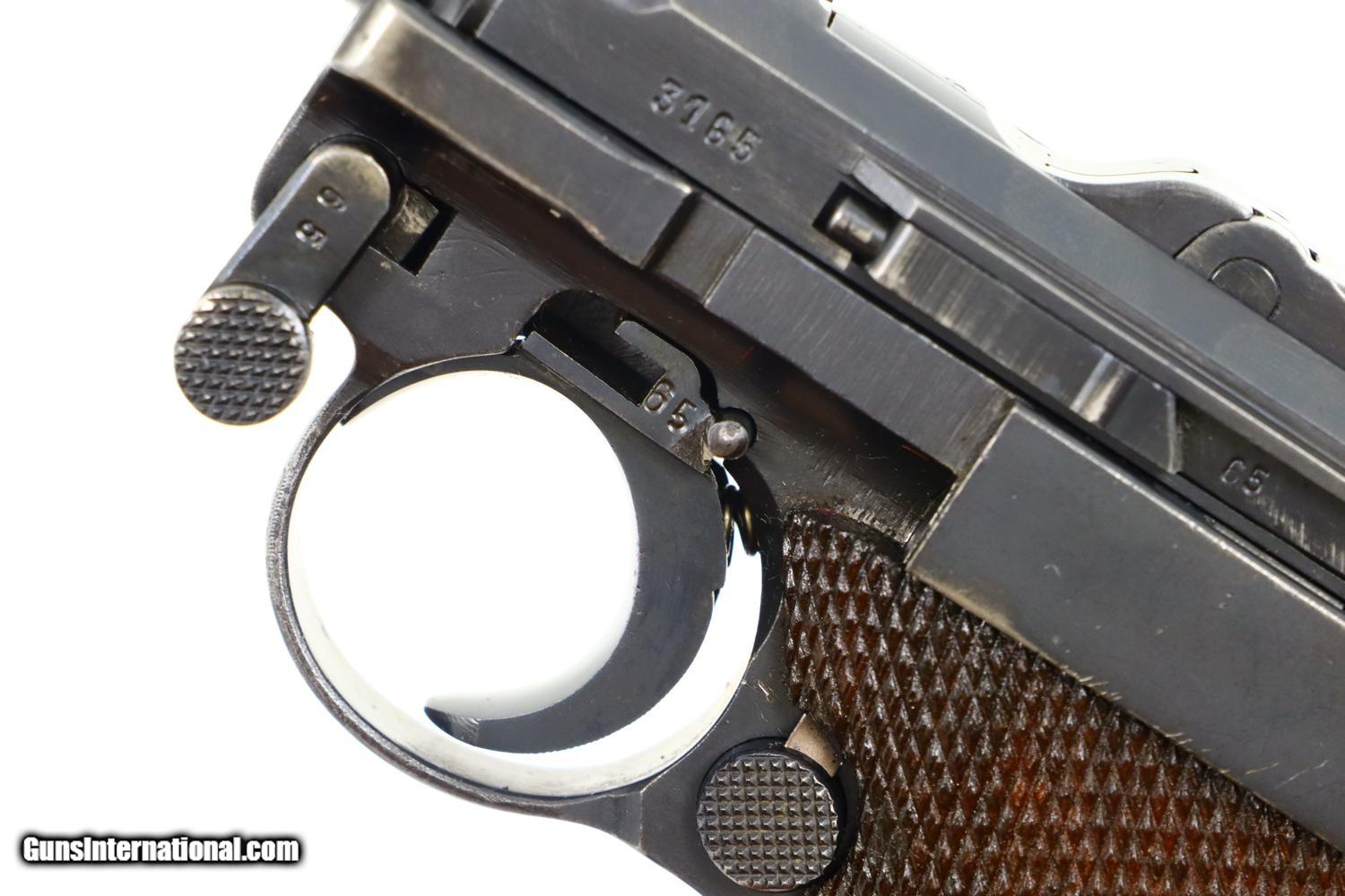Description: Synopsis: Mauser, P08, S42 code, German Luger, 3165f, FB00784 Description: Attractive and all matching Mauser G date Luger, made 1935, 9mmP, SN: 3165f. Standard configuration military Luger with 4” barrel having drift adjustable front sight and fixed "V" notch rear sight. G chamber marking, middle toggle link marked with S/42 code. Full serial number with letter suffix on front of frame with the serial number repeated under the barrel and on left side of receiver. Usual Waffenamt acceptances on right side of receiver. Disassembly shows all matching numbers except for an unnumbered rear toggle pin and a Police magazine whose aluminum base is marked with an enlarged “2/1536/E/L”. Condition: G-VG arsenal reworked dip salt blue that was equally applied to all the small parts that were originally strawed or fire blue. Near excellent grips with dark oil staining and lightly blunted checkering. VG-EXC Magazine with crisp markings on plug. Bright bore, lightly etched with shallow rifling. Perfect manual mechanics. A nice representative G date whose appearance could be easily improved by the proper heat treatment of the small parts. ~~Insured shipping fee of $65; most packages shipped using FedEx 2nd Day.~~ SOLD Curio/Relic: Yes Manufacturer: Mauser Serial Number: 3165f Caliber Info: 9mmP |