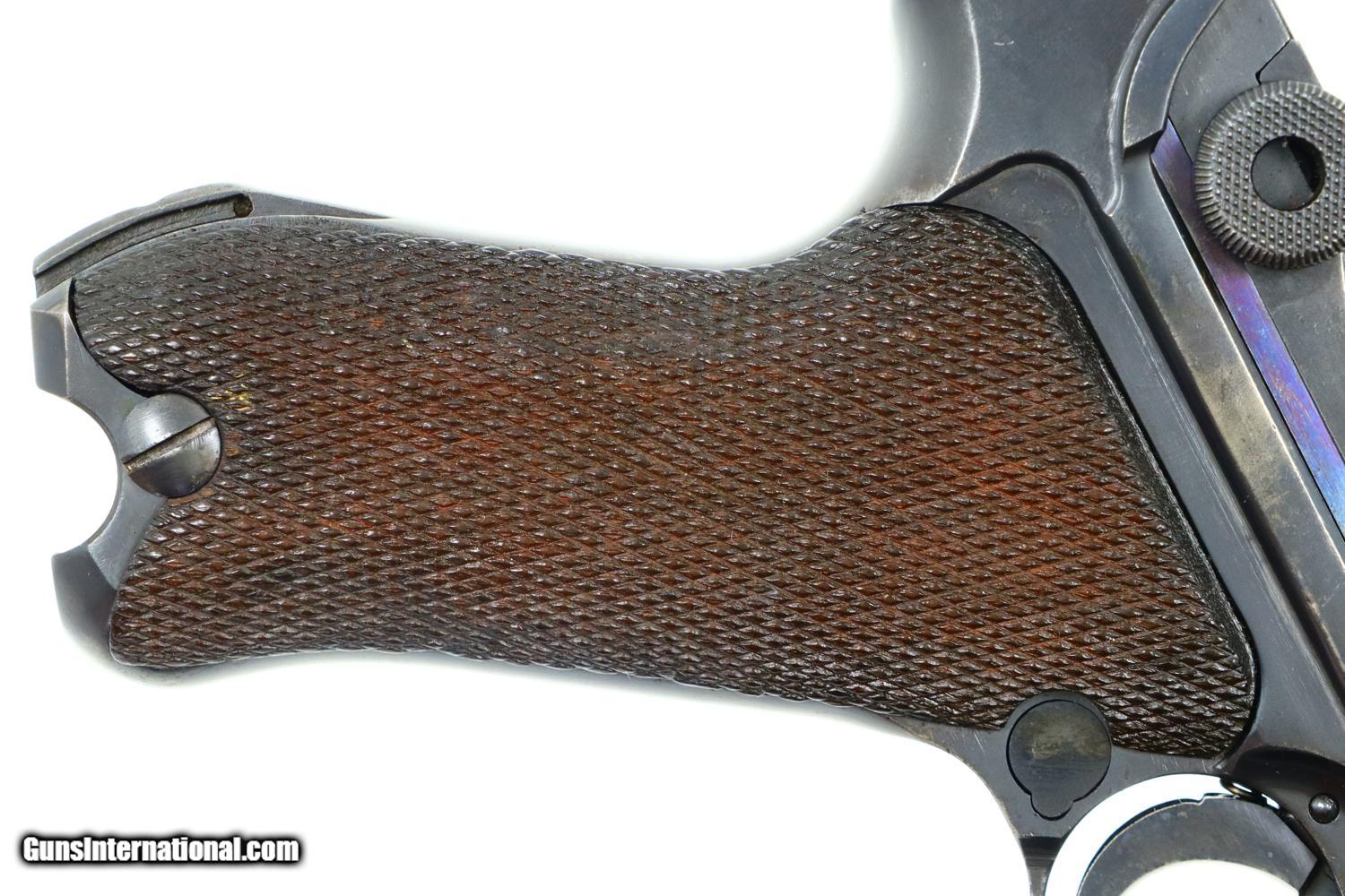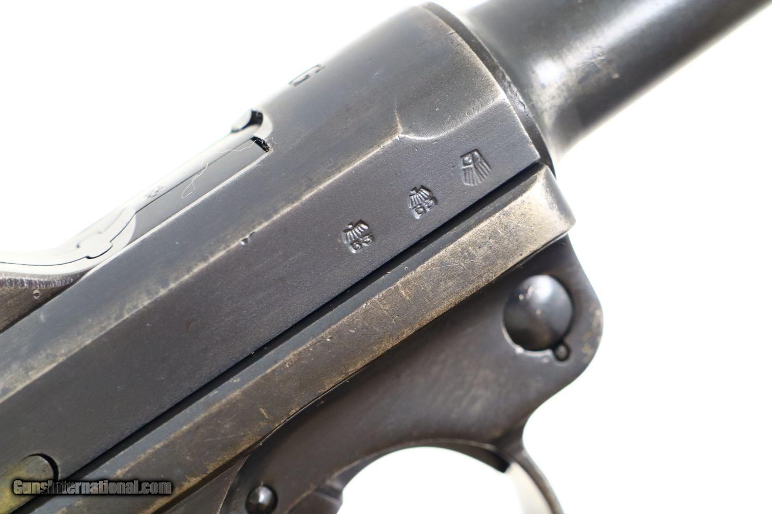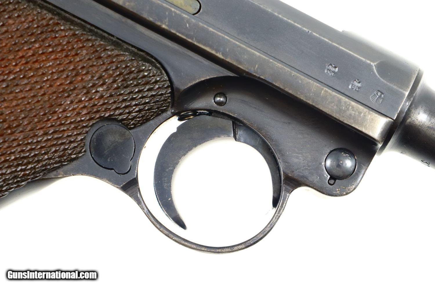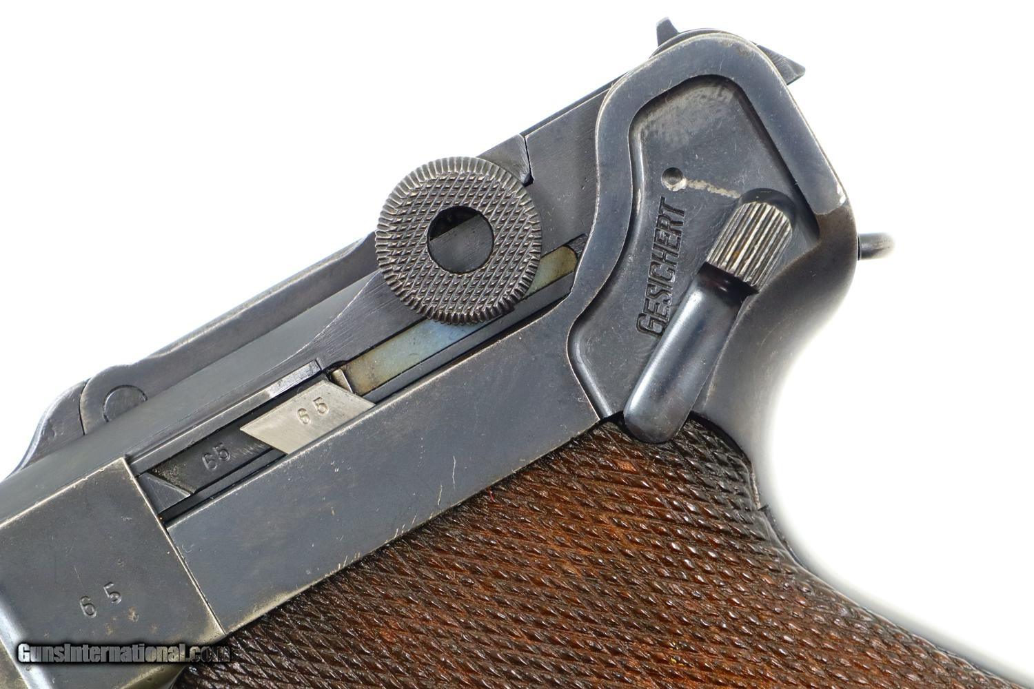 Description: Synopsis: Mauser, P08, S42 code, German Luger, 3165f, FB00784 Description: Attractive and all matching Mauser G date Luger, made 1935, 9mmP, SN: 3165f. Standard configuration military Luger with 4” barrel having drift adjustable front sight and fixed "V" notch rear sight. G chamber marking, middle toggle link marked with S/42 code. Full serial number with letter suffix on front of frame with the serial number repeated under the barrel and on left side of receiver. Usual Waffenamt acceptances on right side of receiver. Disassembly shows all matching numbers except for an unnumbered rear toggle pin and a Police magazine whose aluminum base is marked with an enlarged “2/1536/E/L”. Condition: G-VG arsenal reworked dip salt blue that was equally applied to all the small parts that were originally strawed or fire blue. Near excellent grips with dark oil staining and lightly blunted checkering. VG-EXC Magazine with crisp markings on plug. Bright bore, lightly etched with shallow rifling. Perfect manual mechanics. A nice representative G date whose appearance could be easily improved by the proper heat treatment of the small parts. ~~Insured shipping fee of $65; most packages shipped using FedEx 2nd Day.~~ SOLD Curio/Relic: Yes Manufacturer: Mauser Serial Number: 3165f Caliber Info: 9mmP |
