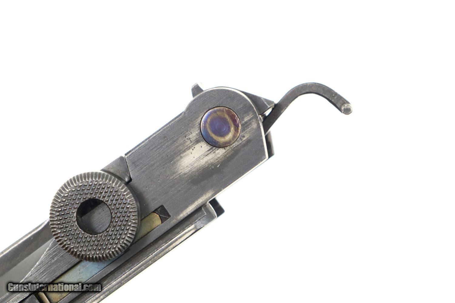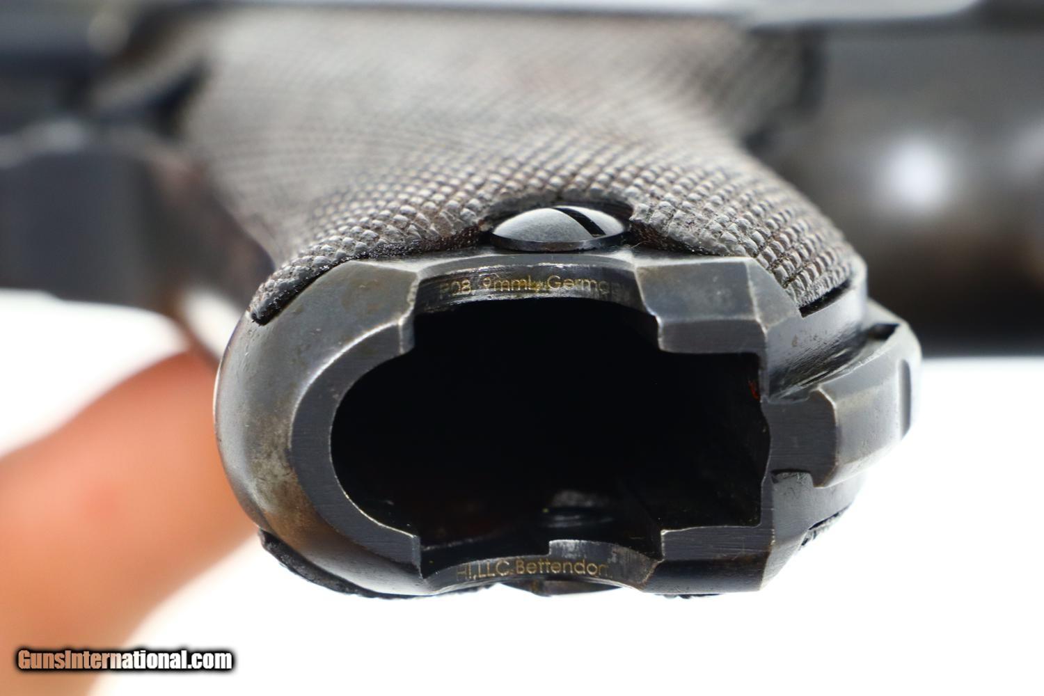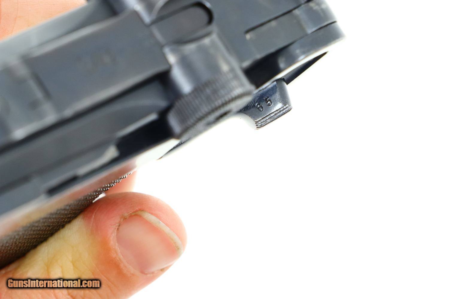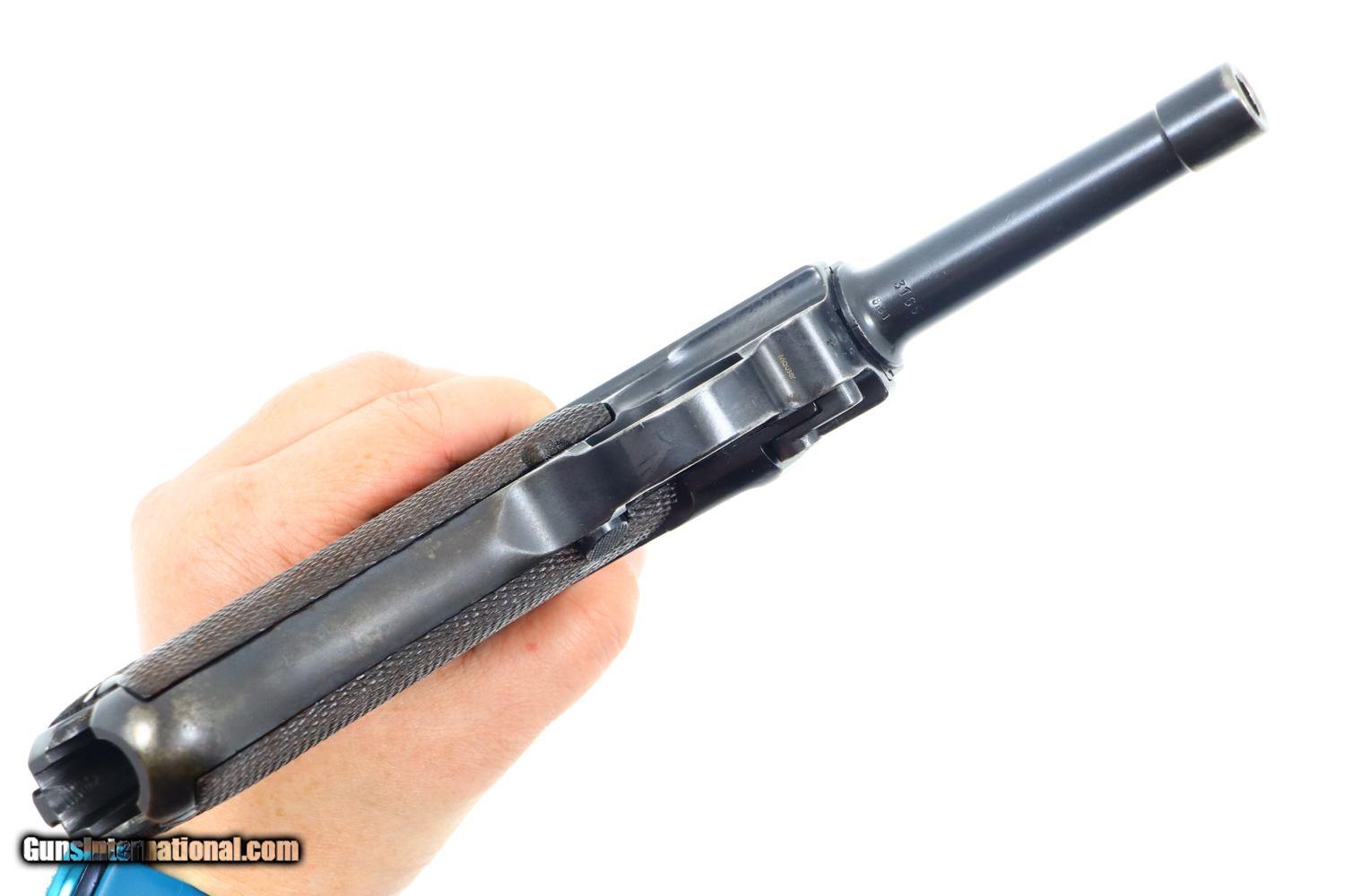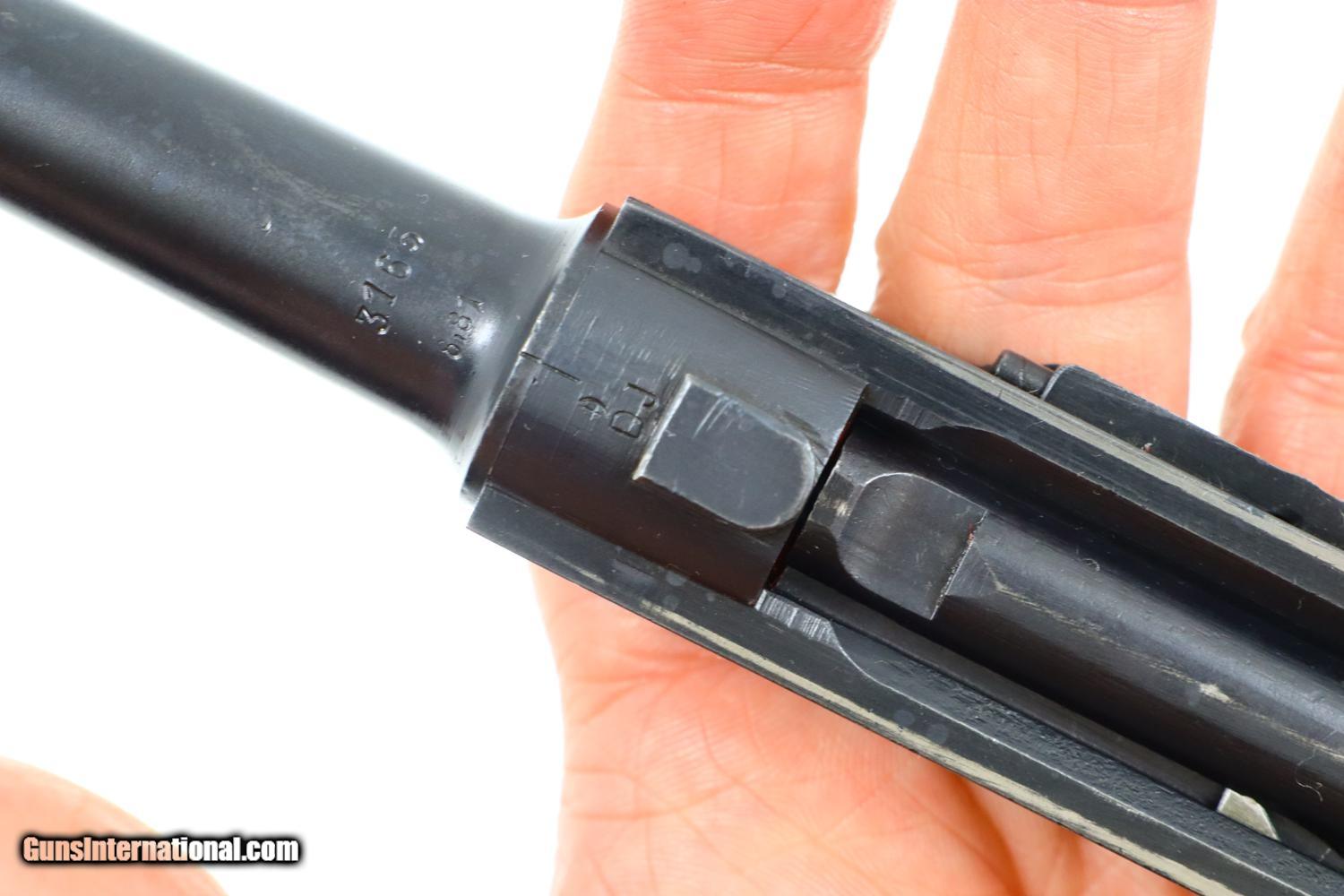 Description: Synopsis: Mauser, P08, S42 code, German Luger, 3165f, FB00784 Description: Attractive and all matching Mauser G date Luger, made 1935, 9mmP, SN: 3165f. Standard configuration military Luger with 4” barrel having drift adjustable front sight and fixed "V" notch rear sight. G chamber marking, middle toggle link marked with S/42 code. Full serial number with letter suffix on front of frame with the serial number repeated under the barrel and on left side of receiver. Usual Waffenamt acceptances on right side of receiver. Disassembly shows all matching numbers except for an unnumbered rear toggle pin and a Police magazine whose aluminum base is marked with an enlarged “2/1536/E/L”. Condition: G-VG arsenal reworked dip salt blue that was equally applied to all the small parts that were originally strawed or fire blue. Near excellent grips with dark oil staining and lightly blunted checkering. VG-EXC Magazine with crisp markings on plug. Bright bore, lightly etched with shallow rifling. Perfect manual mechanics. A nice representative G date whose appearance could be easily improved by the proper heat treatment of the small parts. ~~Insured shipping fee of $65; most packages shipped using FedEx 2nd Day.~~ SOLD Curio/Relic: Yes Manufacturer: Mauser Serial Number: 3165f Caliber Info: 9mmP |