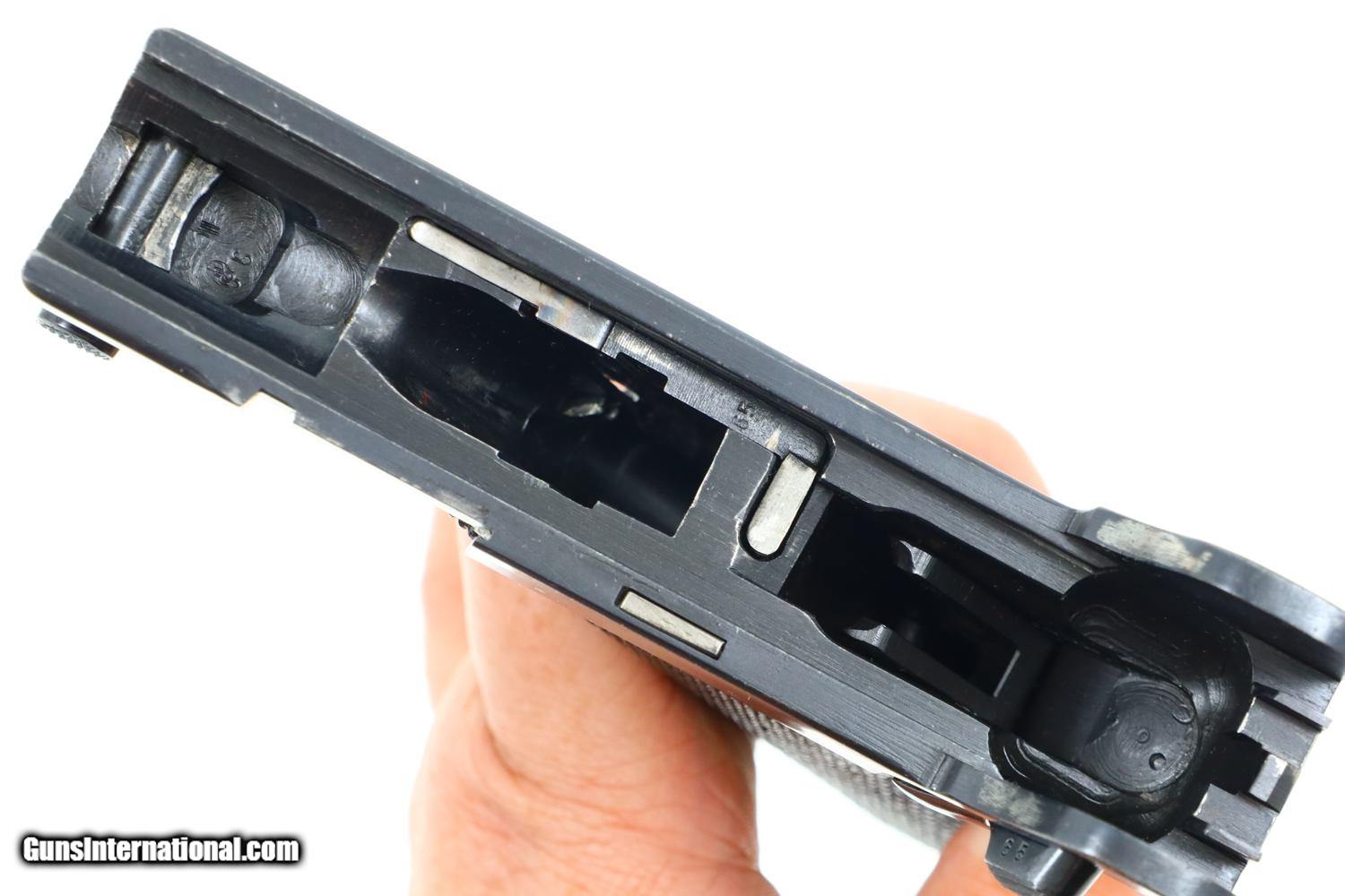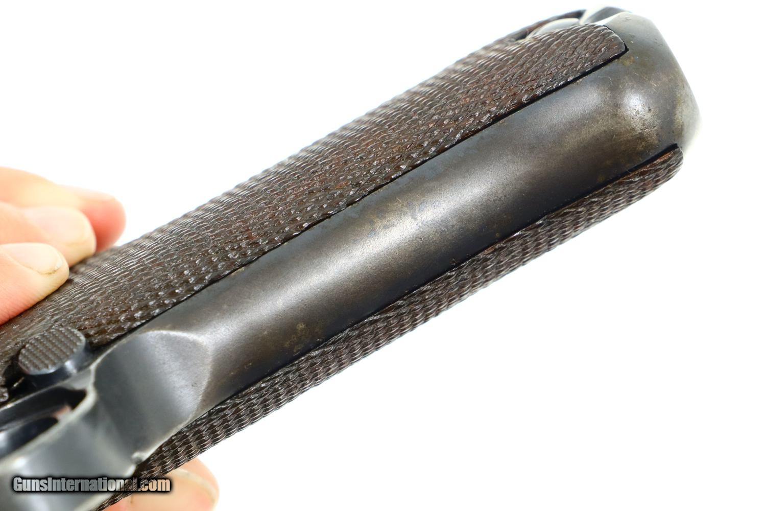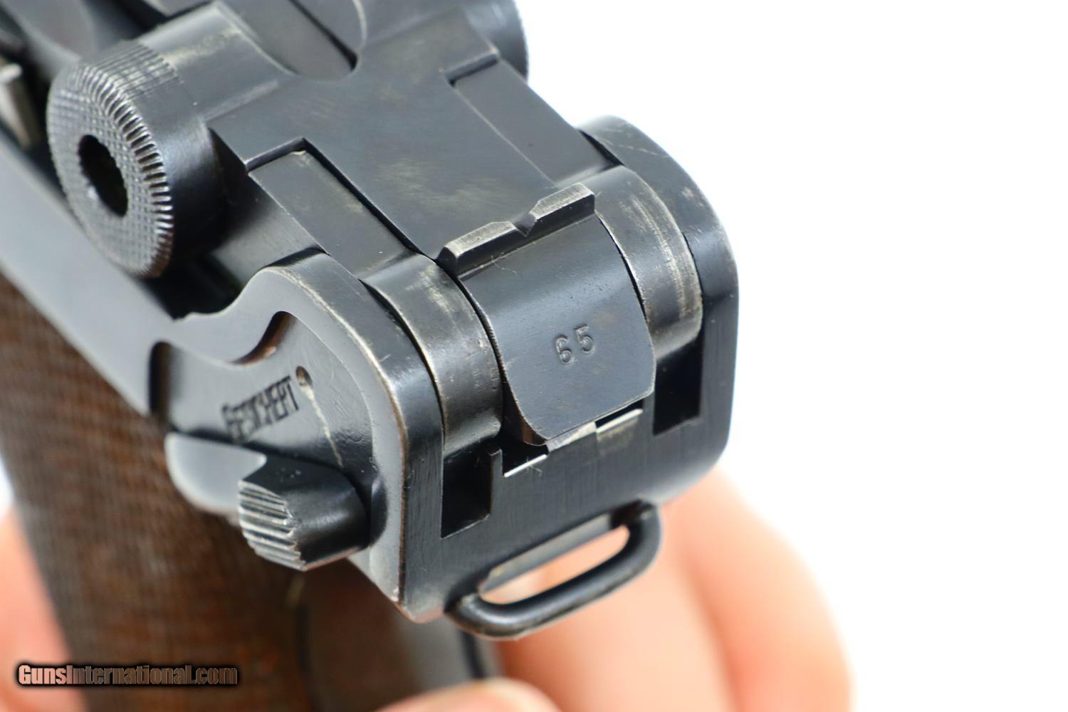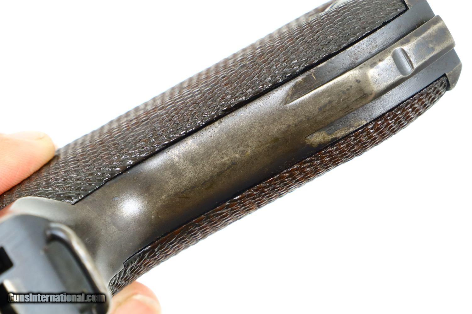 Description: Synopsis: Mauser, P08, S42 code, German Luger, 3165f, FB00784 Description: Attractive and all matching Mauser G date Luger, made 1935, 9mmP, SN: 3165f. Standard configuration military Luger with 4” barrel having drift adjustable front sight and fixed "V" notch rear sight. G chamber marking, middle toggle link marked with S/42 code. Full serial number with letter suffix on front of frame with the serial number repeated under the barrel and on left side of receiver. Usual Waffenamt acceptances on right side of receiver. Disassembly shows all matching numbers except for an unnumbered rear toggle pin and a Police magazine whose aluminum base is marked with an enlarged “2/1536/E/L”. Condition: G-VG arsenal reworked dip salt blue that was equally applied to all the small parts that were originally strawed or fire blue. Near excellent grips with dark oil staining and lightly blunted checkering. VG-EXC Magazine with crisp markings on plug. Bright bore, lightly etched with shallow rifling. Perfect manual mechanics. A nice representative G date whose appearance could be easily improved by the proper heat treatment of the small parts. ~~Insured shipping fee of $65; most packages shipped using FedEx 2nd Day.~~ SOLD Curio/Relic: Yes Manufacturer: Mauser Serial Number: 3165f Caliber Info: 9mmP |