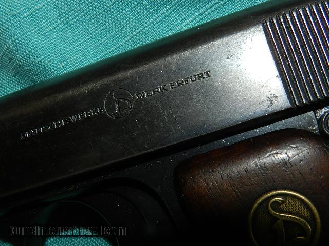 Description: This pistol has a crown over N proof mark, made in post WWI Germany. Finish is 80% original thinning blue, with very good European walnut factory wood grips, and a factory nickle plated mag. Functions very well, and has an excellent, clean bore. Haven't seen on this nice in a long time. Gun works well and would make a good carry gun. We don’t have asite .I prefer money orders or a check. Item ships when funds come in. If you can only pay with a card let me know. I hope you like my wide selection of unusual guns, knives and gun parts. Shipping price determined by zip code. I try to keep the prices affordable, which means I make less money than most dealers. You won’t get altitude sickness with my prices! I consistently have the best selection of older guns If you BUY IT NOW you must still contact us for details buy it now doesn't end the sale, it just sends an email telling us you want to buy this gun. A phone call won’t secure a sale! Not home many times, the first buyer by email buys the gun !Thissite doesnot close down a sale when you do a BUY IT NOW like Ebay!I can get six buy it nows in an hour, first buyer to email gets the guns, others are in second place! Best to send another email . Sometimes not home to get calls. Some guns are required shipment to a gun dealer near you for a transfer to you when it arrives. With the widest selection of older guns at great prices, We don’t have a store, and sell on the internet only. SOLD Curio/Relic: Yes |