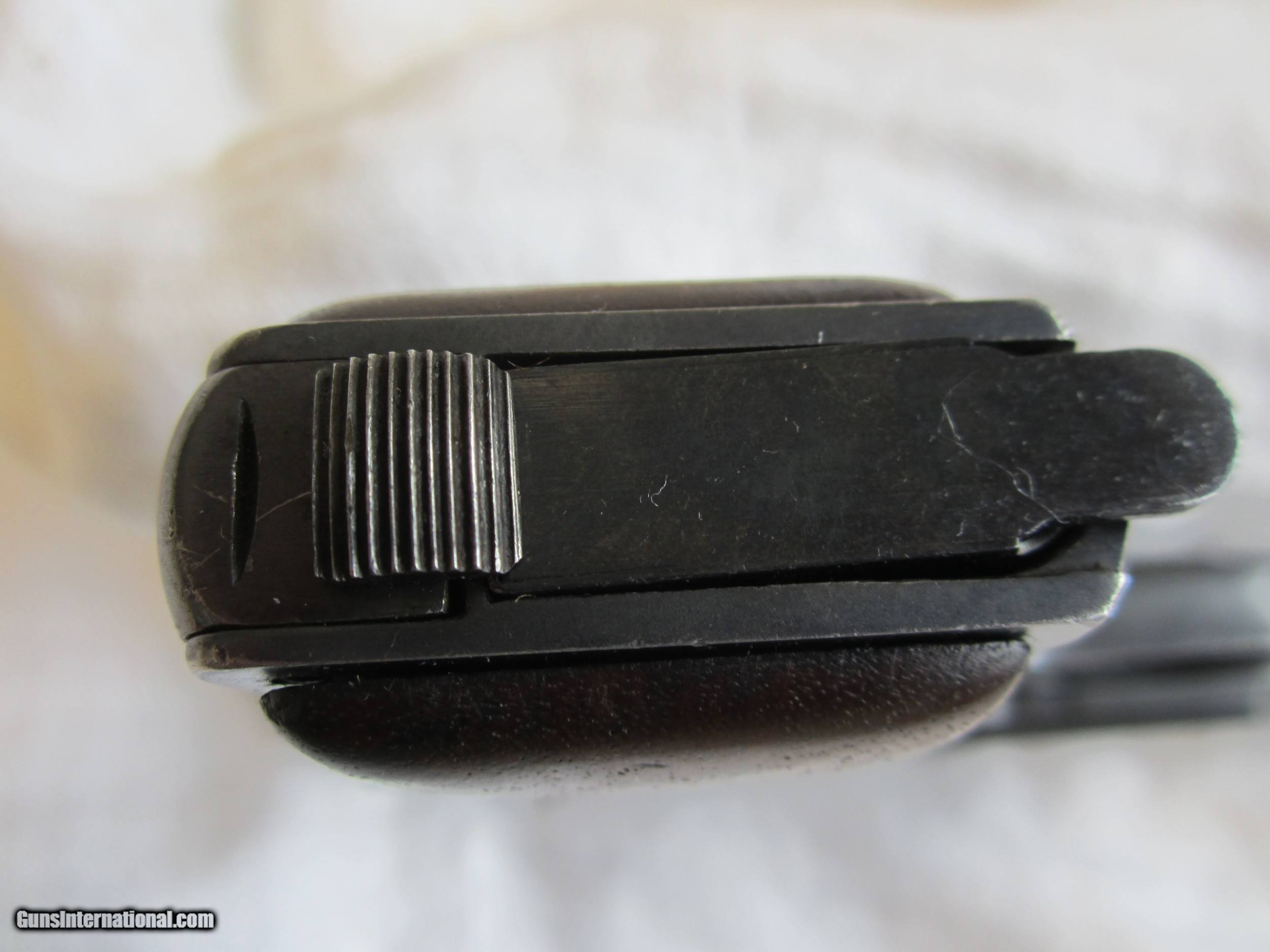 Description: This is a nice pocket size .32 caliber (7.65 mm) semi automatic pistol made in Germany, and exhibting typical German quality. It was designed in Belgium and first made (in Germany) in 1920, after WW II by Heinrich Ortgies & Co. of Erfurt, Germany. They were made until the mid 1940's and many (including this one) were exported to the United States in the 1920's and 1930's. It is hammerless and has a grip safety. The magazine holds 7 rounds. After 1921 these pistols were made by Deutsche Werke in Erfurt, Germany. There is a 6.35mm version which is not as popular or desireable and has a lower value. This pistol has seen little use. It was in the prior owners family for over 50 years and kept merely for home security purposes. A NO interest payment plan is available. SOLD Curio/Relic: Yes Manufacturer: Deutsche Werke in Erfurt, Germany Model: ORTGIES Patent- Pocket Pistol Serial Number: 13008 Caliber Info: .32 ACP (7.65mm) Bore: Bright & Shiney- Chambers: --- Ejectors: -- Condition: Very Good + Metal Condition: 92% Blue Wood Condition: Very Good Bore Condition: looks new-rifleing sharp Barrels: one Barrel Type: semi round/semi auto type Action: semi auto Triggers: one Gauge Info: -- Stock: Walnut grips/Medalions Stock Dimensions: -- Finish: Blued Weight: 21 oz. Sights: front & rear + sight groove Manufacture Date: 1921/1930 Engraving: none Item Location: San Diego, California |
