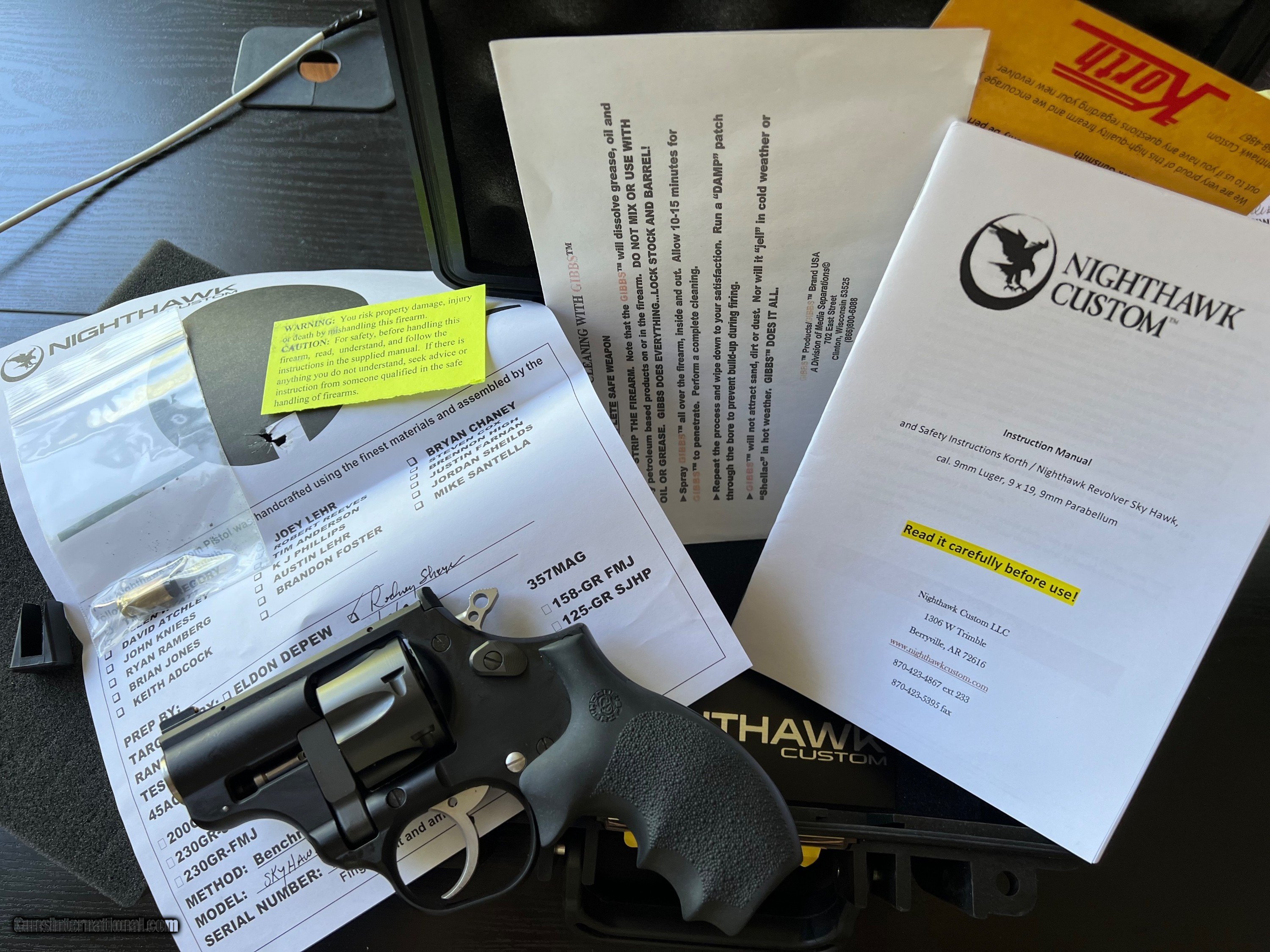 Description: This is one of the most desirable Korth revolvers to come to market in the last 20 years - a Korth-Nighthawk Skyhawk revolver chambered in 9mm Para. The biggest challenge in designing a revolver in 9mm Para is the difficulty in devising an extraction system that would work without the use of moon clips, as the 9mm Para cartridge is a rimless cartridge that sits completely inside the chamber. Korth of Germany was up to task and came up with a proprietary system of small individual extractors, that work in concert to extract all 6 chambers of the cylinder. Korth teamed up with Nighthawk industries to import these Sky Hawk revolvers into the US in 2018-2018. A total of 486 of these guns have been imported and sold in US with no more of these incredible revolvers to be imported in the future! Designed as an ultimate carry revolver, it has a 2 inch barrel and soft rounded lines to prevent snagging on the holster or clothes. The revolver is extremely light weight at 19.4 oz. The double action is like no other revolver action, thanks to the Korth proprietary trigger action and is apparently almost as crisp as the single action. The gun is brand new and unfired in original case, with paperwork and a test target. This is the most diminutive Korth made and is a highly sought after collector item with just a few hundred in existence in US 3-day inspection. FFL required. Please make sure that this gun is legal to own in your state! $100 insured shipping in CONUS SOLD |