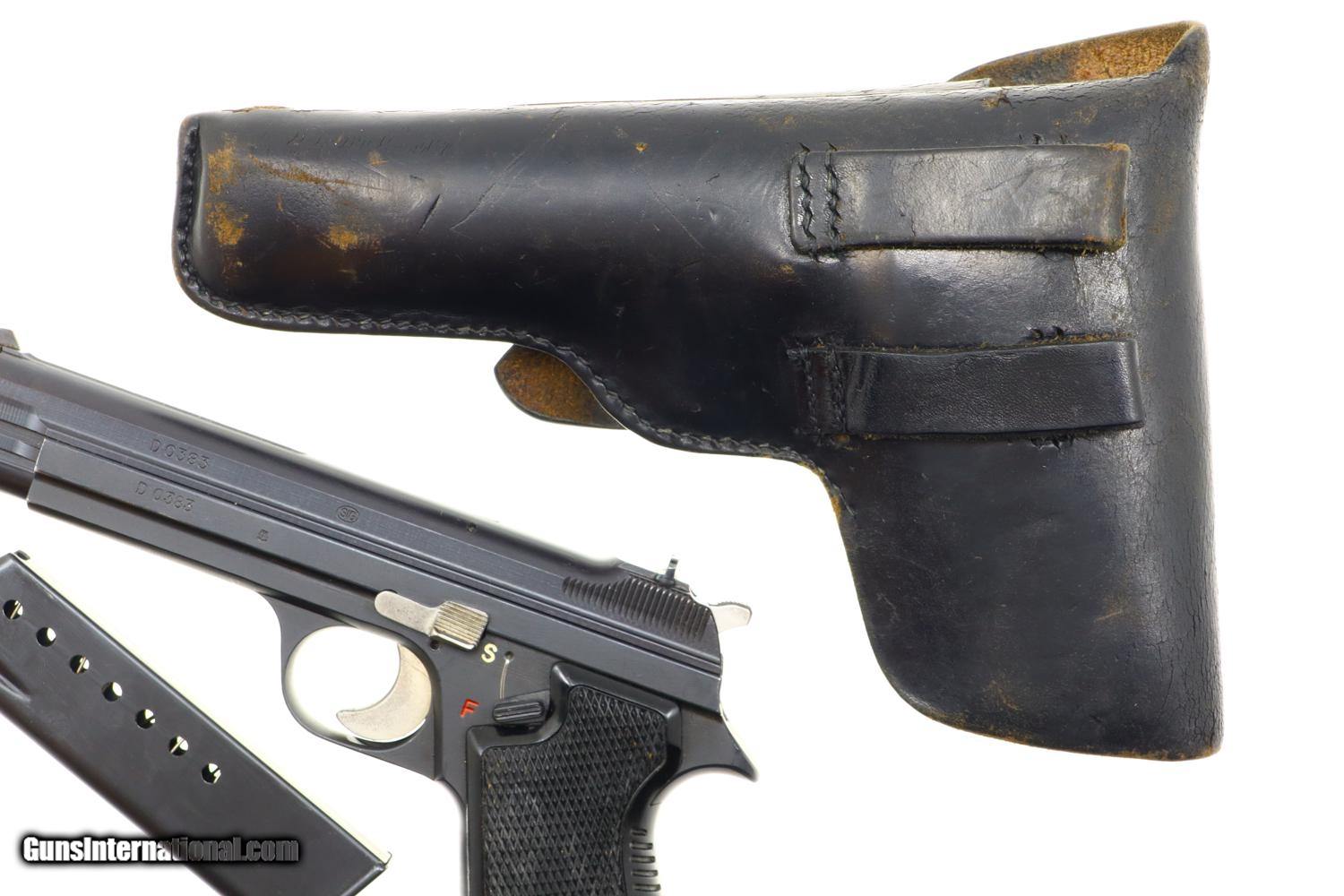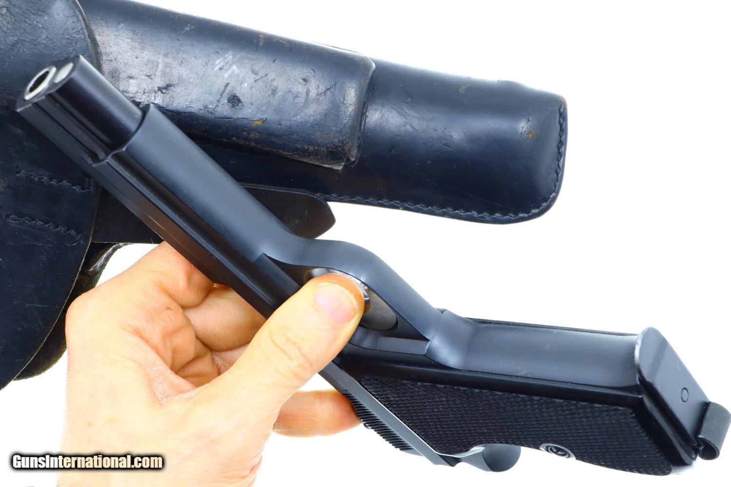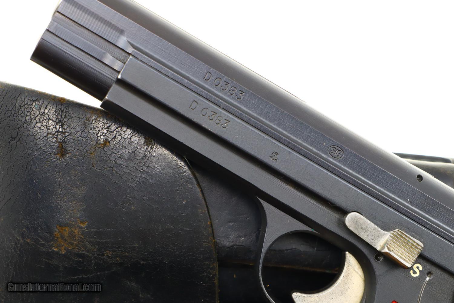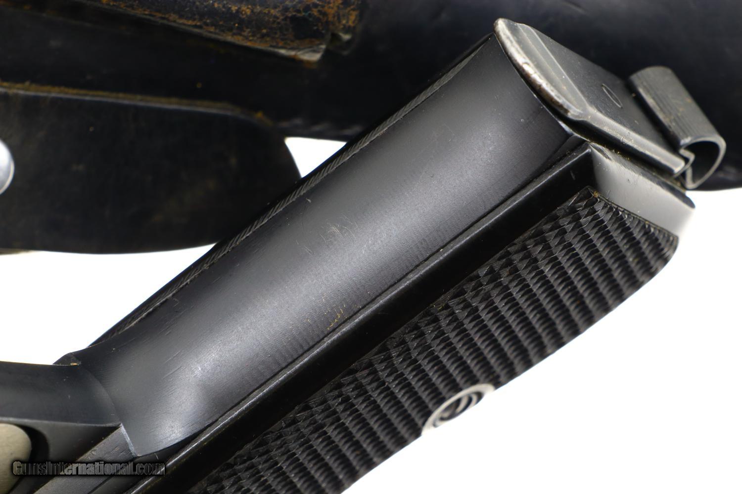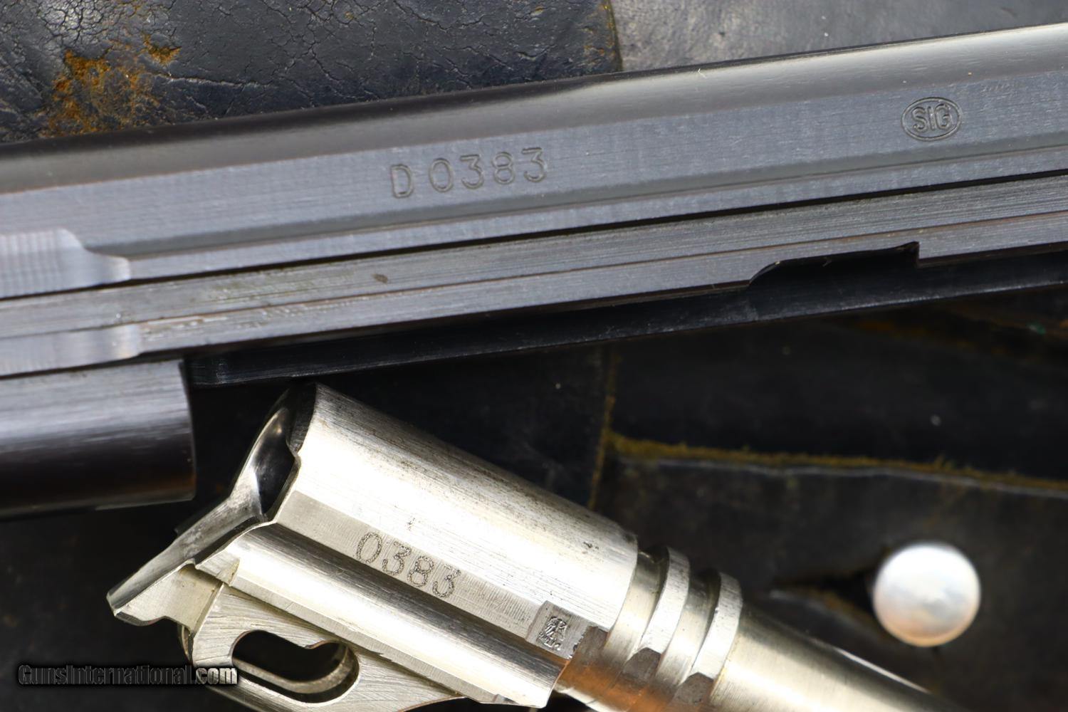 Description: Synopsis: SIG P210-4, German Police, Rig, D0383, I-1196 Description: Standard configuration SIG P210-4 with drift adjustable front and rear sight. The left side of the slide is marked with the full serial number and the encircled SIG logo. The matching number and proof are on the left rail. Usual white highlighted S (safe) and red highlighted F (fire). Disassembly shows a matching barrel and hammer group. Slide, frame, safety lever, and magazine release are blued with the barrel, loaded indicator, hammer, trigger and slide release in the white. Black checkered grips secured with a single transverse screw. Unnumbered and unmarked magazines as correct for this pistol. Correct, unmarked black leather holster. Condition: Original finish with 99+% coverage. Minimal sharp edge wear. Magazines and grips are in comparable condition. Mirror bore. Perfect manual mechanics. Holster VG+ with surface cracking as imaged. Intact original stitching. Overall, an excellent, no excuse, West German Police P210-4 rig that would be difficult to improve upon! ~~Insured shipping fee of $75; most packages shipped using FedEx 2nd Day.~~ SOLD Manufacturer: SIG Serial Number: D0383 Caliber Info: 9mm |
