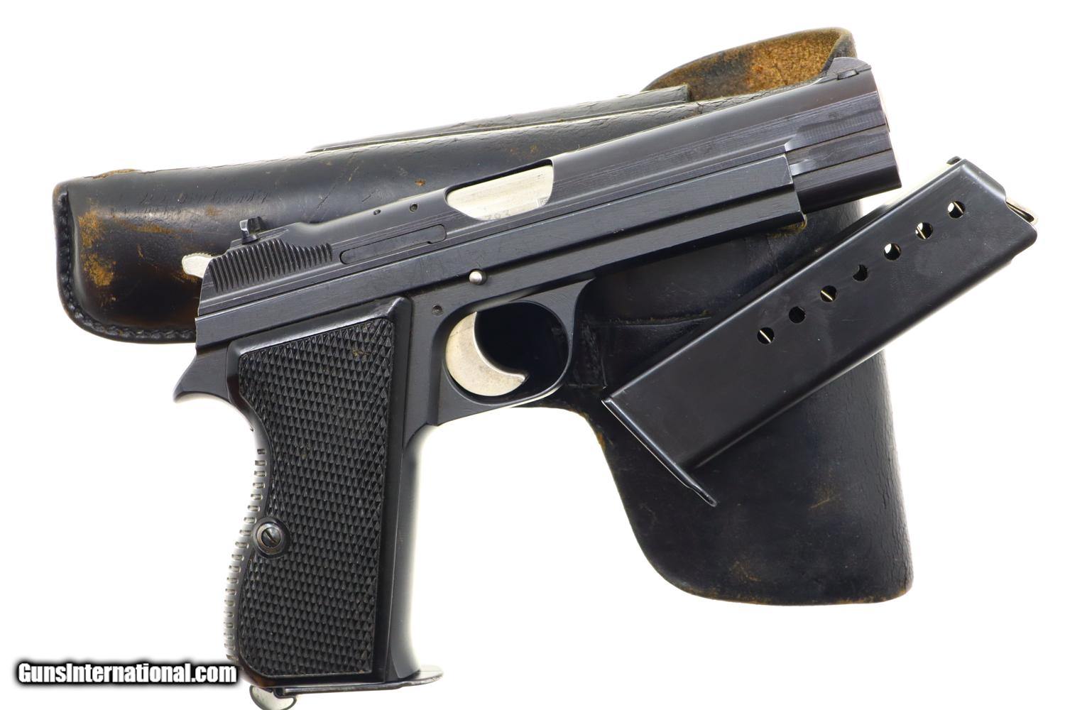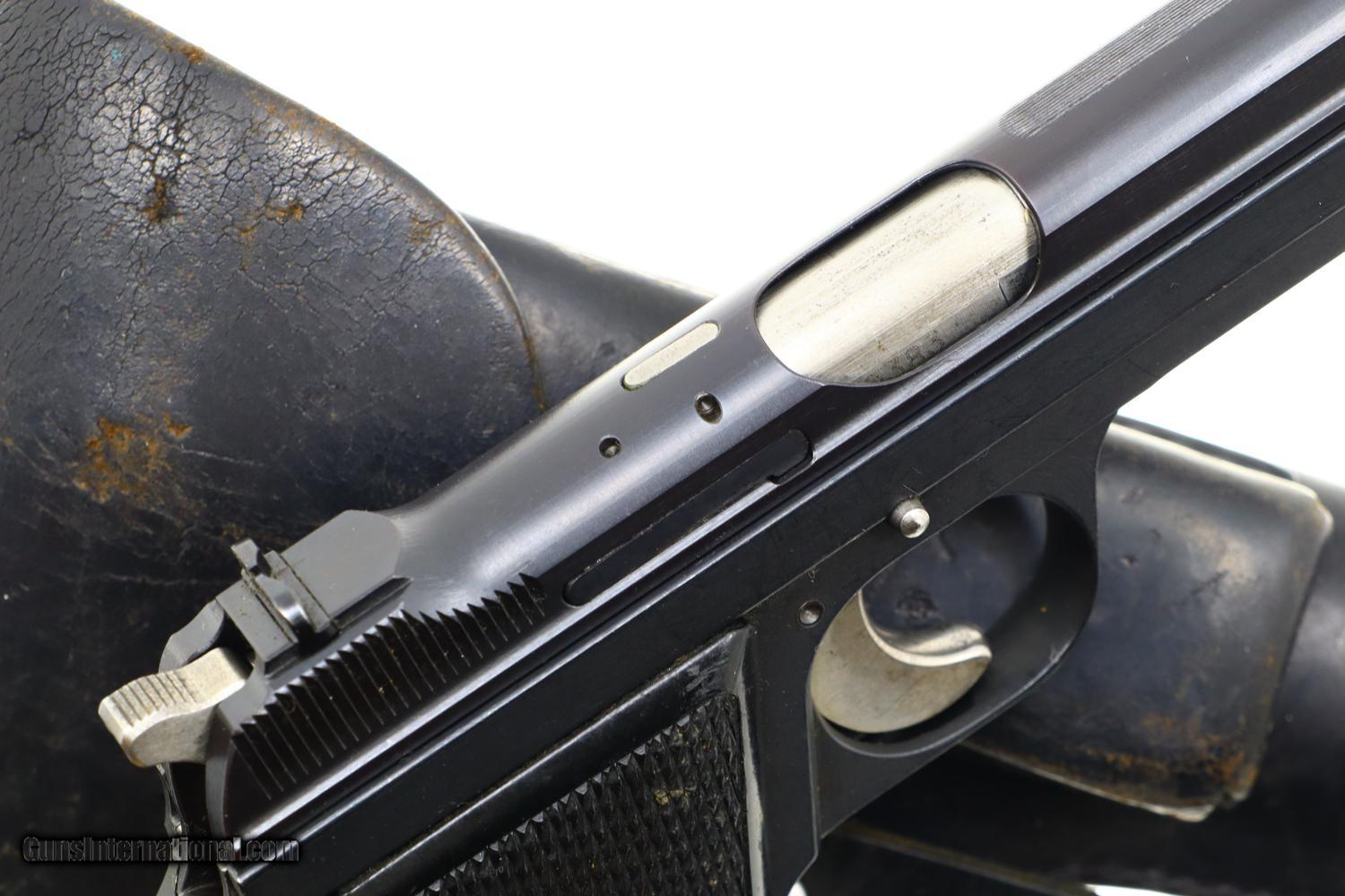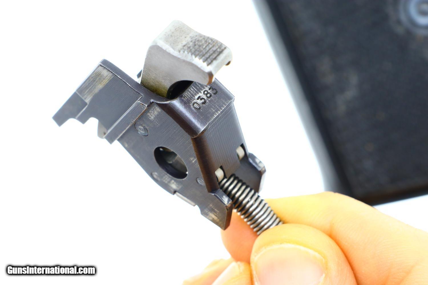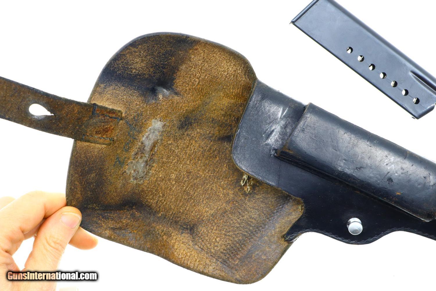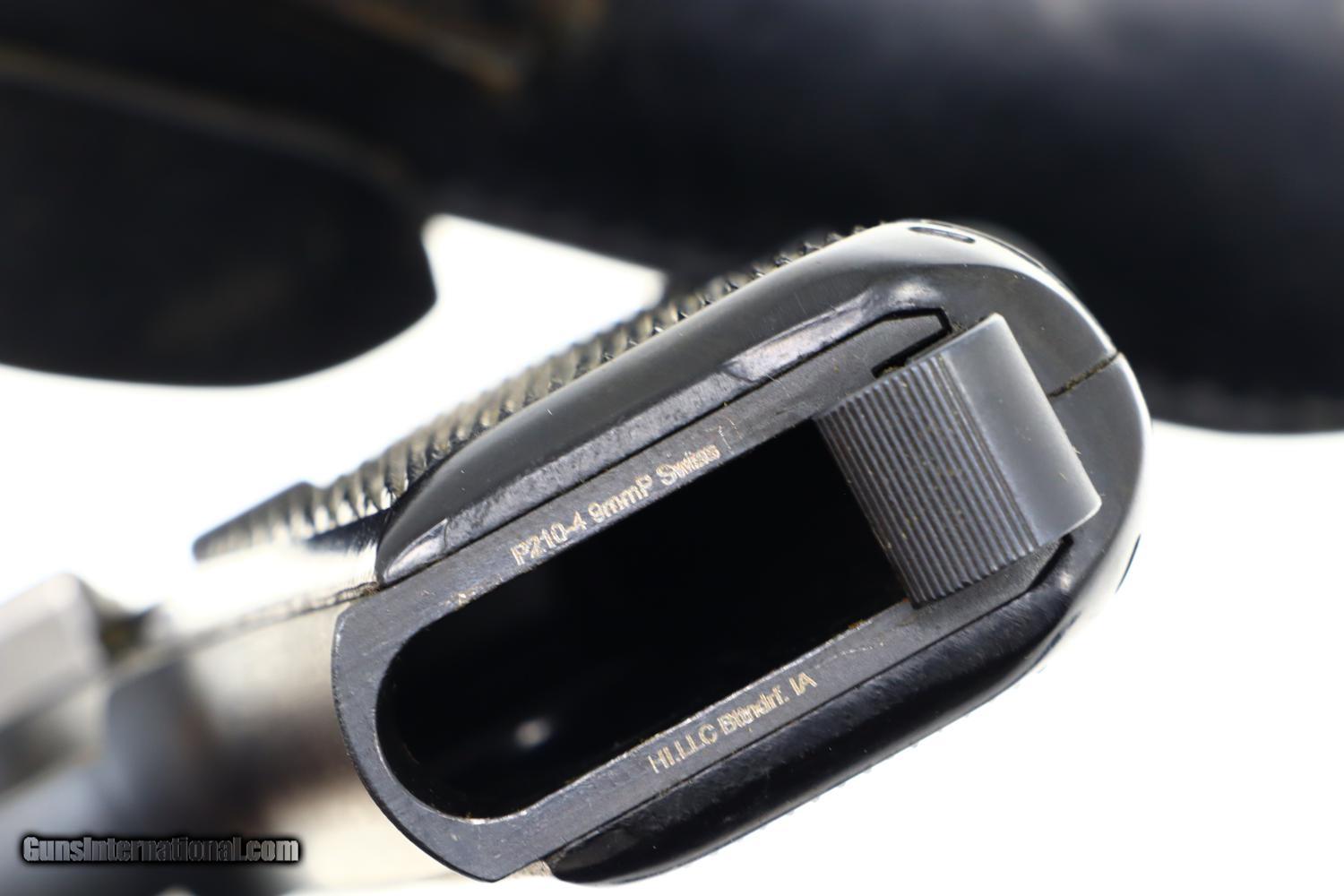 Description: Synopsis: SIG P210-4, German Police, Rig, D0383, I-1196 Description: Standard configuration SIG P210-4 with drift adjustable front and rear sight. The left side of the slide is marked with the full serial number and the encircled SIG logo. The matching number and proof are on the left rail. Usual white highlighted S (safe) and red highlighted F (fire). Disassembly shows a matching barrel and hammer group. Slide, frame, safety lever, and magazine release are blued with the barrel, loaded indicator, hammer, trigger and slide release in the white. Black checkered grips secured with a single transverse screw. Unnumbered and unmarked magazines as correct for this pistol. Correct, unmarked black leather holster. Condition: Original finish with 99+% coverage. Minimal sharp edge wear. Magazines and grips are in comparable condition. Mirror bore. Perfect manual mechanics. Holster VG+ with surface cracking as imaged. Intact original stitching. Overall, an excellent, no excuse, West German Police P210-4 rig that would be difficult to improve upon! ~~Insured shipping fee of $75; most packages shipped using FedEx 2nd Day.~~ SOLD Manufacturer: SIG Serial Number: D0383 Caliber Info: 9mm |