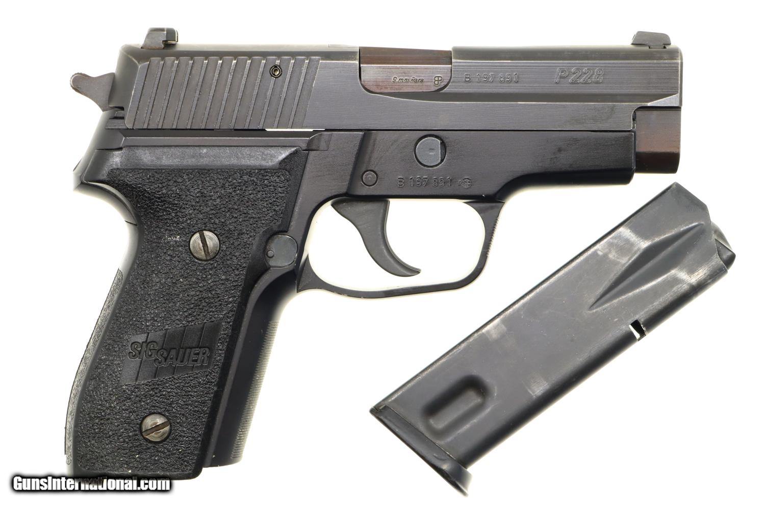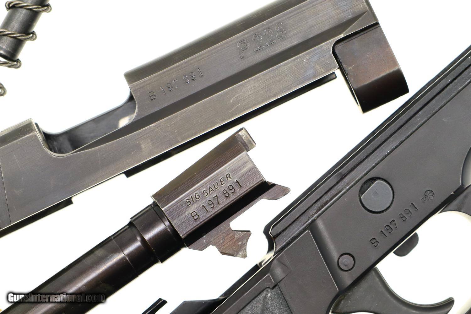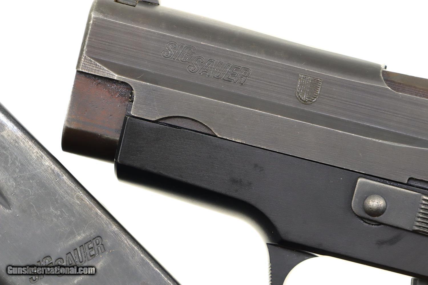 VG+ original finish, with holster wear pattern consistent with light service use. Front strap scuffed as imaged. Comparable condition grips, with slightly burred screws. Magazine with insertional wear as photographed. Mirror bore. Perfect manual mechanics. A SIG Sauer Police variation seldom encountered in the United States. DO NOT PURCHASE IF YOU LIVE IN A STATE WHERE HIGH CAPACITY MAGAZINES ARE RESTRICTED!