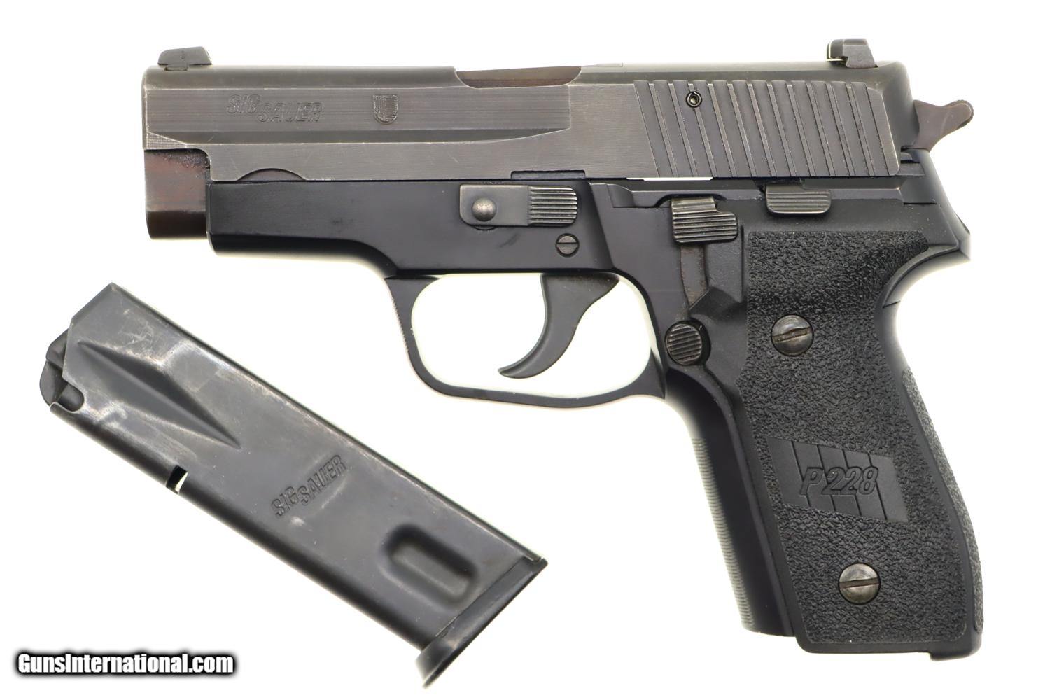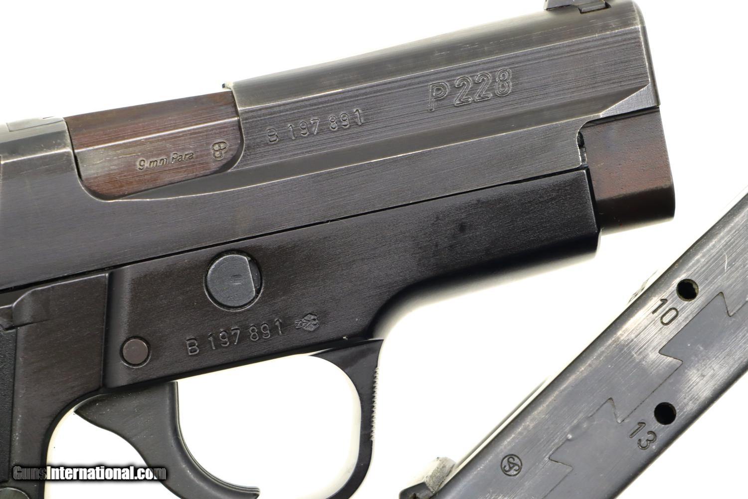 Standard configuration SIG SAUER P228 with early drift adjustable night sights. Left side of slide marked SIG SAUER followed by the canton symbol of Ticino. The right side of the slide is marked with the model, along with the full serial number which appears on the left side of the barrel hood and right side of the frame. Year code "KD" under the nose of the slide reflecting manufacturer year of 1993. Fitted with two piece black plastic grips with a molded textured surface surrounding the model/manufacturer. High capacity double column magazine marked SIG SAUER, the zippered spine having indicator holes marked for 5/10/13 cartridges.
