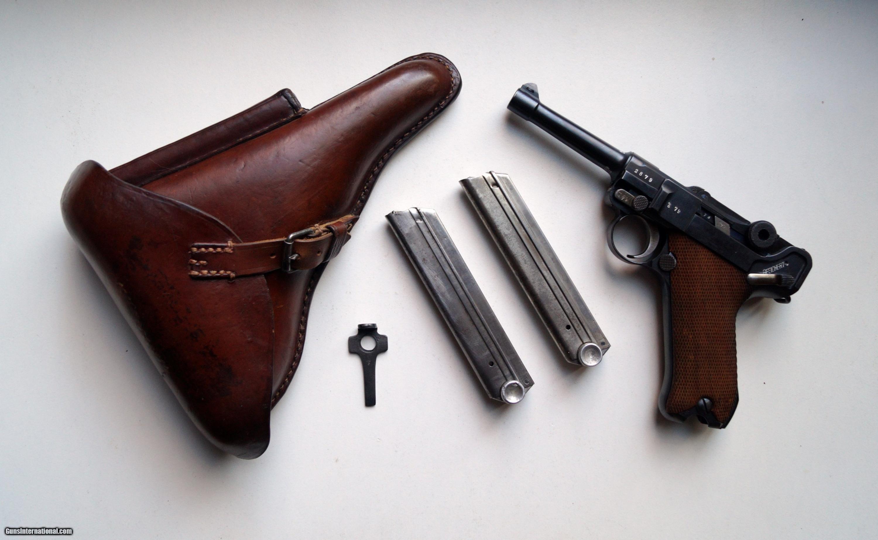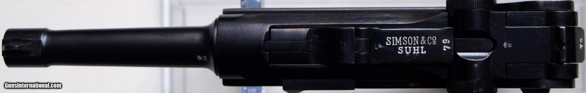 Description: THIS IS A SIMSON / SUHL GERMAN LUGER RIG, 9MM. THE LUGER IS IN VERY GOOD CONDITION, ALL ORIGINAL, NUMBER MATCHING INSIDE AND OUT (THIS INCLUDES BOTH MAGAZINES AND GRIPS), VERY GOOD BORE AND GRIPS, MECHANICALLY CORRECT AND TIGHT. THE RIG CONSISTS OF THE LUGER, 2 ORIGINAL MAGAZINES, 1 ORIGINAL 1915 DATED HOLSTER AND 1 SIMSON MARKED LOADING TOOL.THEY DON'T COME BETTER THAN THIS. SOLD Curio/Relic: Yes |