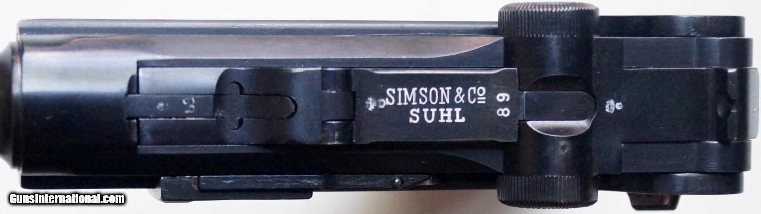 Description: THIS IS A SIMSON / SUHL POICE GERMAN LUGER, 9MM. THE LUGER IS IN VERY GOOD CONDITION. ALL ORIGINAL, NUMBER MATCHING, VERY GOOD BORE AND GRIPS, MECHANICALLY CORRECT AND TIGHT. THE RIG COMES WITH THE LUGER, 2 ORIGINAL SIMSON MAGAZINES (1 NUMBERED TO THE GUN), 1 ORIGINAL POLICE HOLSTER, 1 SIMSON & POLICE MARKED LOADING TOOL AND A NAZI POLICE MEDAL. SIMSON LUGERS ARE FEW AND FAR BETWEEN AND THIS IS A NICE ONE. SOLD Curio/Relic: Yes |