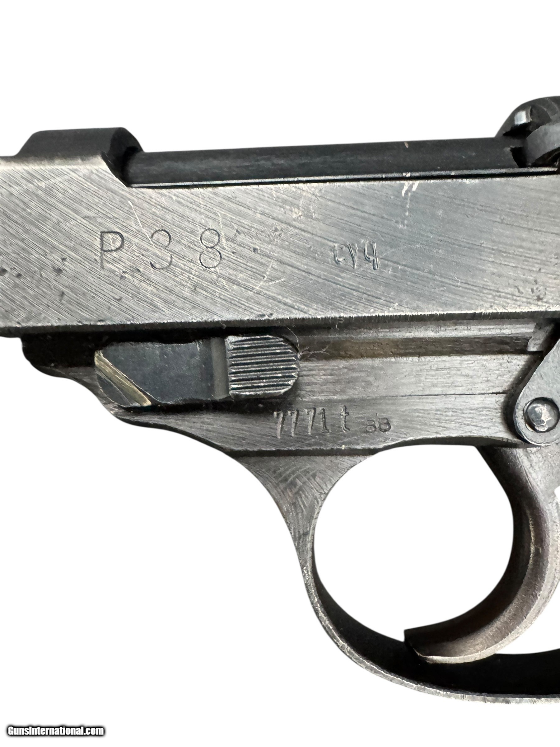 Description: Spreewerk P38 9mm Semi-Auto Pistol – WWII German – One Magazine This is a Spreewerk-manufactured P38 pistol, chambered in 9mm, representing one of the later WWII German production variants of the iconic Walther P38 design. Spreewerk pistols are known for their rougher, utilitarian wartime machining compared to earlier Walther or Mauser examples, making them a distinct and collectible subset of P38 production. The pistol retains its original military configuration, including fixed sights, decocker/safety, and ribbed black grips. The metal surfaces show honest wear, machining marks, and finish loss consistent with age and service use. No claims are made regarding original finish type; buyers should review photos closely to assess condition and surface characteristics. Visible slide markings include “P38” and “cyq” (Spreewerk code), with serial number T771 present on the frame. Grips appear correct for the period and show wear consistent with use. Bore condition has not been gauged beyond visual inspection. This pistol includes one magazine. Details