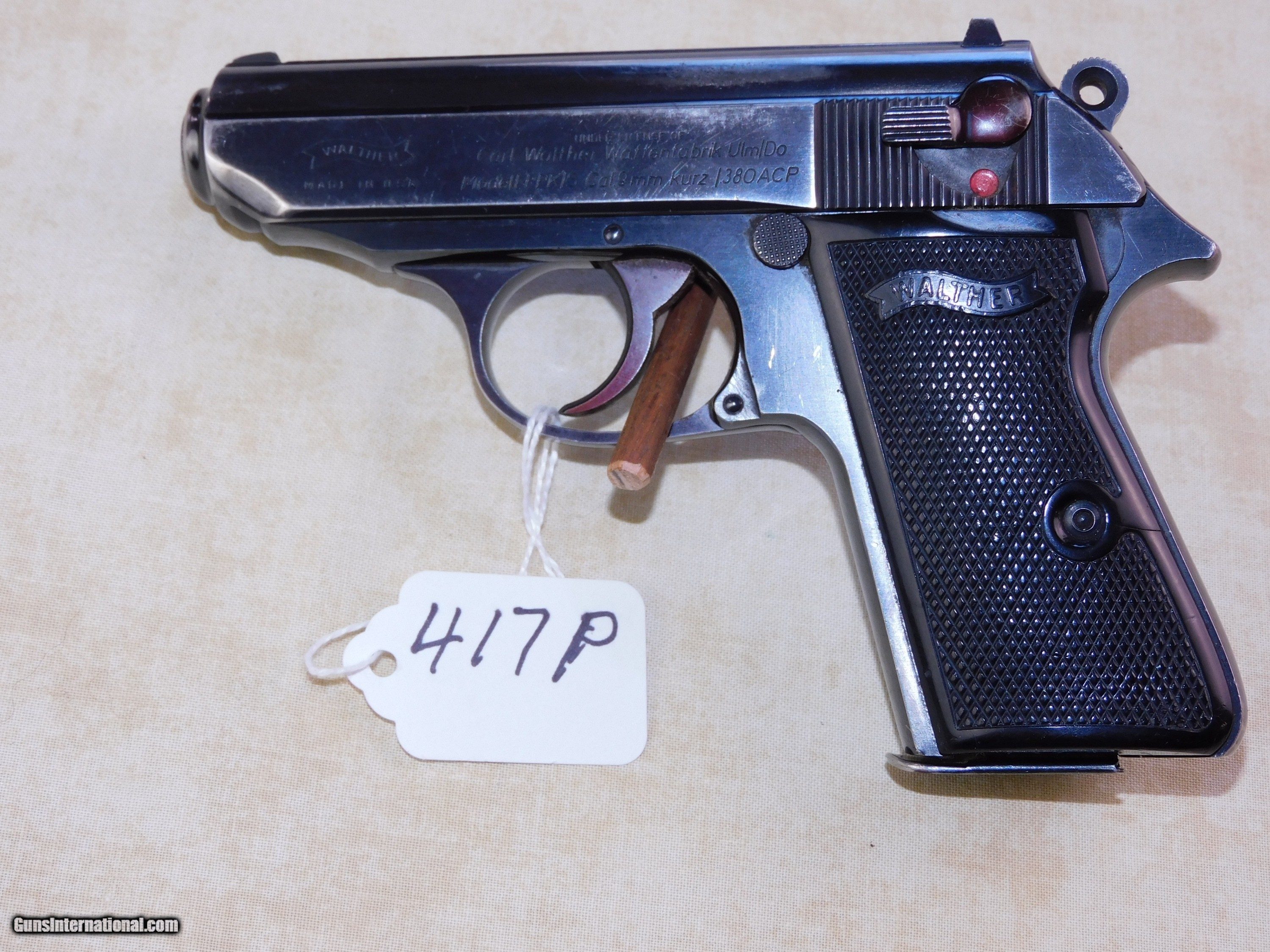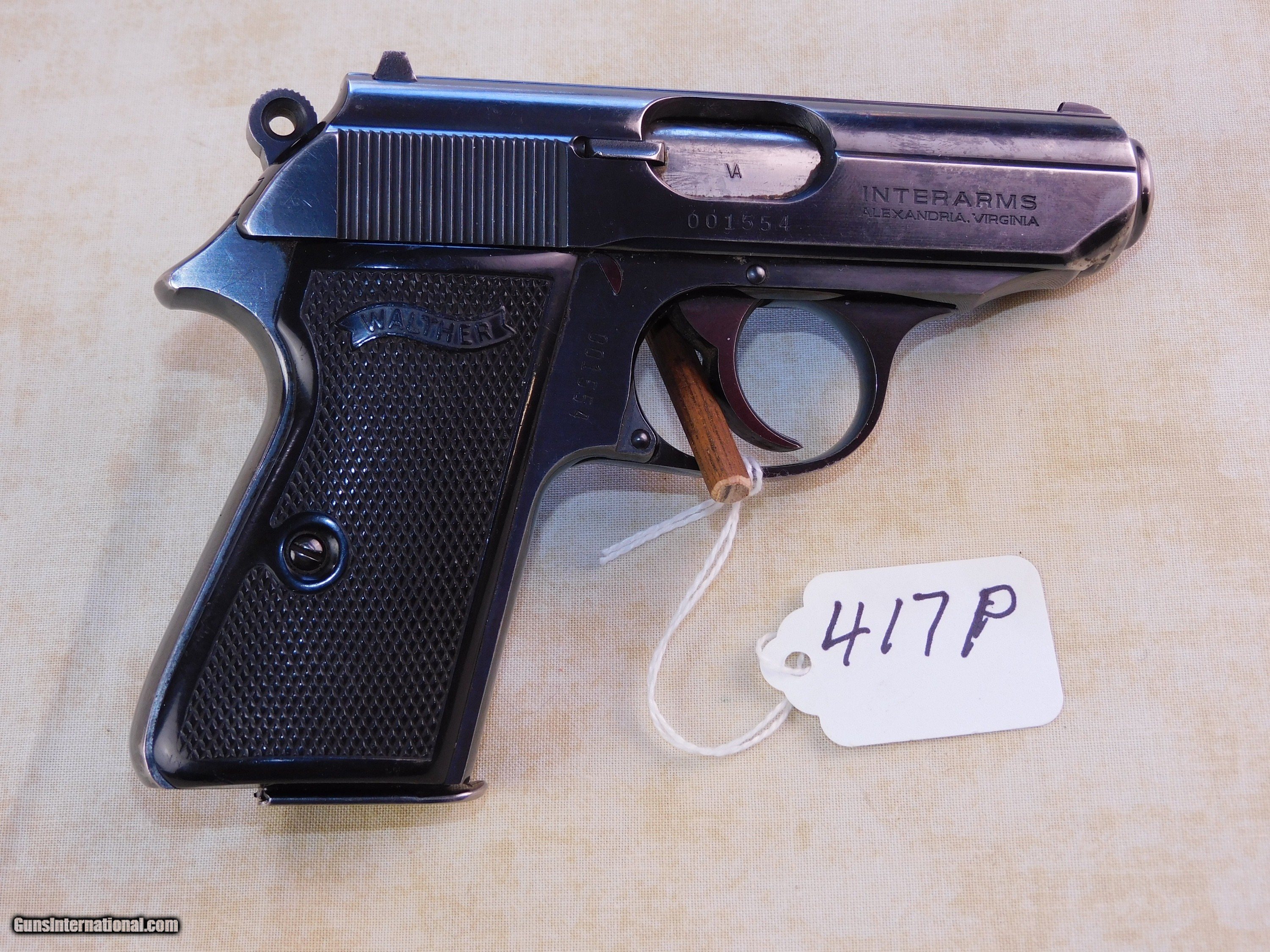 Description: #417P WALTHER MODEL PPK1S, 380 ACP, SN 0015XX, 3” bbl., black plastic checkered grips, marked “Walther”, left side of slide marked “Interarms”, original clip, exc. bore, 97% blue, leather holster. $650 Curio/Relic: Yes Handgun Caliber: .380 ACP (9x17mm Browning Short) Price: $650.00 Contact Seller |