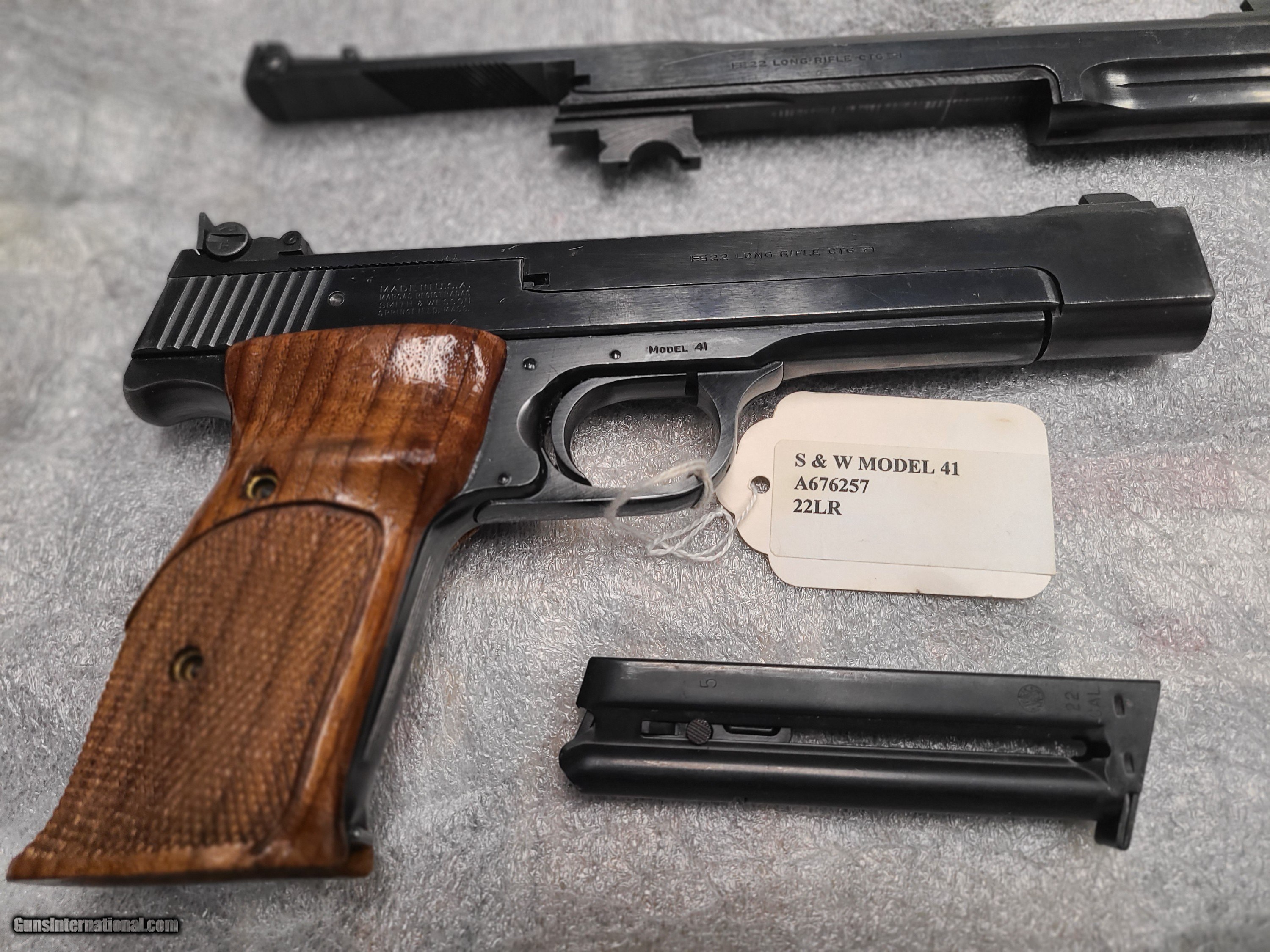 Description: S & W MODEL 41 SEMI AUTO 2 BARRELS 5" and 7" LENGHTS VERY GOOD CONDITION CONSIDERING AGE OF GUN 90s NO VISIBLE DAMAGE WOOD VERY GOOD Handgun Caliber: .22 Long Rifle Manufacturer: SMITH AND WESSON Model: 41 Serial Number: A676257 Barrel Length: 5 and 7 Condition: VERY GOOD Metal Condition: VERY GOOD Wood Condition: VERY GOOD Bore Condition: VERY GOOD Barrels: BOTH EXCELLENT Price: $1,500.00 Contact Seller |