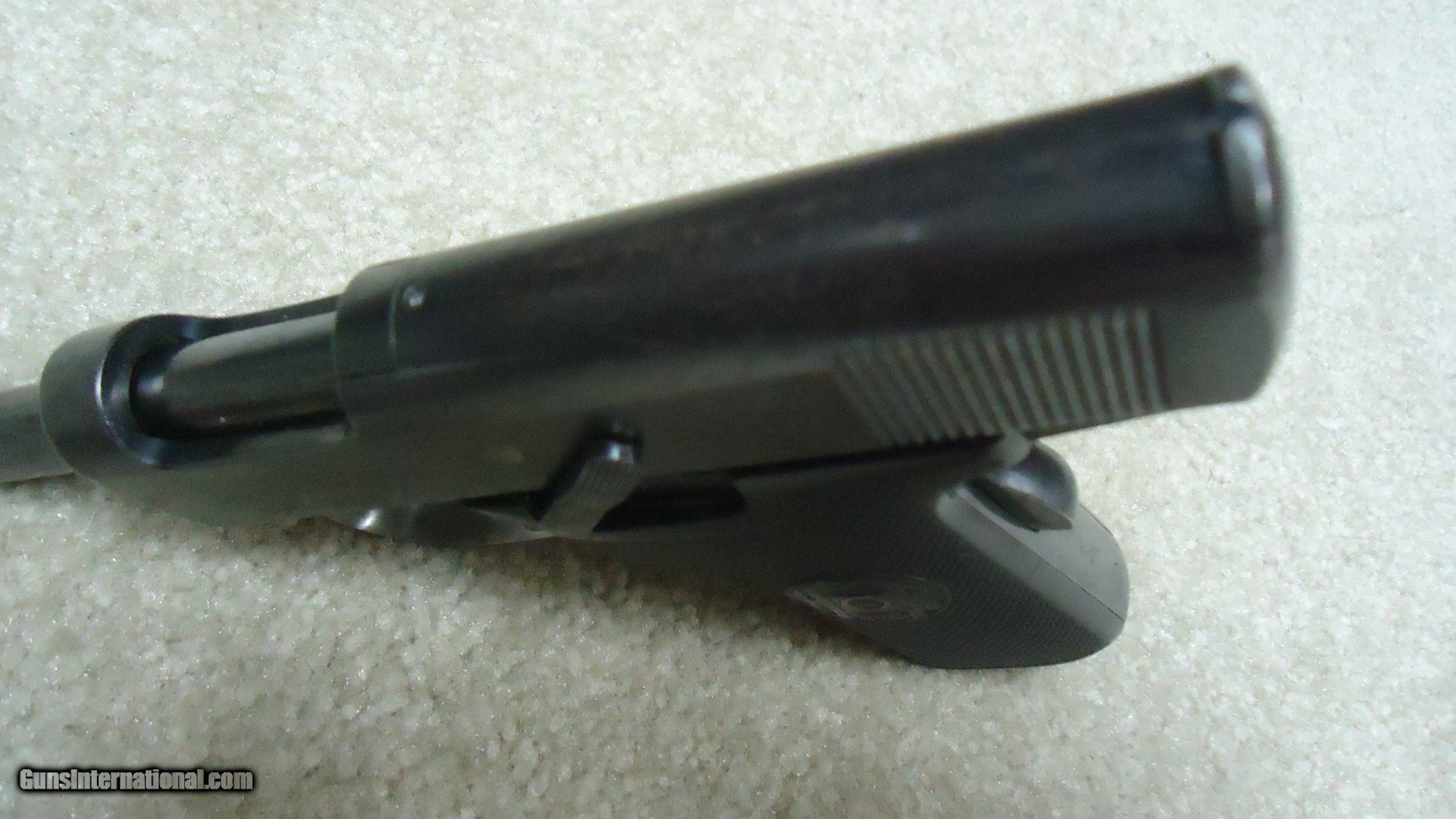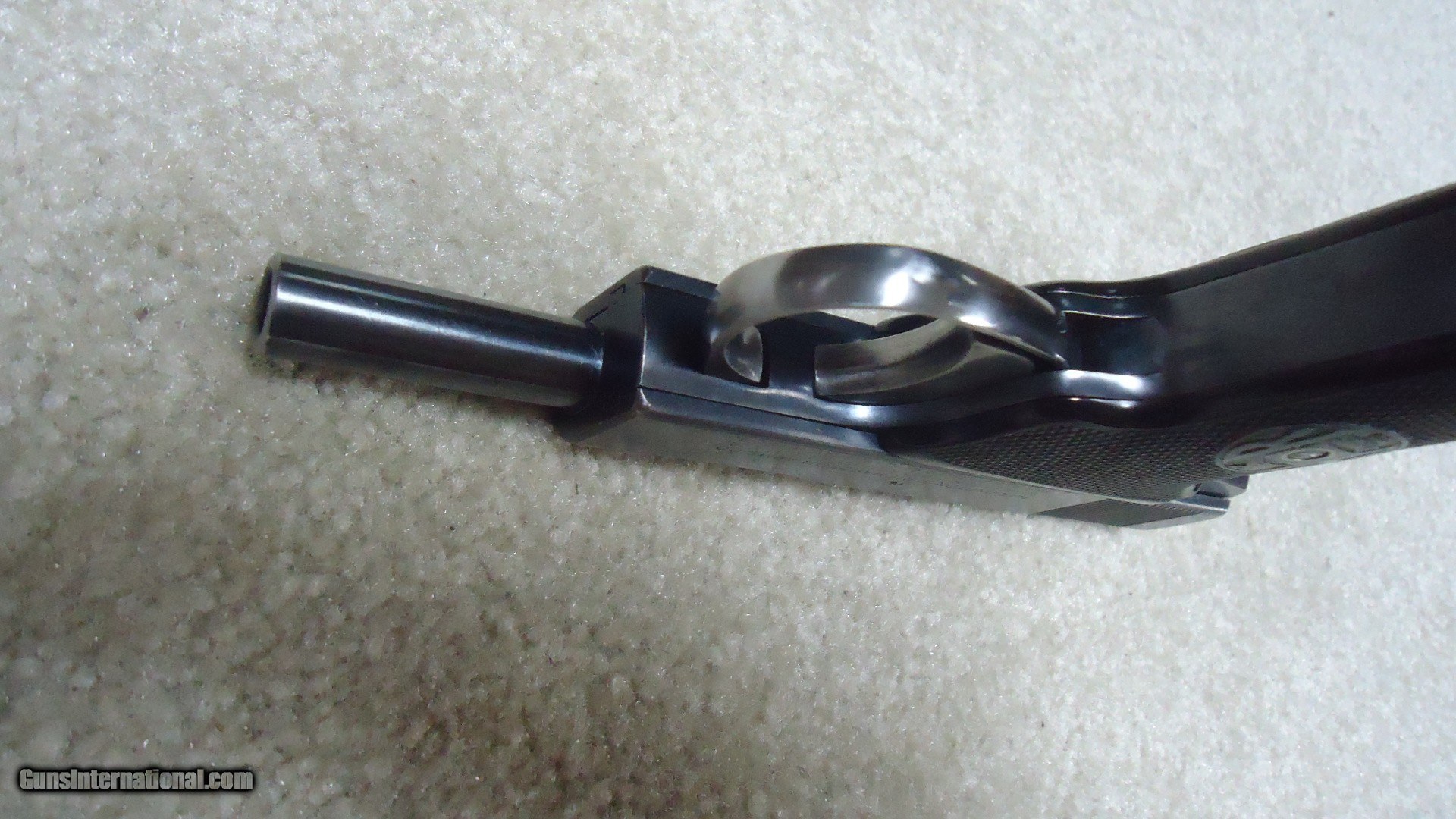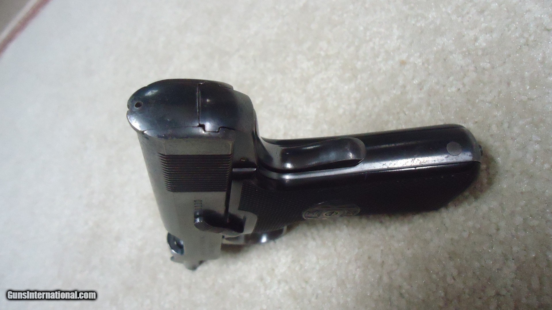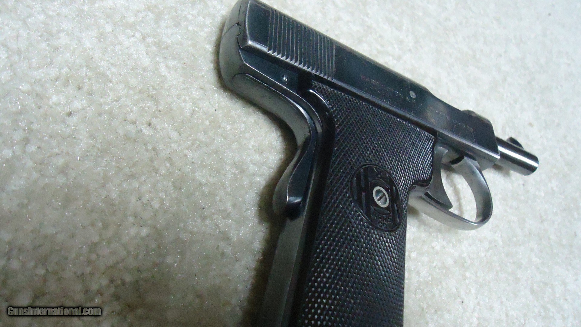 Description: LIMITED PRODUCTION HARRINGTON & RICHARDSON .32 AUTO PISTOL, #11XXX, ONLY MADE FROM 1916-1924. These distinctive hammerless auto pistols were designed by Webley & Scott of England who licensed H&R to manufacture them and sell them in the United States. These pistols have a certain look and feel that harken back to "between the wars" England where this exact pistol made by Webley I& Scott was issued to the London Police. They have a surprisingly good feel and are extremely well made in every respect. this example retains about all the original blue with only some minor pin-prick brown spotting here and there that is NOT rust or pitting, just the blue starting to age. All markings are sharp and excellent, H&R embossed hard rubber grips are excellent, tight action, original magazine, correct bright trigger guard, grip safety functions properly as does the safety, excellent bright bore, unaltered. A classy 100 year old solid steel auto. SOLD Curio/Relic: Yes Handgun Caliber: .32 ACP (7.65x17mm Browning SR) Manufacturer: HARRINGTON & RICHARDSON Model: AUTO PISTOL Serial Number: 11XXX Condition: EXCELLENT Bore Condition: EXCELLENT |
