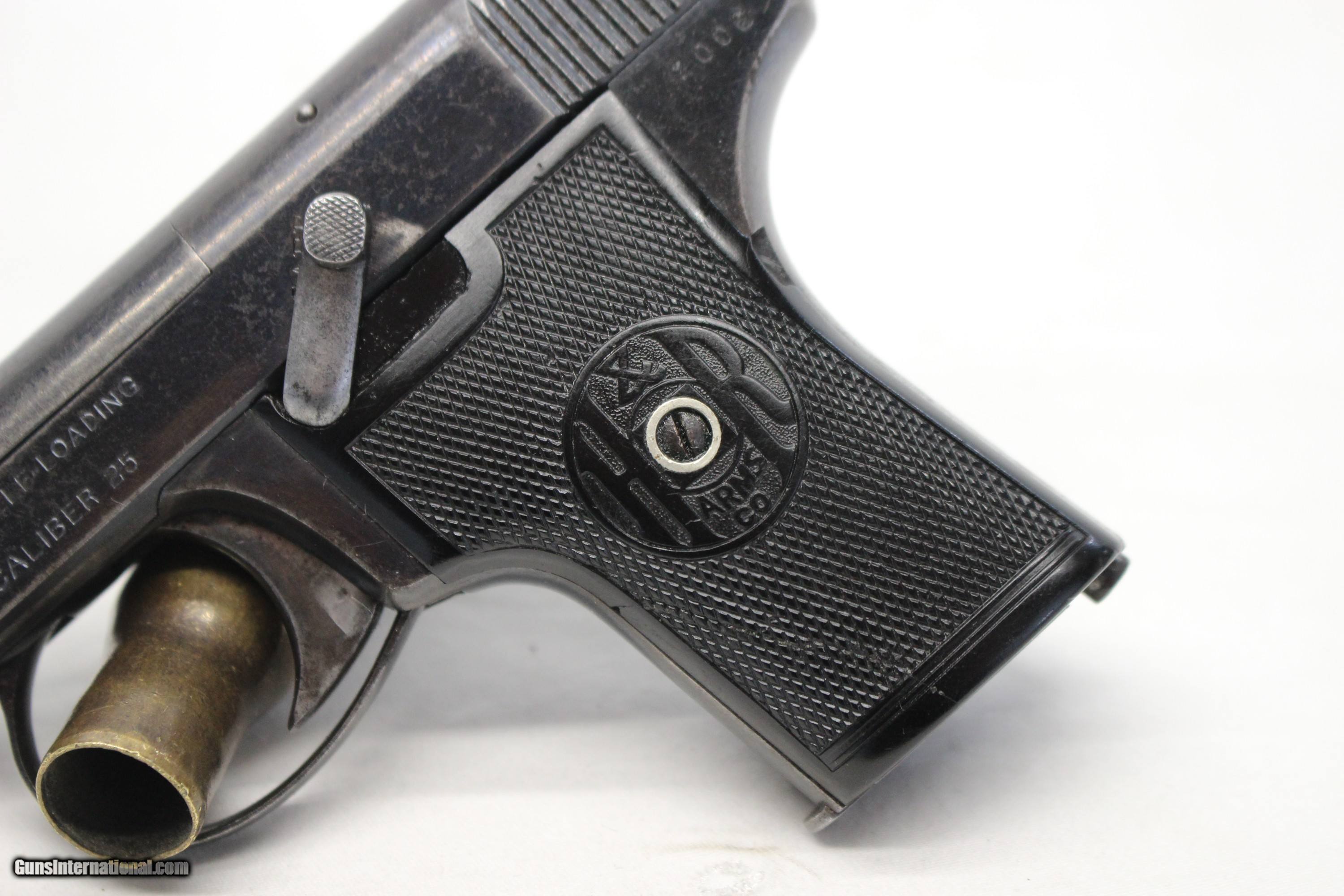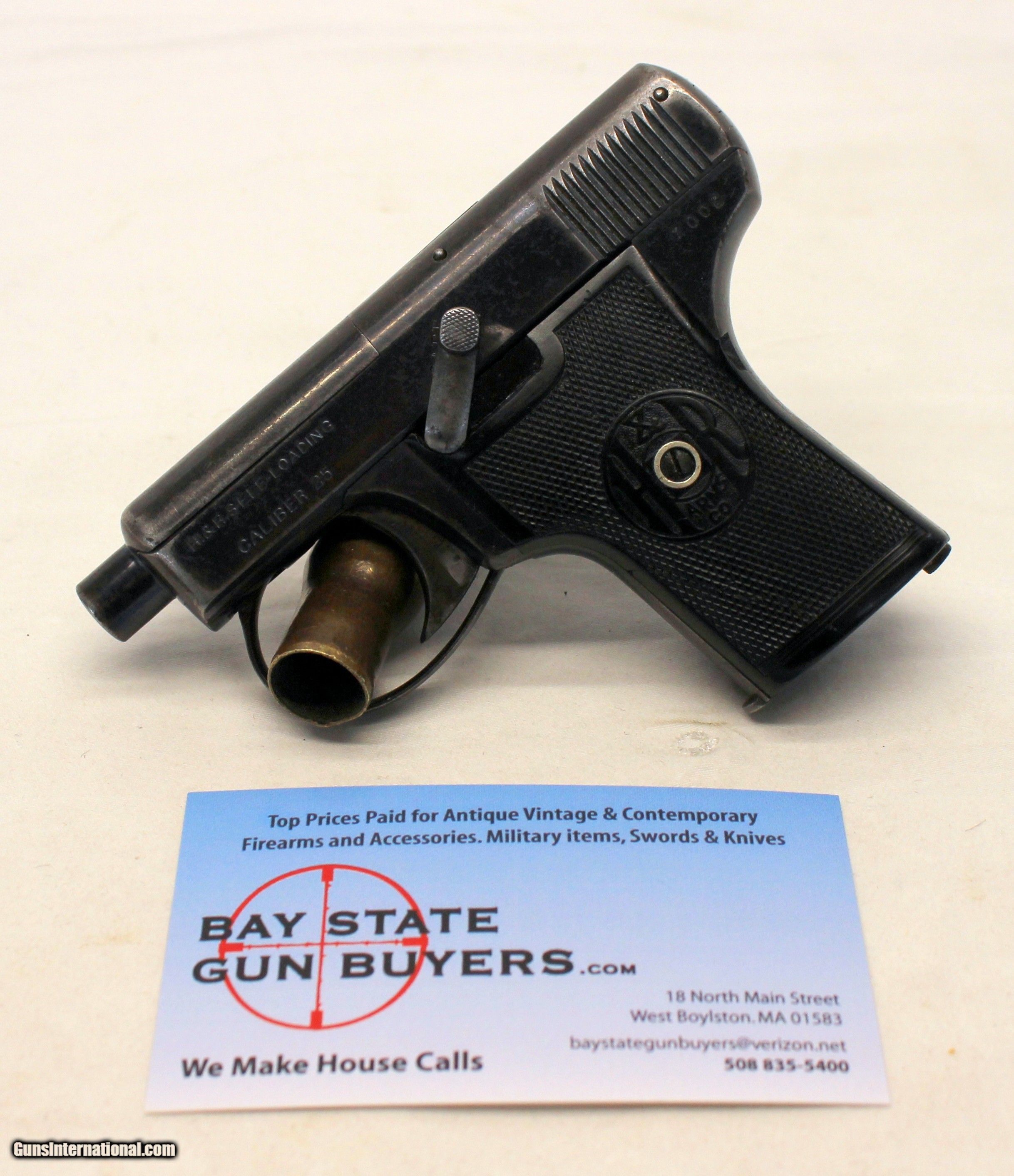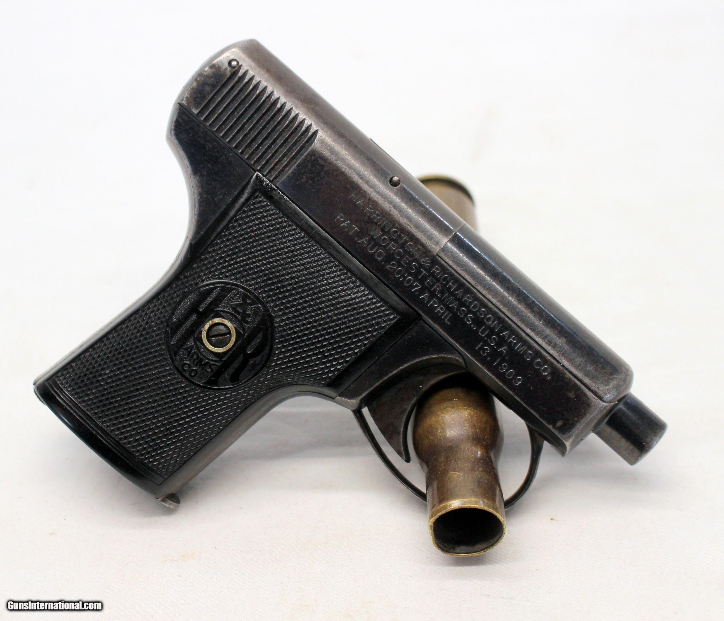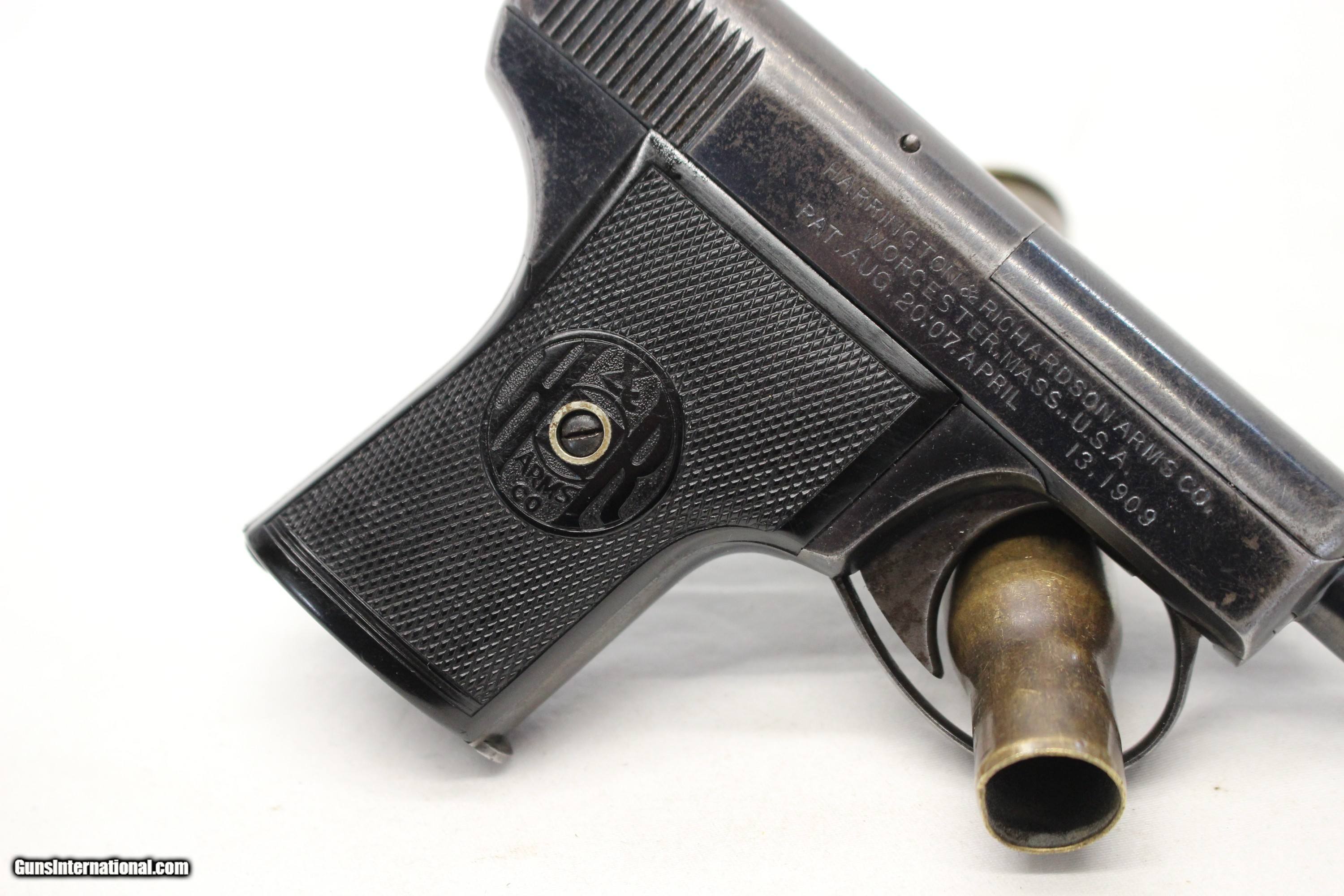 Description: We are offering for sale a very scarce Harrington & Richardson SELF LOADING pistol chambered in .25ACP caliber. This is a small vest pistol in good, fully functioning condition. 2" barrel is good with a clean bore showing original rifling. Slide and frame are good with scattered wear, blue loss. Gun functions flawlessluy. Original hard rubber grips are very good without breaks or cracks. Original magazine intact. SCARCE COLLECTIBLE PISTOL! Shipping is 19.95 via USPS Priority **** PLEASE NOTE: WE ONLY ACCEPT MASTERCARD AND VISA AS PAYMENT OPTIONS (please note we charge a non-negotiable 3% CC fee) **** **** WE TAKE CREDIT CARD PAYMENT OVER THE PHONE. WE DO NOT TAKE PAYMENT THROUGH THIS **** PLEASE LOOK AT ALL PHOTOGRAPHS FOR CONDITION Please know the legality of any weapon in your state before . If a gun can’t be transferred to you we will charge a 15% re-stocking fee. We are in the shop MODAY, WEDNESDAY, THURSDAY, FRIDAY and SATURDAY 8am-4pm EST. We will be in touch within 24 hours of your purchase. Please be ready to provide CC information. Please have your FFL email a copy of their license to: . No Face To Face Transfers! Please note: Clicking "buy" does not guarantee that this gun is yours, However clicking “Buy” will reserve this gun for you, if it hasn’t been sold in store. We will try to do our best to remove the posts as efficiently as possible, but sometimes delays may ensue. “Buy” is your safest bet to reserve a gun. Also please add 6.25% MA state sales tax (if from MA) and 3% credit card shop courtesy fee for all out of state buyers. SOLD Curio/Relic: Yes |