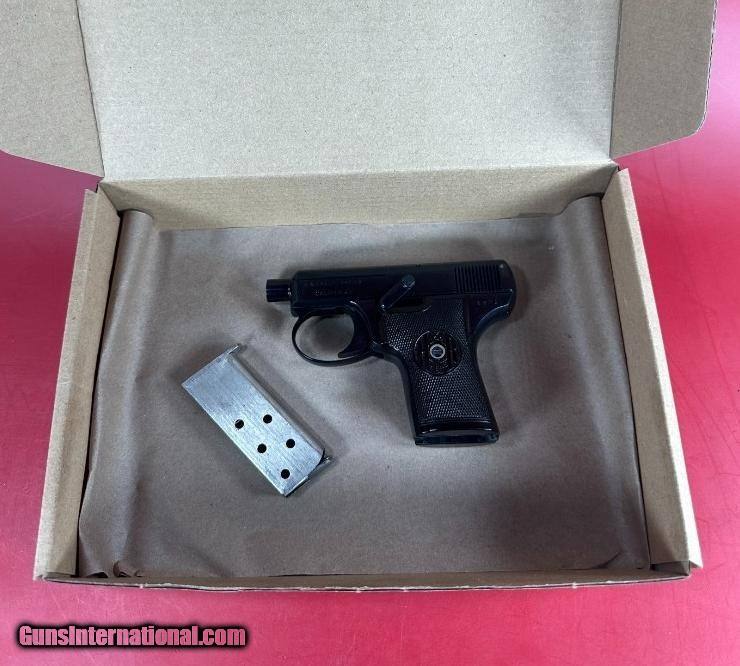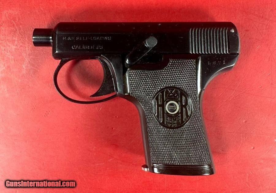 Description: This is a nice example of an H&R .25 Caliber Self-Loading pistol. Under license from Webley in England, the H&R .25 Cal was an American clone of the Webley & Scott 1912 with various upgrades during its manufacturing years in Worcester, MA from 1912-16. Really rare, a total of 16,630 .25 Caliber pistols were made. This example is in the excellent condition. Metal finish is about 98%, grips about 98%, good bore. Sale includes one magazine. This gun will be a great addition to any collection, don't miss it. SOLD Handgun Caliber: .25 ACP (6.35mm Browning, 6.35×16mmSR) |