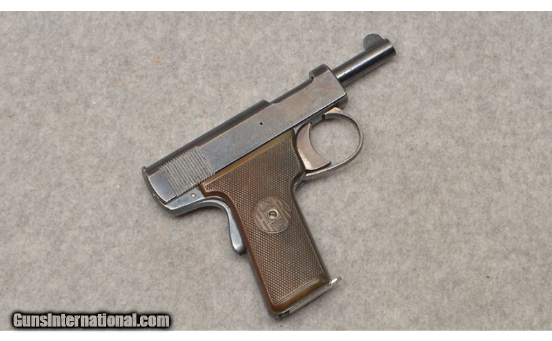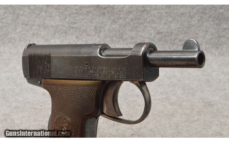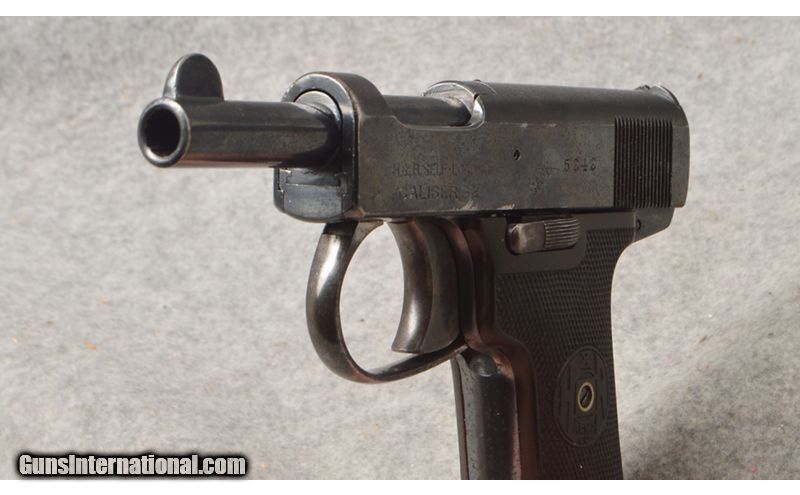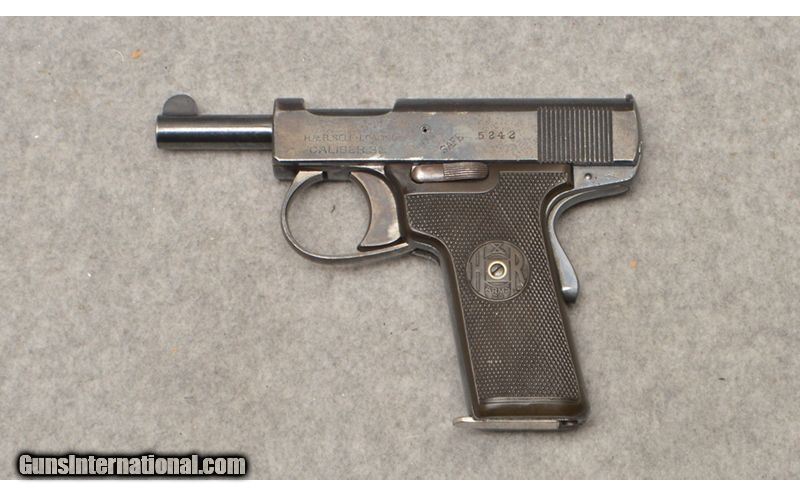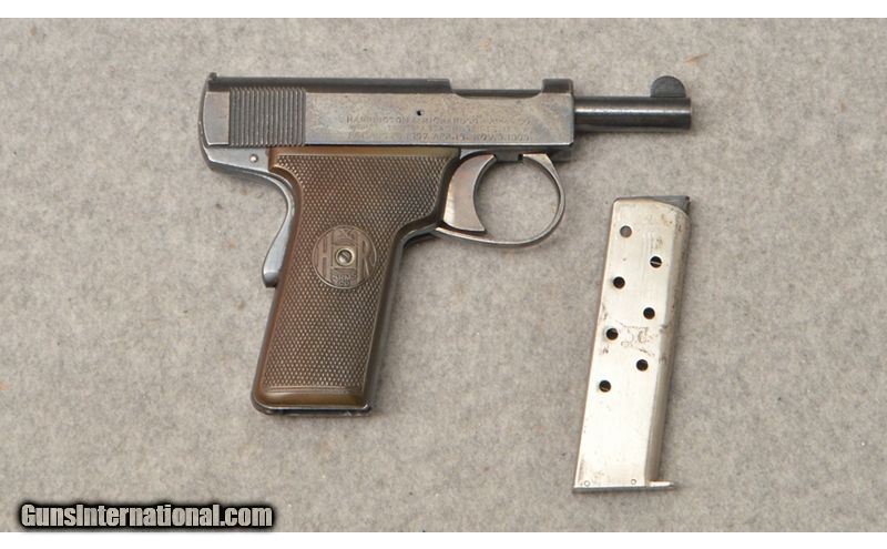 Description: This H & R Arms Model Self Loading .32 semi auto pistol in .32 ACP is in good condition. The blue steel barrel and receiver frame are good with minor surface pitting on the sides of the slide. The 3 1/2" blue steel barrel is good with clear rifling in its bore. The S/A trigger has short take up with a firm release. The checkered hard rubber grips are good with no chips or cracks. The H & R self-loading .32 was manufactured from 1914 to 1924 though it remained in the catalog until 1939, with 40,000 units being produced. This H & R pistol comes with 1(one) 8 round magazine, but no box or any other accessories. .32 ACP SOLD Curio/Relic: Yes Metal Condition: Good Bore Condition: Good Barrels: 3 1/2" Blue Steel Triggers: Single Action Curved Smooth Stock Dimensions: LOP 3" Height 4 3/4" Length 6 3/8 Weight: 21 oz. Sights: Front Fixed Blade with Rear Fixed Notch Item Location: West Chester, OH |