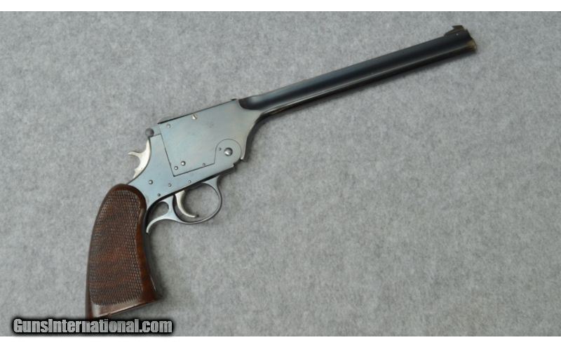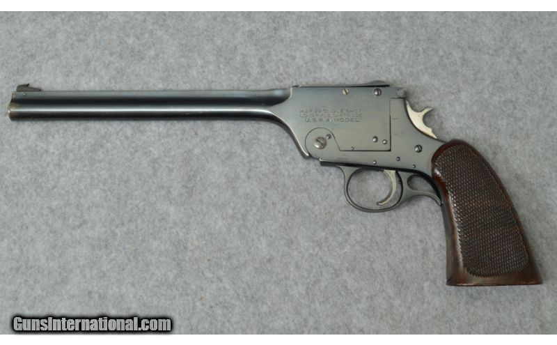 Description: This is a very nice Harrington & Richardson USRA Model, chambered in .22 long rifle, and is in very good to excellent condition. SOLD Caliber Info: .22 Long Rifle. Chambers: Break action. Single shot. Metal Condition: Excellent. Minor wear to finish, and handling marks. Wood Condition: Very good. Minor marks on grips. Bore Condition: Excellent. Bright, and shiny. Barrels: 10" blued. Triggers: Single, serrated trigger. Stock: Checkered wood grips. Stock Dimensions: 13.75" overall length. Butt Pad: Checkered wood grips. Weight: 16 ounces. Sights: Notch rear sight, and blade front sight. Item Location: Centerville, OH |