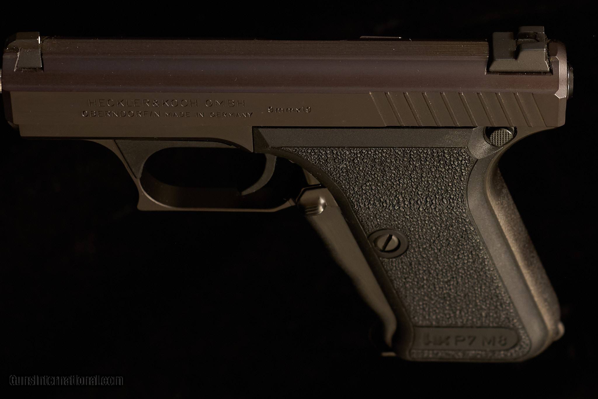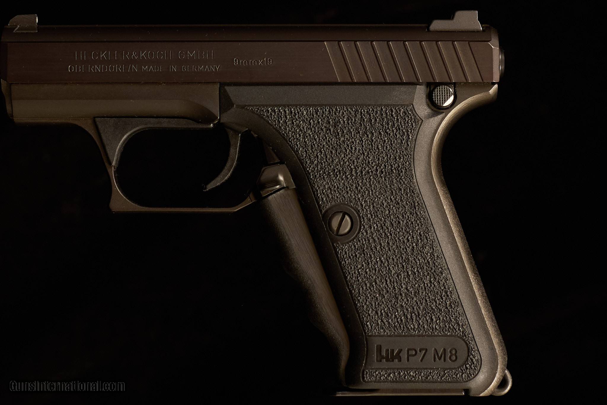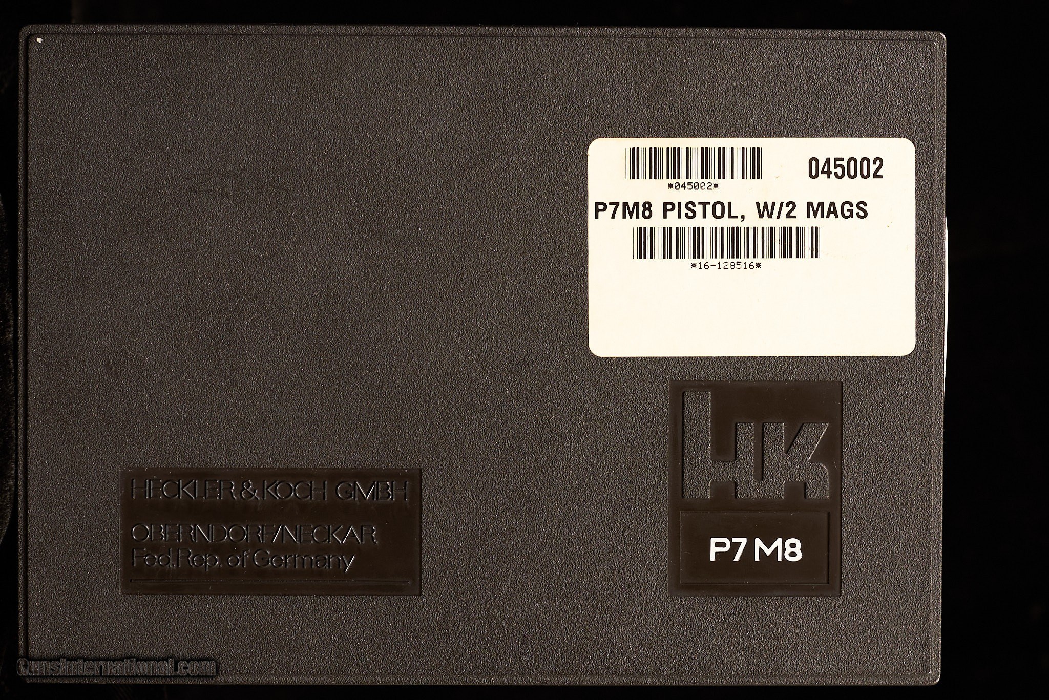 Description: HK P7 M8 in outstanding condition. This is the example to buy and park in your collection—it's that nice! Proof code is KH (1997). If this gun was fired, it was very little. It has certainly never seen a holster. Includes two magazines, tools, and original paperwork in the original factory plastic box with the pistol's serial number. Price: $3,900.00 Contact Seller |