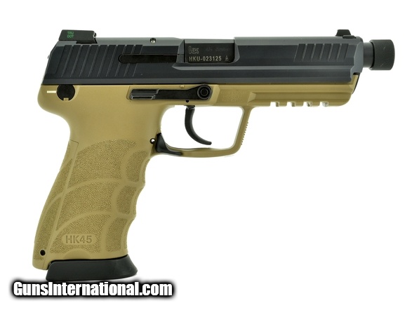 HK 45 .45 ACP caliber pistol. Tactical model with threaded barrel box and magazine. FDE finish. Excellent condition.