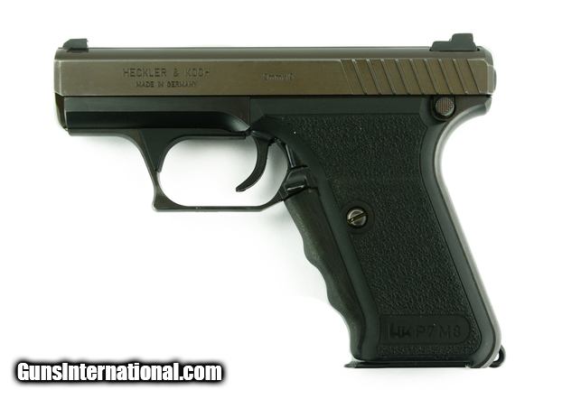 HK P7/M8 9mm caliber pistol. German made squeeze cocker with box and extra magazine in excellent condition.