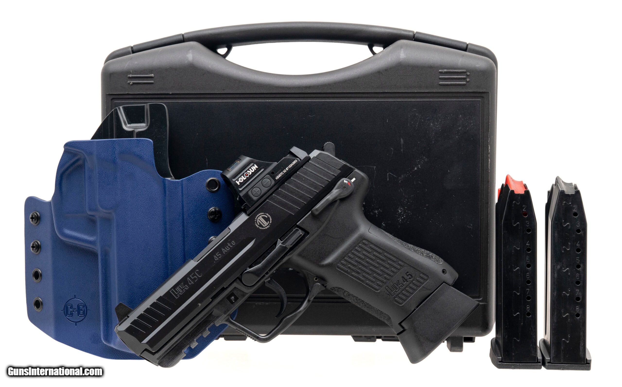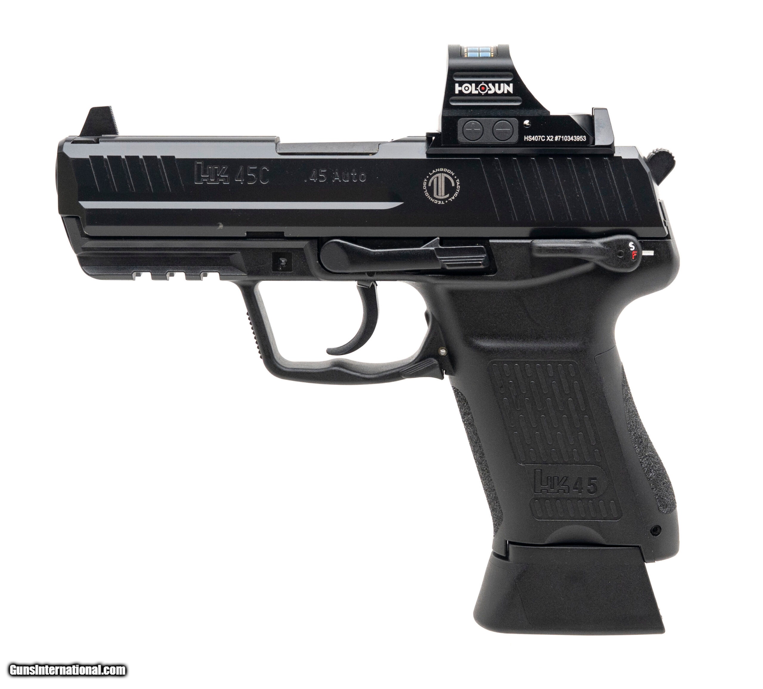 Description: "SN: 216-038262. Modern production, ..45 Auto with a 4"" barrel. Bore is excellent. Compact p istol customized by Langdon Tactical Technology with Holosun 407C X2 red dot optic, decocker safety, ambidextrous slide release and accessory rail. Includes C&G carry holster, additional 8rd magazine, and original case. Overall condition is near excellent. SOLD |