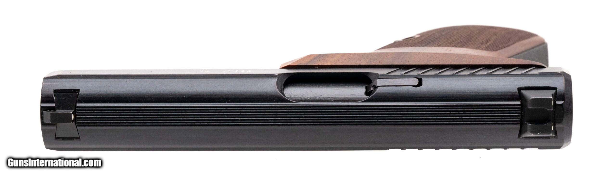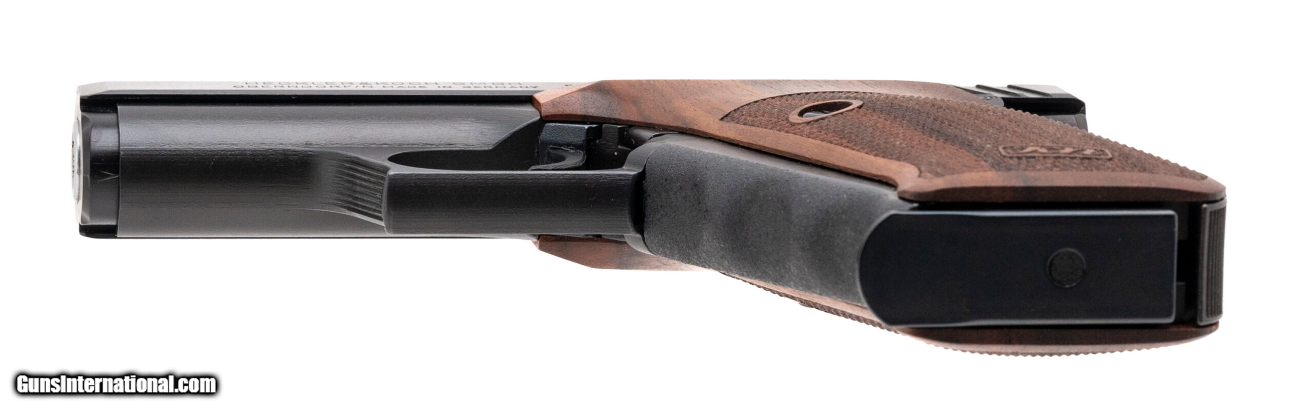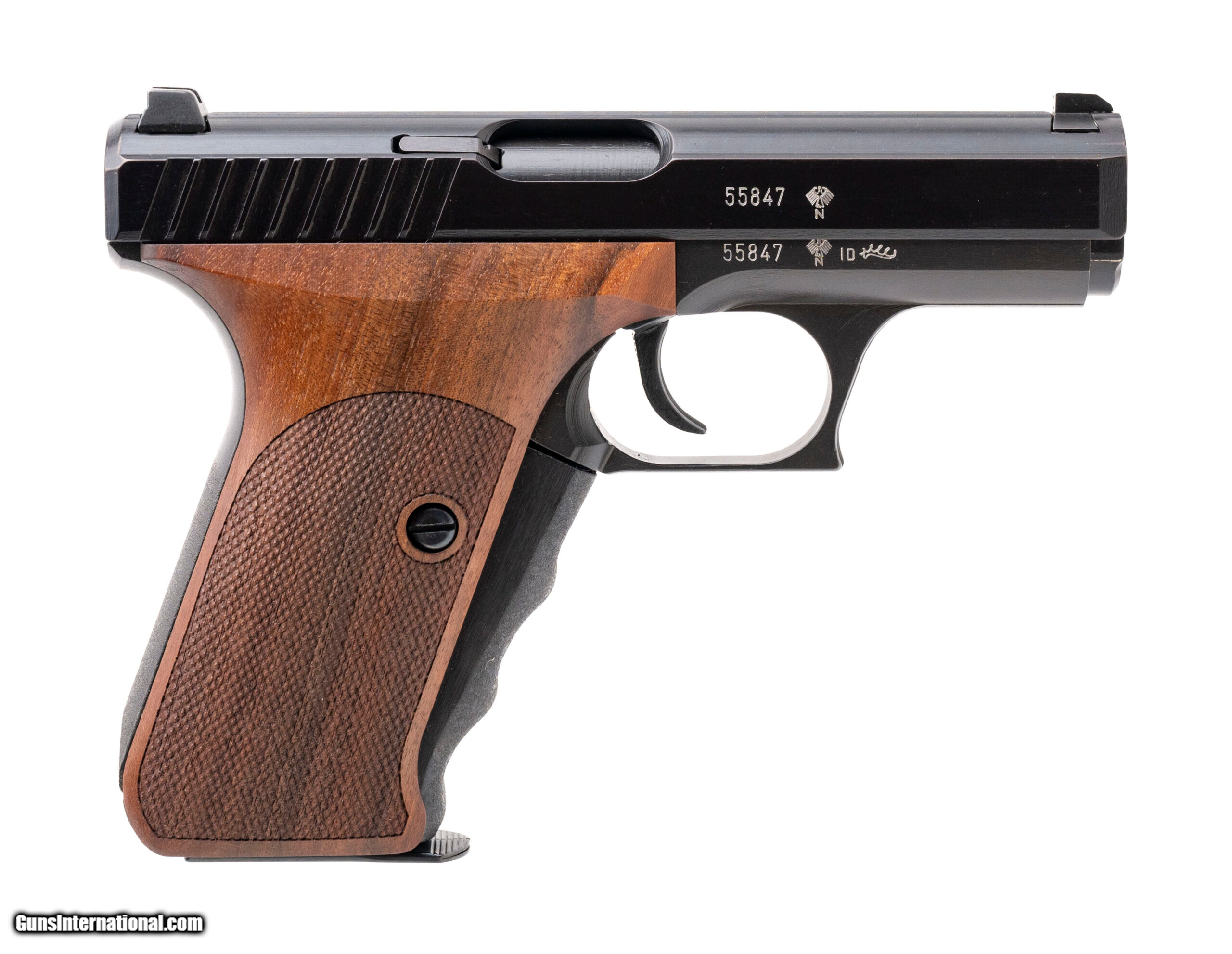 Description: "SN: 55847. Made in 1983, 9mm with a 4.1"" barrel. Original German made commercial squeezecocker, not a surplus police gun. The slide has no import mark, meaning the gun was probably purchased in Germany and then brought to the U.S. by the owner, perhaps a G.I. The gun is in excellent condition and has a set of Nill custom wood grips, as well as the original grips. Comes with original box, test target, manual and extra mag. SOLD |
