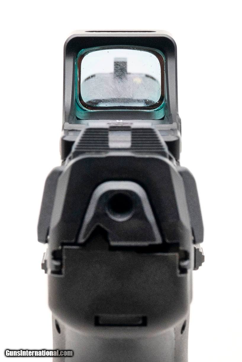 Description: "SN: 224-389213. Modern production, 9mm with a 4"" barrel. Bore is excellent. Compact striker fired pistol with a Holosun SCS green dot sight, accessory rail, matte black finish, and black polymer frame. Includes 4 additional magazines, 3 additional backstraps, original carry case, and original box. Overall condition is near excellent. SOLD |