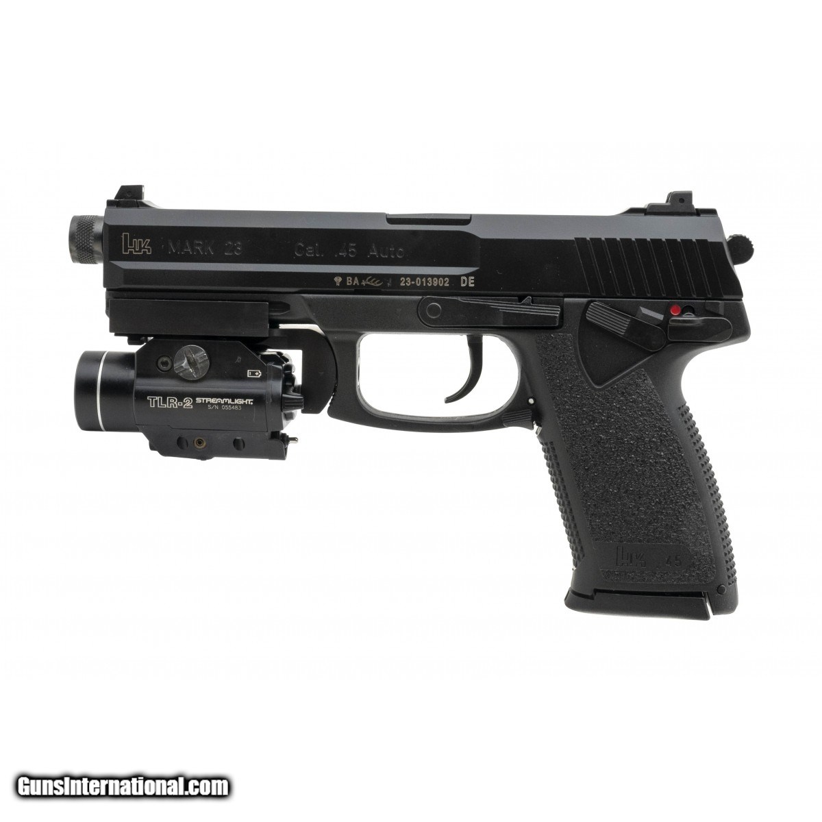 SN: 23-013902. Modern production. .45 ACP with a 5.87"" threaded barrel, bore is excellent. German made duty handgun with polymer frame, double-single action, 3 white dot sights and safety-decocker. Overall excellent condition. Comes with range bag, faux suppressor and 2 extra magazines. Comes with Streamlight TLR-2 light. (Consignment)