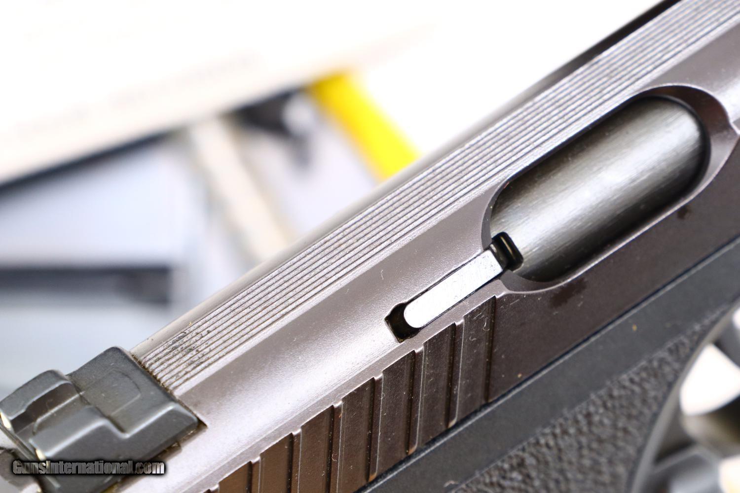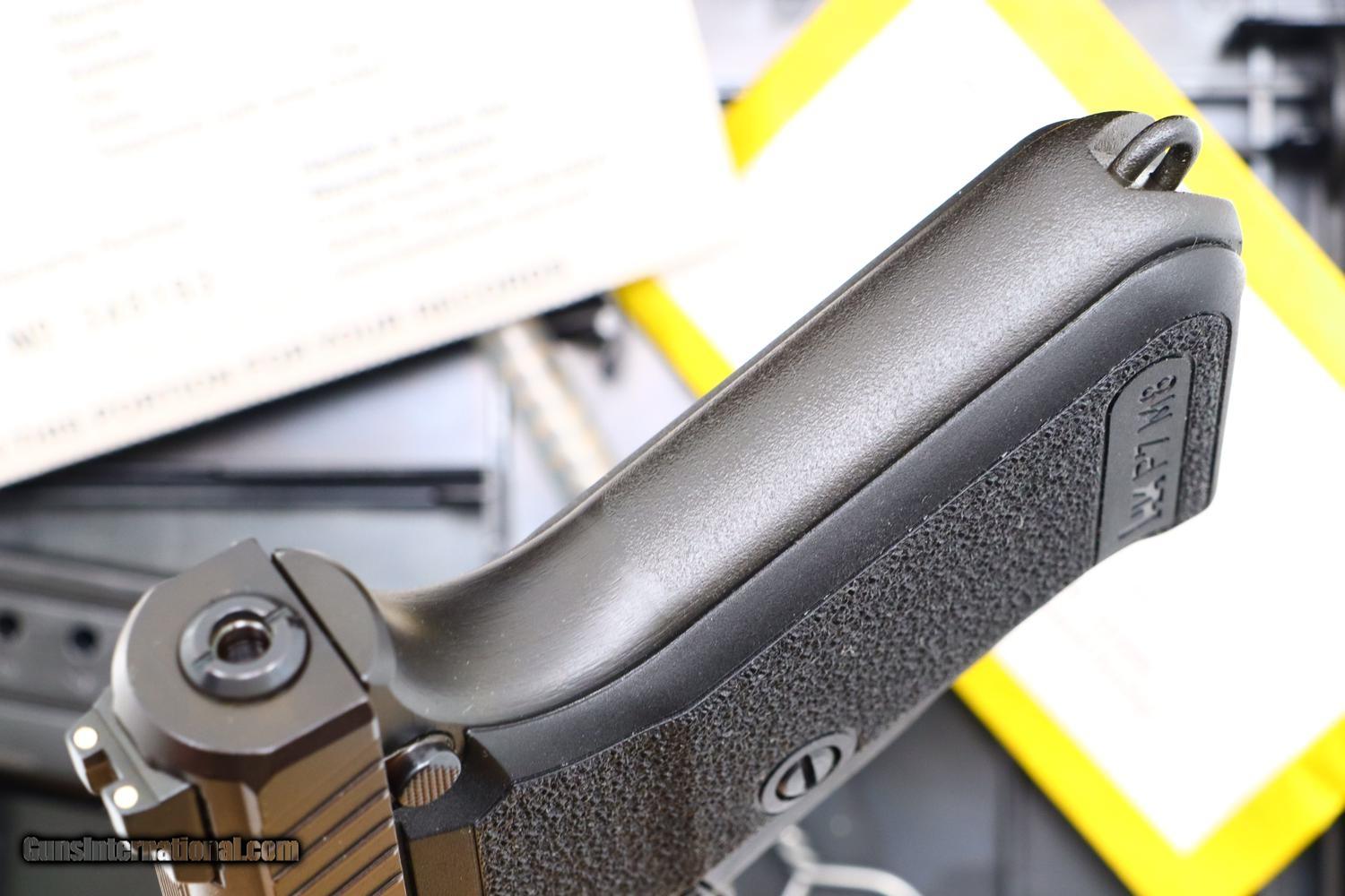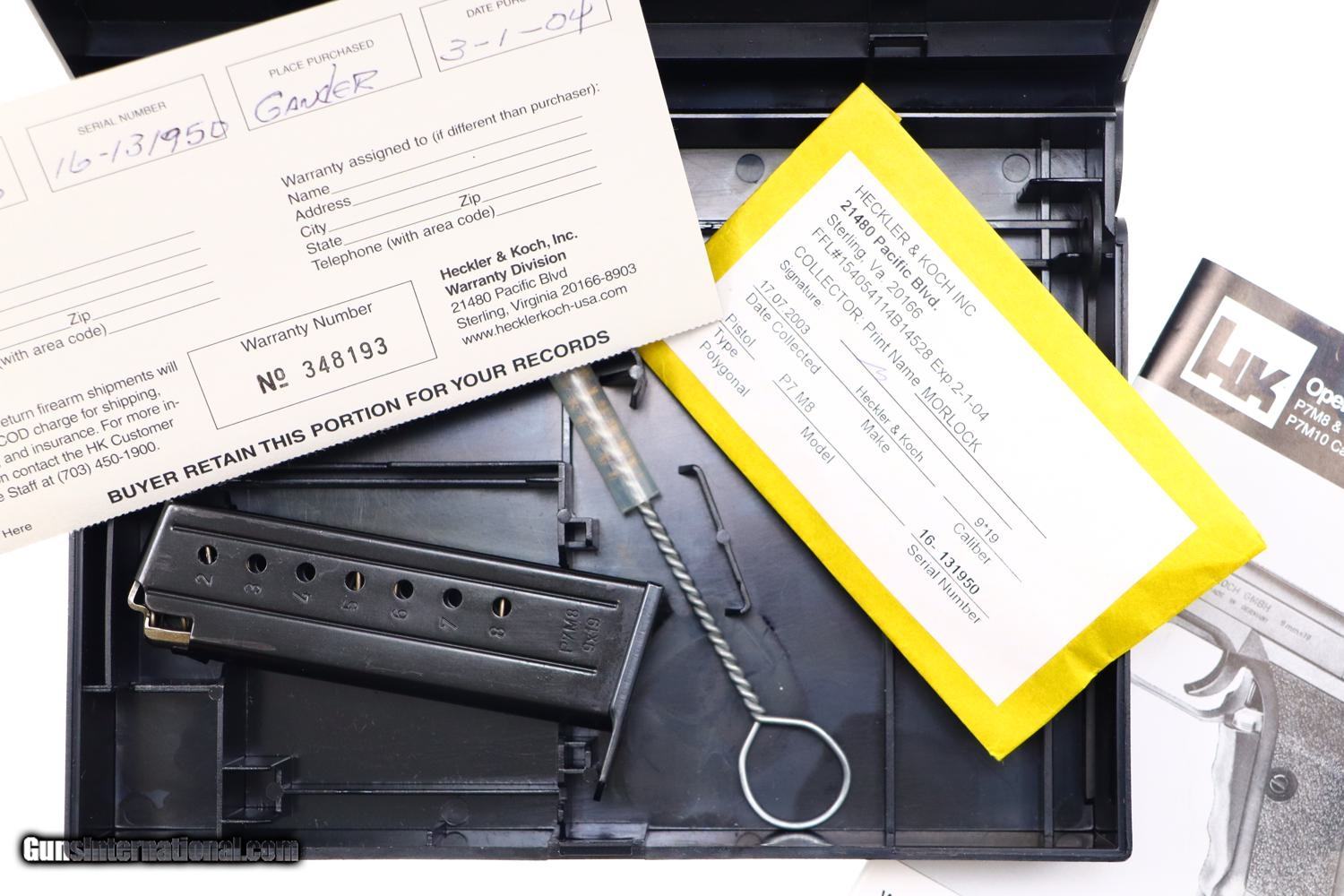 Description: Synopsis: AS NEW Heckler & Koch, H&K, P7M8, Boxed, 16-131950, FB01068 Description: Gorgeous H&K P7 M8 with 4.1 inch barrel and white-dotted night sights. Left side of slide with company address and caliber. Full serial number on the right side of slide and frame along with HK Inc. import marking and assembly code of “AD" reflecting proofing of 2003. Separate textured grips, the left panel marked “HK P7 M8”. Standard magazine release, both magazines drilled with 7 indicator holes sequentially numbered 2-8, the left side marked “P7M8 9x19". Complete with original matching black plastic factory shipping box with sleeved cleaning brush, takedown tool, instruction booklet, fired cartridge/envelope dated 07/2023 and warranty card reflecting original purchase in 03/2004. Condition: Pistol and magazines are as new. Similar consideration applies to box and all included components. Mirror bore. Perfect manual mechanics. The only way to upgrade would be to find and example with an unissued warranty card. A phenomenal ensamble by any metric! ~~Insured shipping fee of $75; most packages shipped using FedEx 2nd Day.~~ SOLD Manufacturer: Heckler & Koch Serial Number: 16-131950 Caliber Info: 9mmx19 |