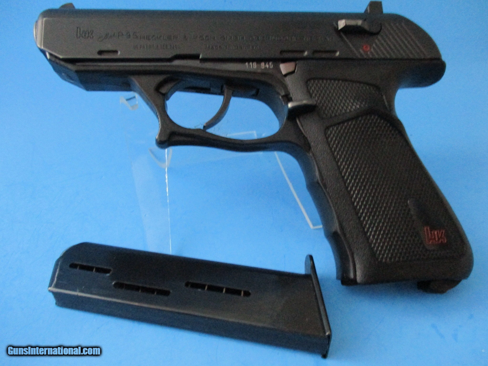 Description: Heckler & Koch HK H&K P9S “Combat” cal 9mm Luger Semi Automatic Pistol Make: Heckler & Koch Model: P9S Serial Number: 118845 Year of Manufacture: 1979 (Date Code HK) Caliber: 9 mm Luger Action Type: Double and Single Action with Removable Magazine. The decocker can be actuated to cock the hammer for a single action first shot Markings: The left side of the slide is marked with the HK logo, “Mod. P9S”, “Heckler & Koch GMBH Oberndorf/Neckar / US.Pat.No.3.566.745 Made In Germany” and its S/N “118845”. The left side of the frame is marked “118845“. The right side of the frame is marked with an “Eagle over N” proof, an “HK” date code and an “ULM antler” proof. The barrel is marked with an “Eagle over N” proof, “118845” and ”9 Para”. Barrel Length: 4 1/8” Sights / Optics: The tall front sight blade has a red vertical stripe and is dovetail set into the slide. The rear sight is a square notch with one white vertical stripe on each. Stock Configuration & Condition: The grip is one piece black checkered plastic that is screwed to the back strap in two places. The grip has a thumb rest on the left side and is also marked “HK” at the bottom in red letters. The back strap and areas bordering the checkering have a pebbled finish. The pistol is in 98% condition with only very tiny holster wear marks visible at edges. The grip rates in about Excellent overall condition. Type of Finish: The slide and frame have a black matte phosphate finish. The front strap/trigger guard is a black synthetic with pebbled finish. Finish Originality: Original Bore Condition: The bore is bright and the rifling is polygonal. There is no erosion in the bore Overall Condition: This handgun retains about 98% of its metal finish. Most of the wear is evident on the barrel from normal operation. There is some light edge wear to the slide, most are at the muzzle. It does not appear to be holster wear. The screw heads are sharp. The markings are clear. There is little wrong with the finish. Overall, this handgun rates in about Excellent condition, the barrel wear does not concern us. Mechanics: The single action trigger pull is crisp. The safety blocks the firing pin when engaged, allowing the hammer to fall without firing the pistol. The decocker serves to cock or un-cock the hammer as well as functioning as a slide release when fully depressed. To un-cock the hammer, the safety is engaged, the de-cocker depressed and the trigger then pulled and released while holding the de-cocker down. The pistol can be shot in single action only mode by swiveling the trigger stop in the trigger guard up until it blocks the trigger from going back far enough to cock and release the hammer. The single action trigger is light and very crisp, although with some take-up, as expected. You can adjust the trigger with the fine adjustment feature also found on this pistol. Box, Paperwork & Accessories: This pistol comes without box but with a German language Owner’s Manual. Extra original HK magazines are available. Our Assessment: This is a unique pistol with a multi-purpose decocker that can be used to cock and de-cock the hammer as well as release the slide. This pistol has barely a mark on it. It is great mechanical condition and it should be, as it was built with typical German reliability. A COLLECTOR’S ITEM NOW. SOLD Manufacturer: Heckler & Koch Model: P9S "Combat Serial Number: 118845 Barrel Length: 4.0 Condition: Excellent Metal Condition: Excellent Bore Condition: Excellent Barrel Type: Polygonal Action: DA/SA Weight: 875 gram [empty] Sights: Fixed Manufacture Date: 1979 Extras: Manual [in German] Item Location: Las Vegas NV |