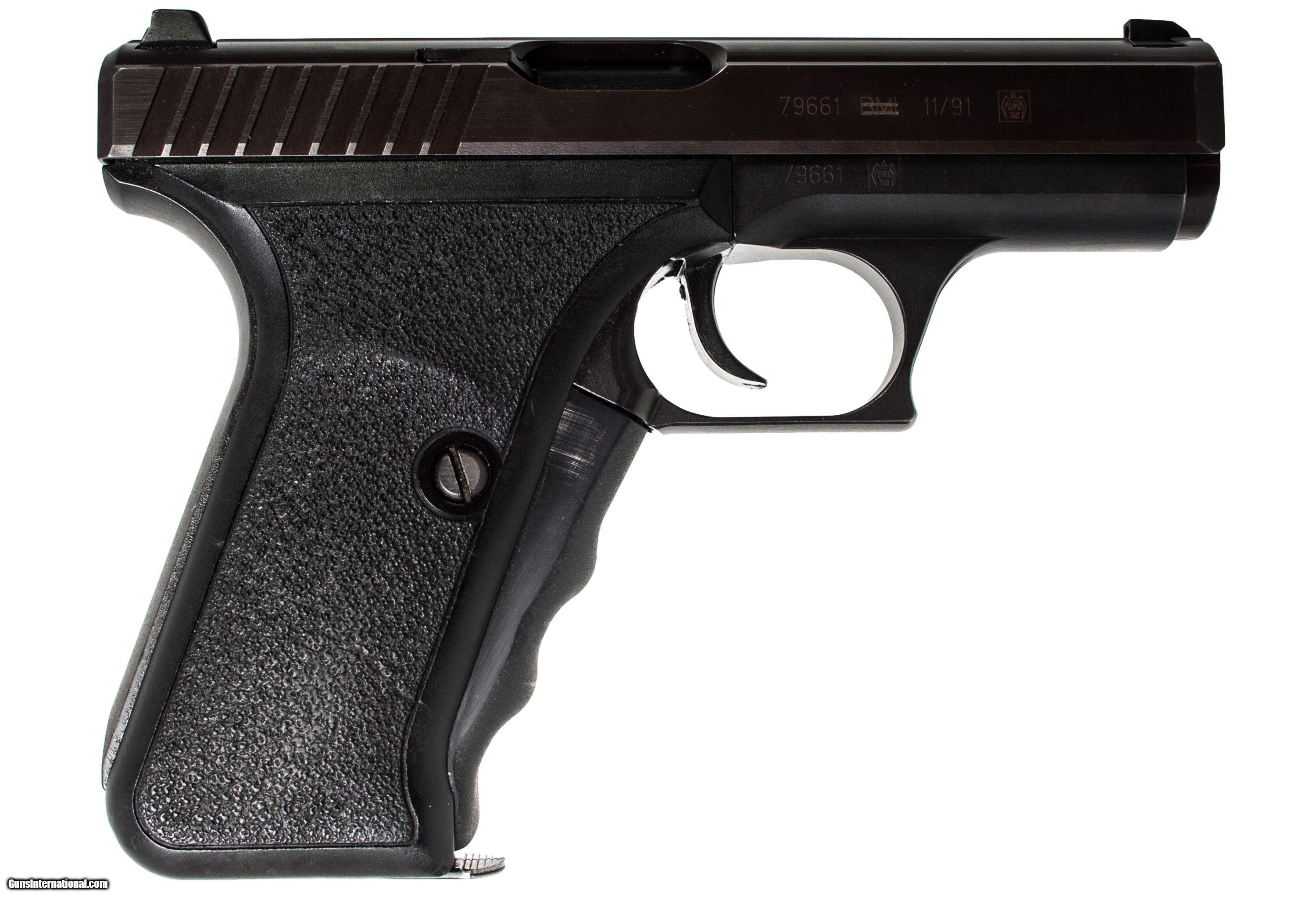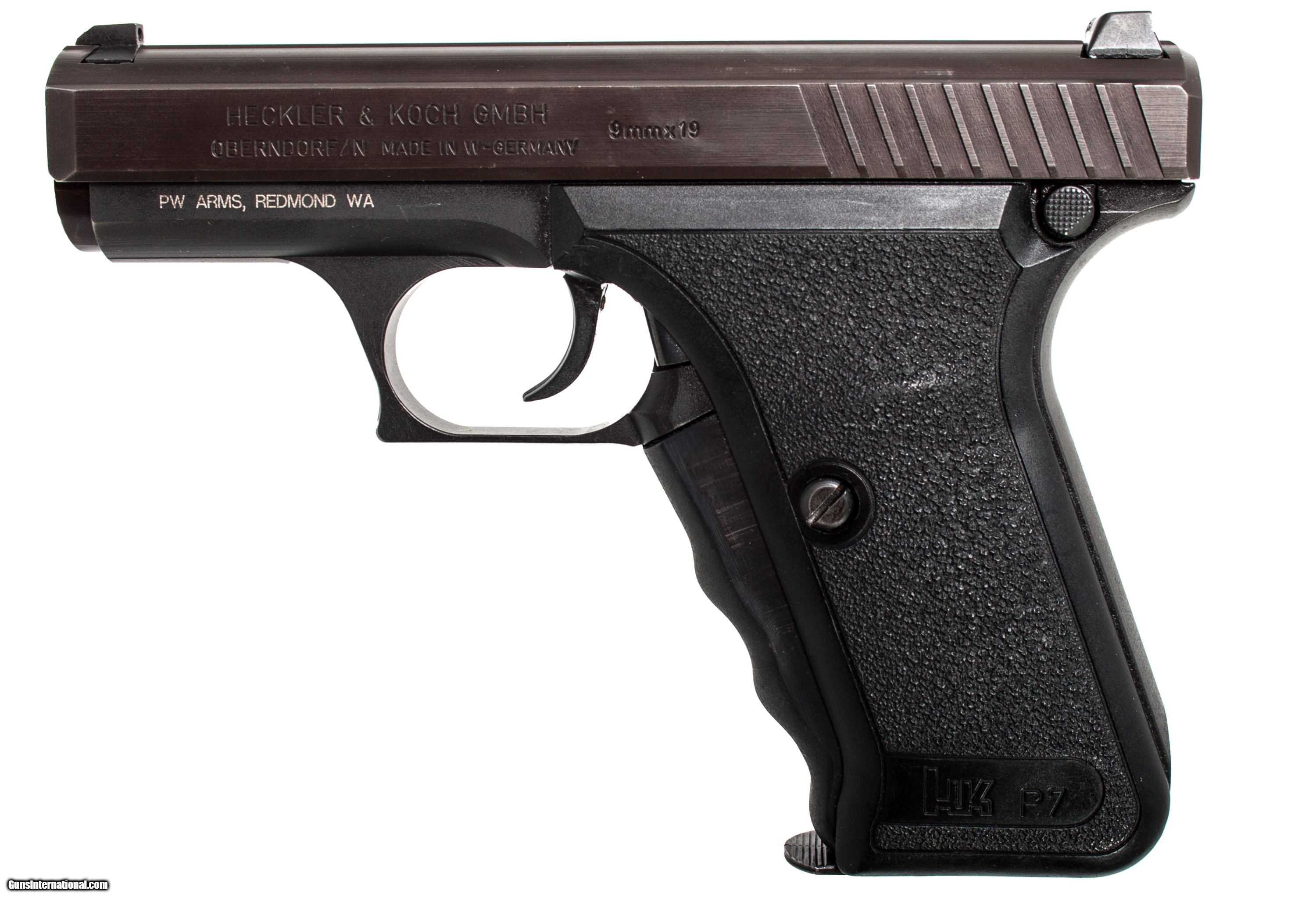 H&K P7 chambered in 9 mm with a 4 inch barrel and a case. This gun is in excellent condition and is covered by Dury's Lifetime Warranty.