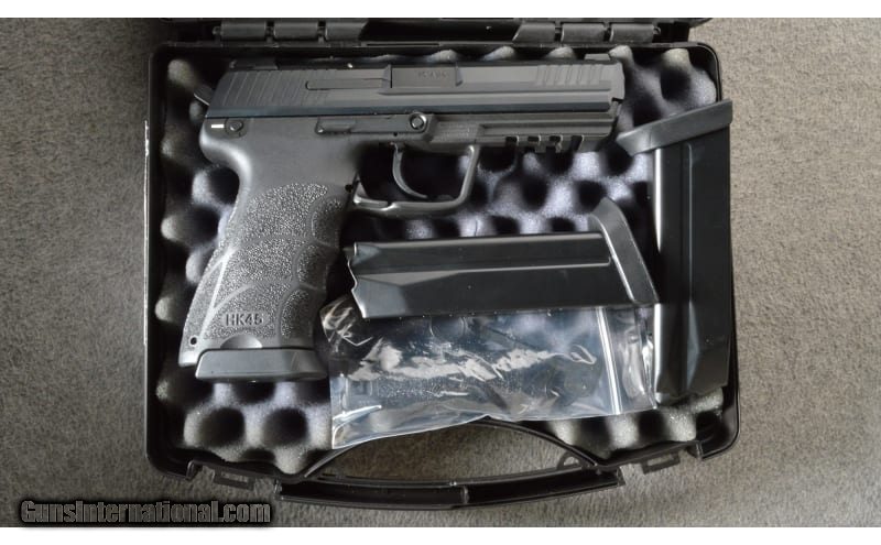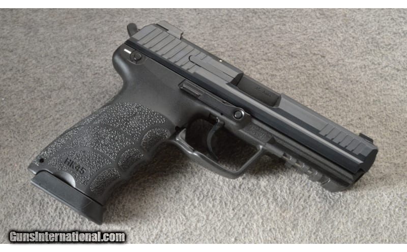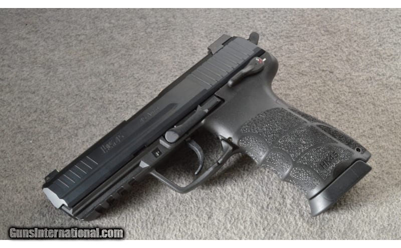 Description: Heckler & Koch HK45 chambered in .45 ACP. This pistol features a 4.4" barrel, 10 round capacity, 3-dot Tritium night sights, paddle magazine release, ambidextrous slide stop, frame safety/decocker, bottom picatinny rail, and a black finish. Includes three 10 round magazines, alternate backstraps, cable lock, owner's manual, matched factory hard case. This gun appears lightly used with light scuffing on the barrel hood. .45 Auto SOLD Chambers: 10+1 semi auto. Metal Condition: 99%. Bore Condition: Like new. Barrels: 4.5" barrel. Triggers: SA/DA. Weight: 2 lbs Sights: Night sights. Item Location: Owatonna, MN |