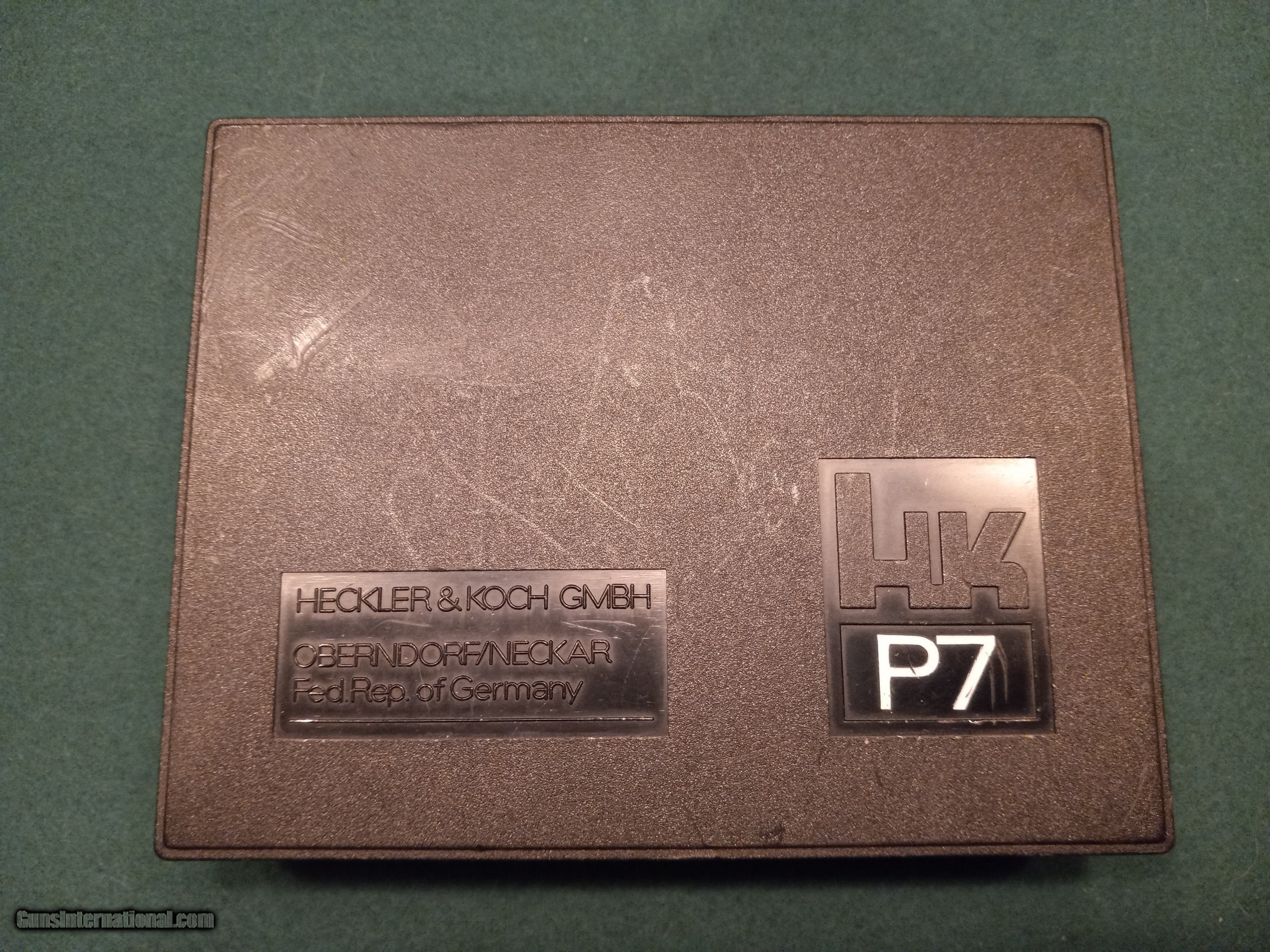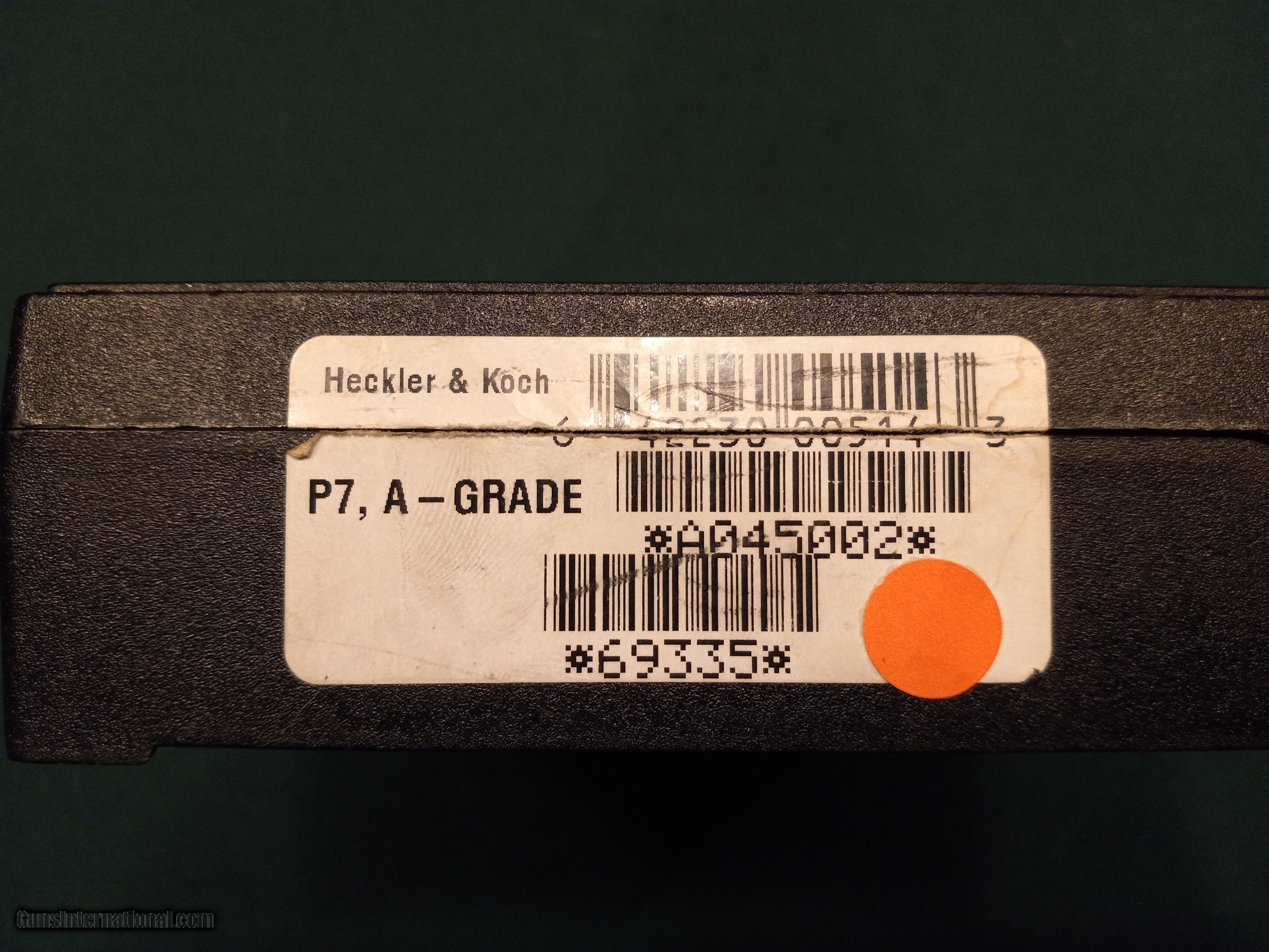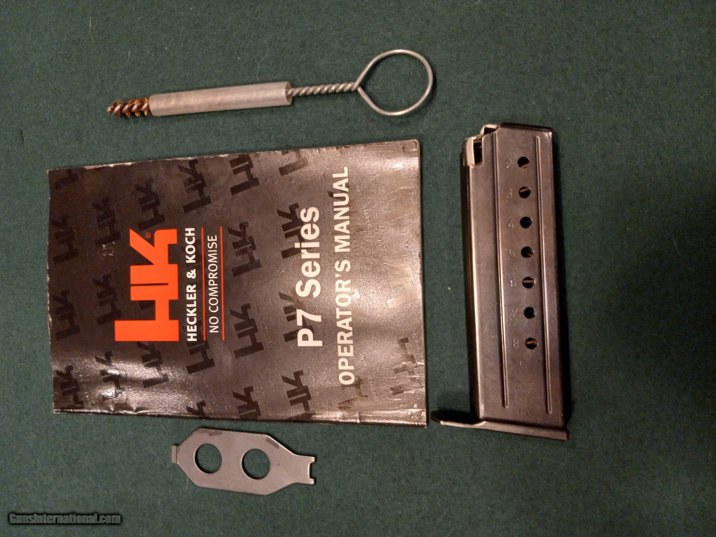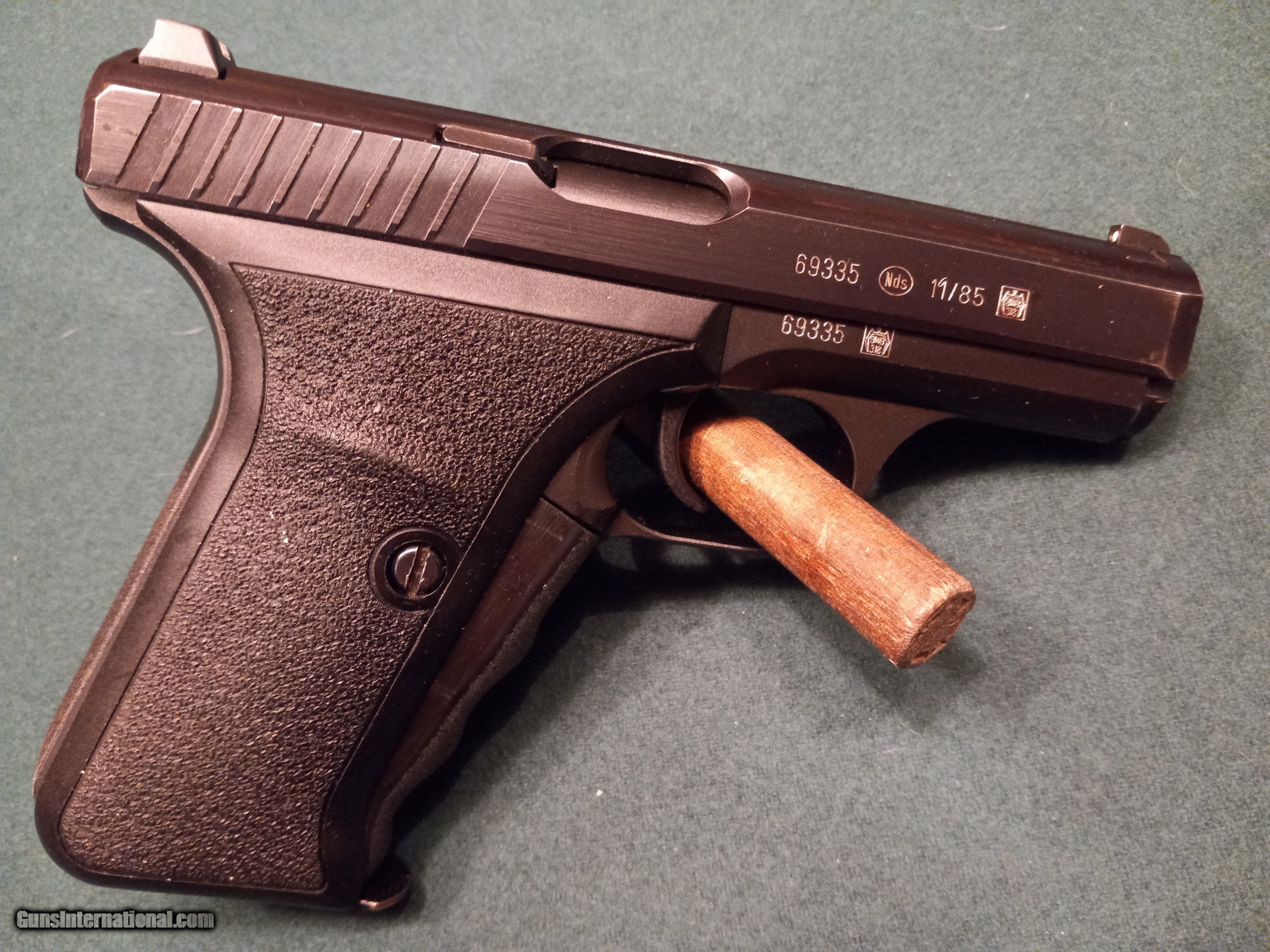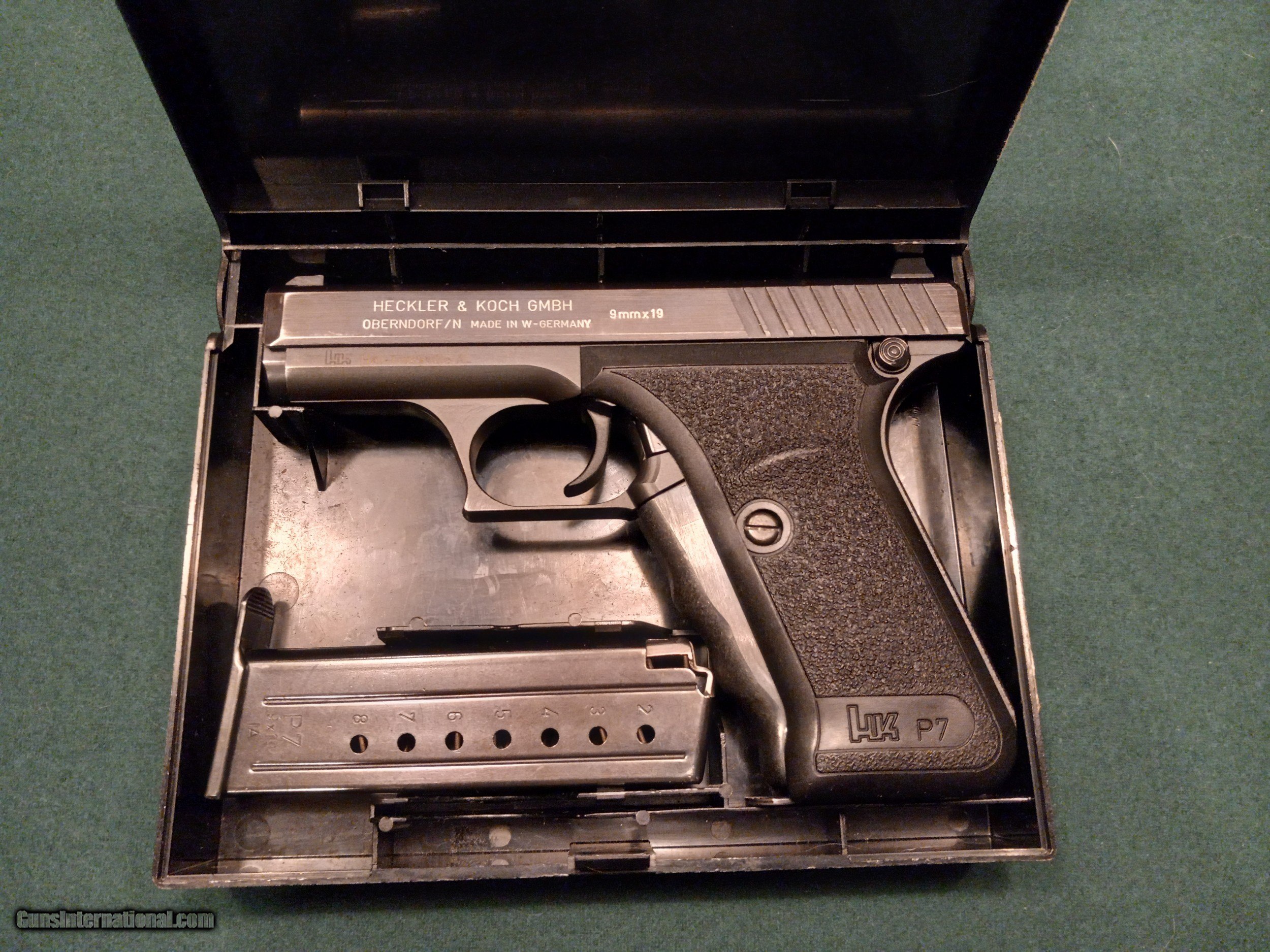 Description: H&K Model P7 PSP. (SOLD) Semi auto pistol. Cal 9mm. 4.1” barrel Manufactured 1985. Used by German Police and Army special units. AS NEW in original box with matching numbers, original instruction booklet, cleaning brush, 2 magazines, disassembly tool. Box is in excellent condition. Pistol does have very slight high edgewear at muzzle, front and rear sight from being in box. Gun does not appear to have been fired. These pistols have continued to increase in value and this one is complete and perfect. Serial # 69335. SOLD |