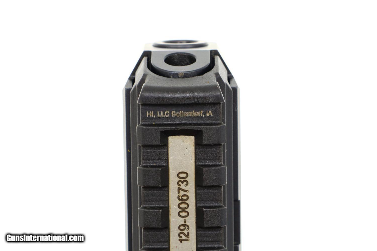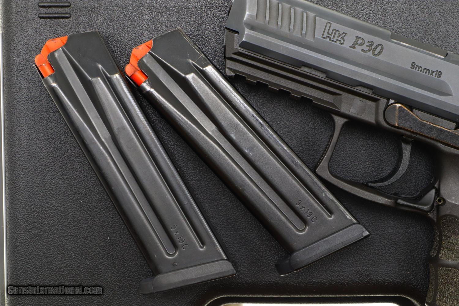 Standard configuration H&K P30, DAO, 9mmP, with usual H&K markings except for the Basel canton shield on the right side of the slide that has red and white dotted sight highlights. Matching barrel and slide. Owners manual warning molded on lower trigger guard. Ergonomic grips with finger grooves and textured panels, the left panel marked with the encircled P30. Complete with two original high capacity magazines, each with a red follower and zippered spine marked with 6 indicator holes numbered 4, 6, 8, 10, 13, 15. Generic black plastic case.