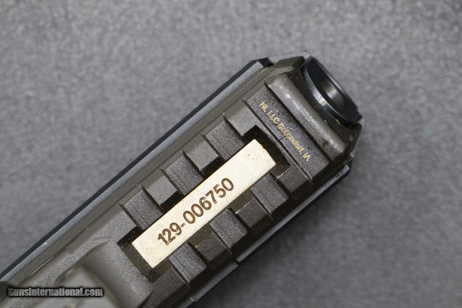 Description: Synopsis: H&K P30 Pistol, Basel Police Contract, Case, Spare Magazine, 129-006750, I-1251 Description: Standard configuration H&K P30, DAO, 9mmP, with usual H&K markings except for the Basel canton shield on the right side of the slide that has red and white dotted sight highlights. Matching barrel and slide. Owners manual warning molded on lower trigger guard. Ergonomic grips with finger grooves and textured panels, the left panel marked with the encircled P30. Complete with two original high capacity magazines, each with a red follower and zippered spine. Both marked with 6 indicator holes numbered 4, 6, 8, 10, 13, 15. Complete with generic black plastic case. No literature or other accessories. Condition: Near EXC original condition, the pistol showing only the sharp edge wear as one might expect from light service use. Comparable condition grips. Magazines with insertional wear as photographed. Mirror bore. Perfect manual mechanics with each magazine. SOLD Manufacturer: Heckler & Koch Model: P30 Serial Number: 129-006750 Caliber Info: 9mmP Condition: EXC |