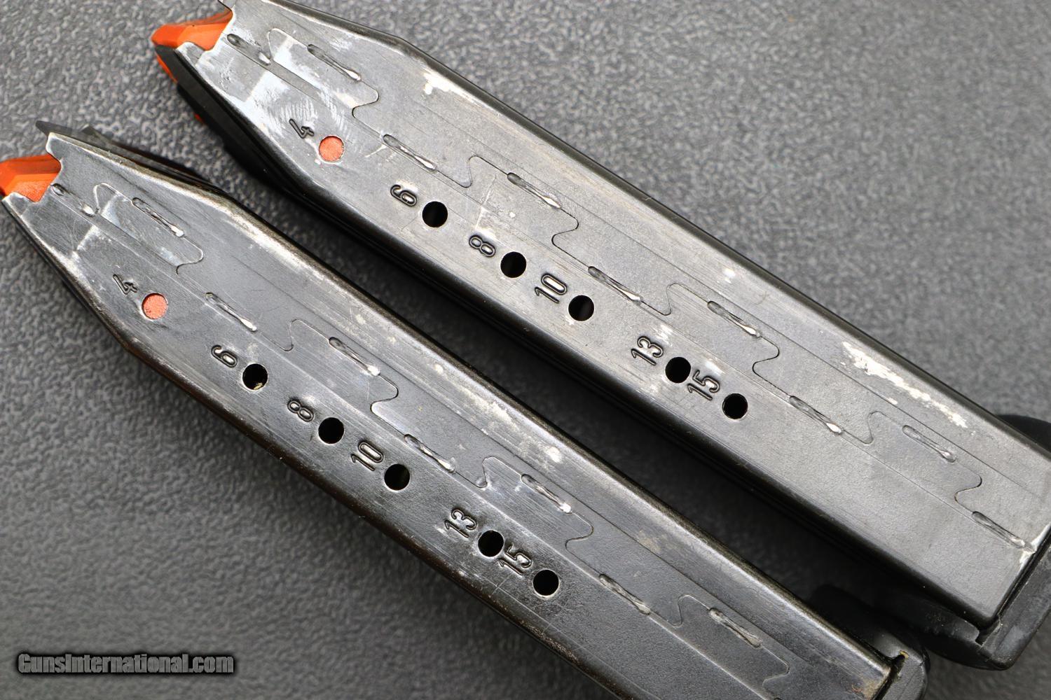 Near EXC original condition, the pistol showing only the sharp edge wear as one might expect from light service use. Comparable condition grips. Magazines with insertional wear as photographed. Mirror bore. Perfect manual mechanics with each magazine.