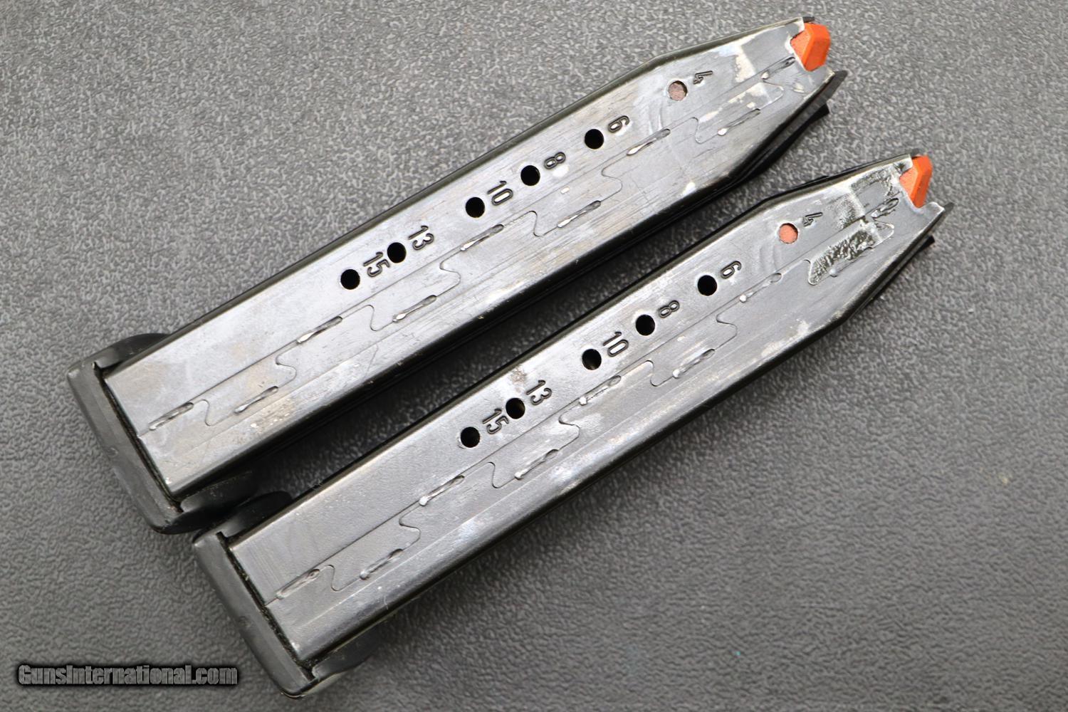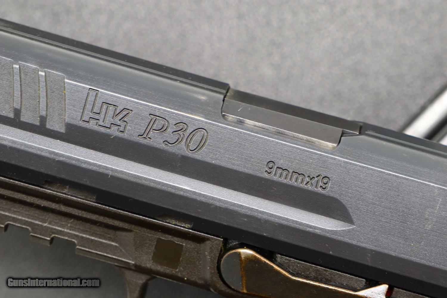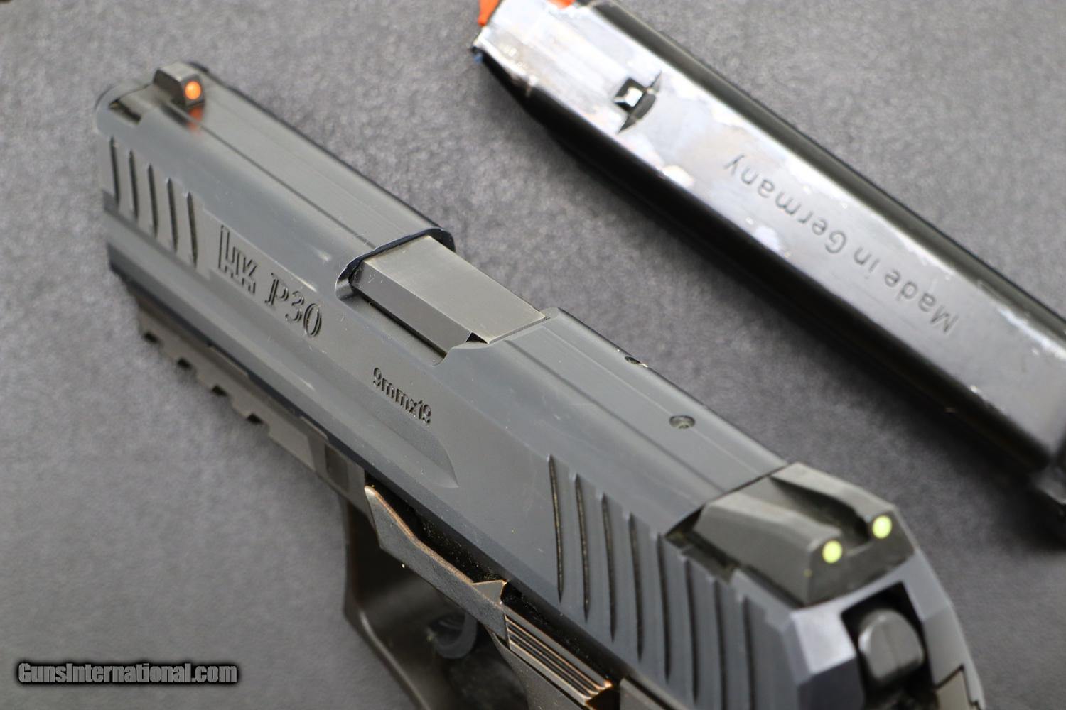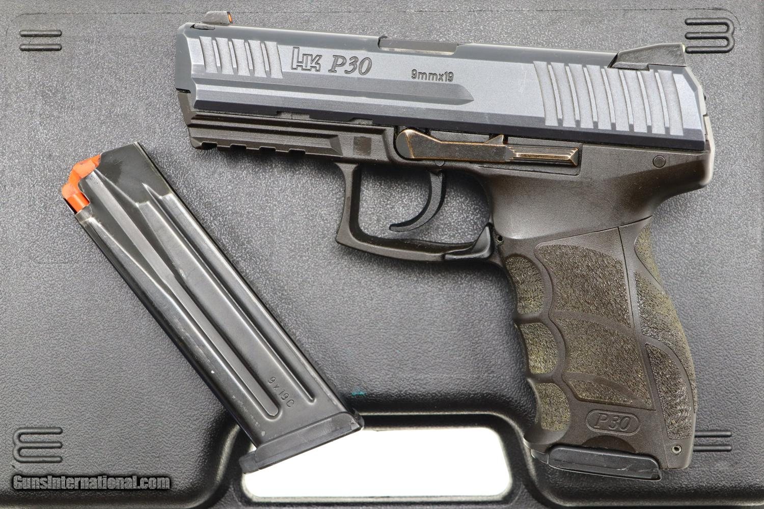 Description: Synopsis: H&K P30 Pistol, Basel Police Contract, Case, Spare Magazine, 129-006722, I-1252 Description: Standard configuration H&K P30, DAO, 9mmP, with usual H&K markings except for the Basel canton shield on the right side of the slide that has red and white dotted sight highlights. Matching barrel and slide. Owners manual warning molded on lower trigger guard. Ergonomic grips with finger grooves and textured panels, the left panel marked with the encircled P30. Complete with two original high capacity magazines, each with a red follower and zippered spine. Both marked with 6 indicator holes numbered 4, 6, 8, 10, 13, 15. Complete with generic black plastic case. No literature or other accessories. Condition: Near EXC original condition, the pistol showing only the sharp edge wear as one might expect from light service use. Comparable condition grips. Magazines with insertional wear as photographed. Mirror bore. Perfect manual mechanics with each magazine. ~~Insured shipping fee of $55; most packages shipped using FedEx 2nd Day.~~ SOLD Manufacturer: Heckler & Koch Serial Number: 129-006722 Caliber Info: 9mmP |