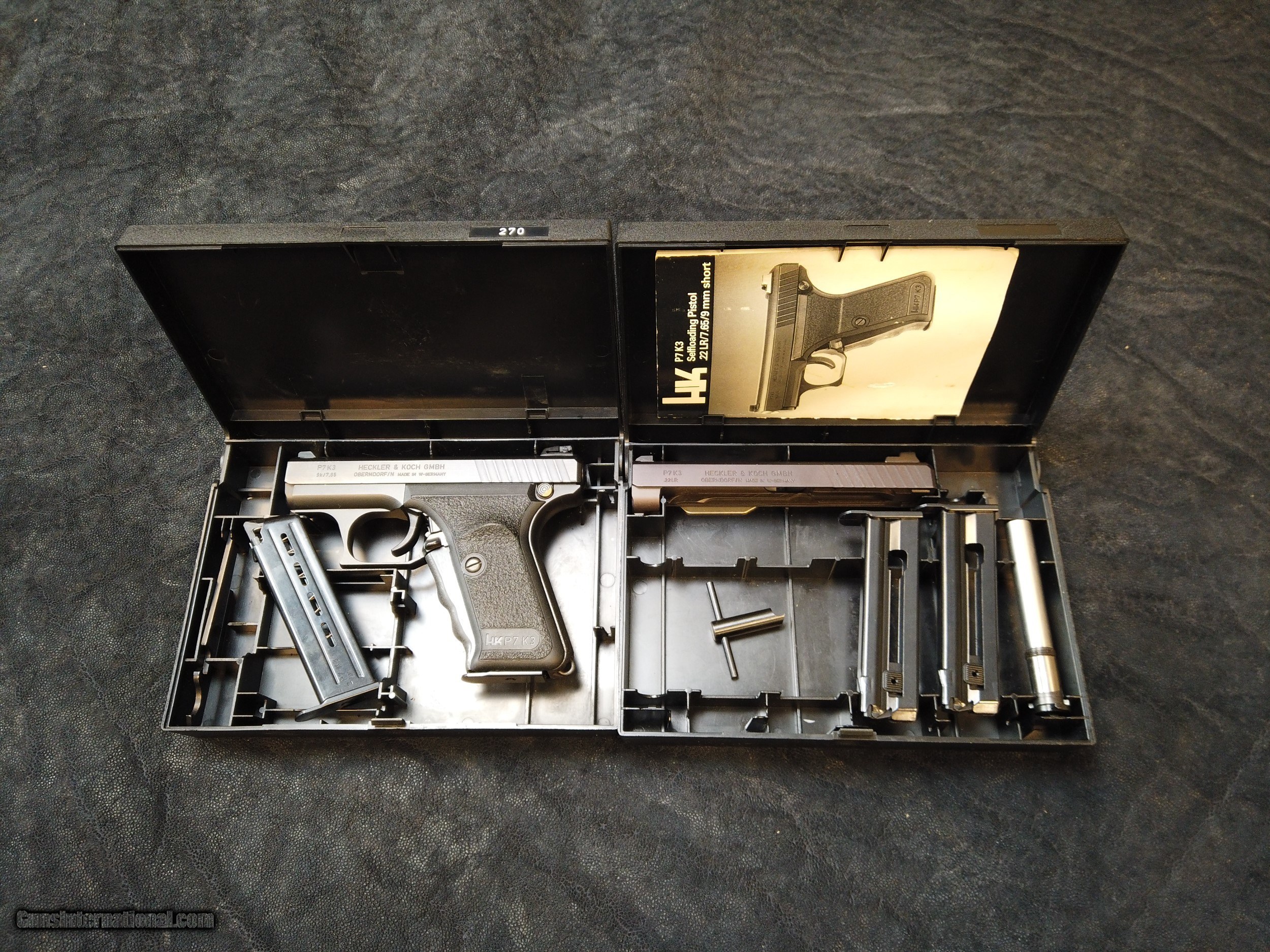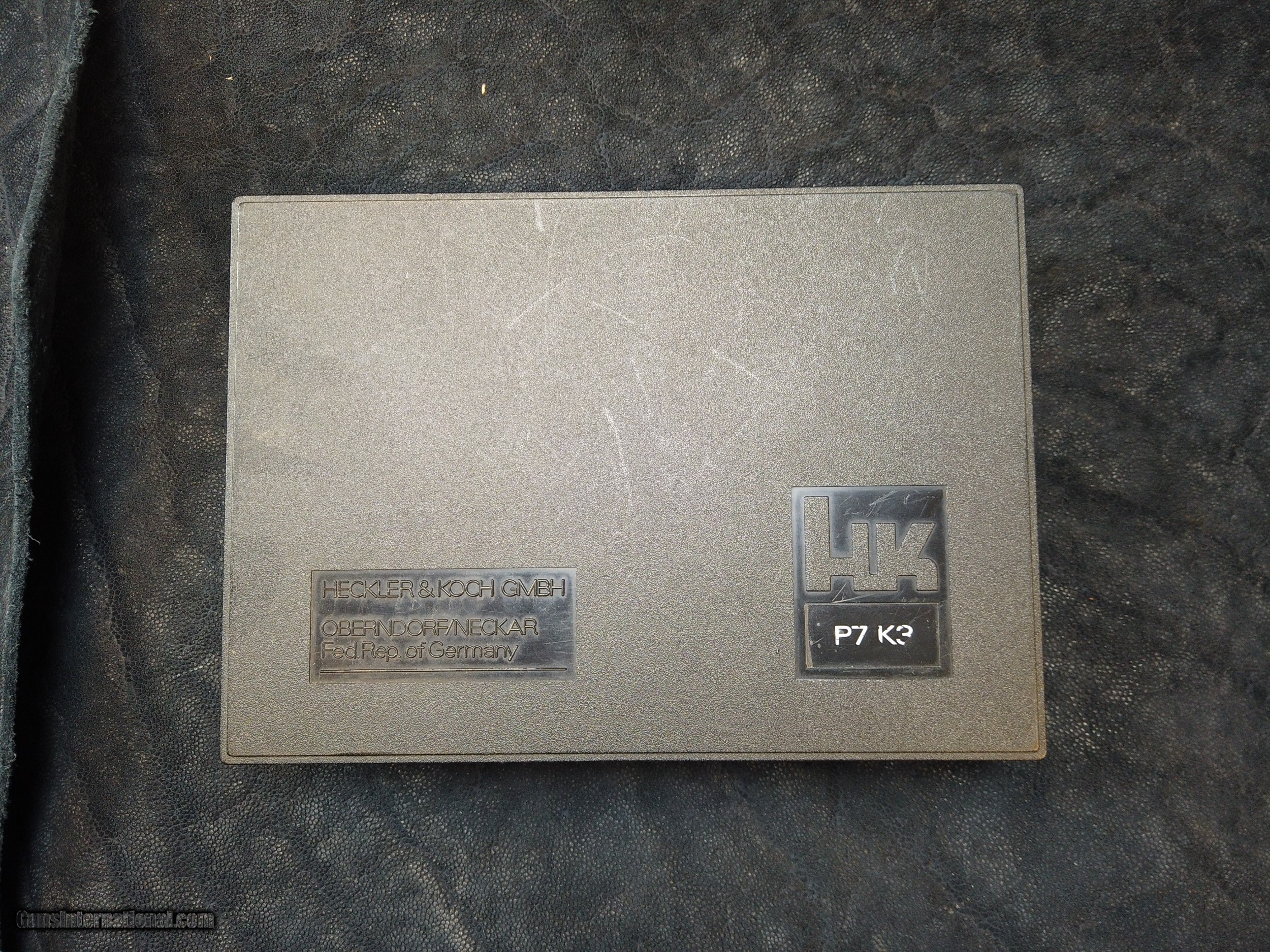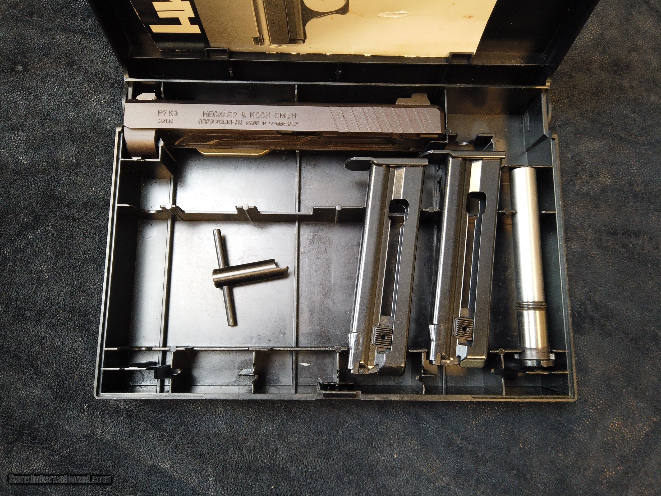 Description: Hard to Find Heckler & Kock P7 K3 in 7.65 x 9mm Short & 22 LR two barrel set. Each caliber comes with two mags and tool set. SOLD |