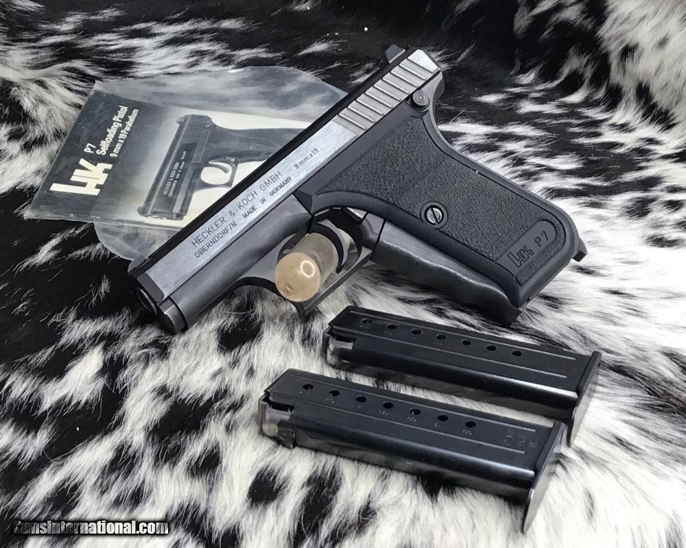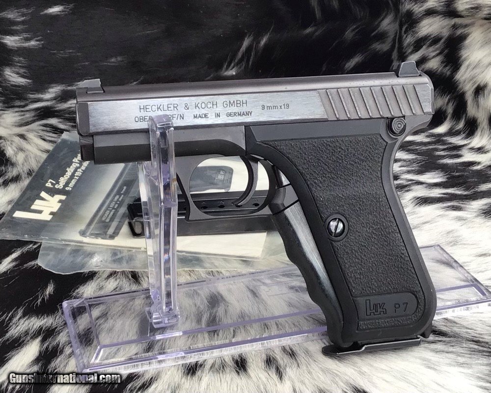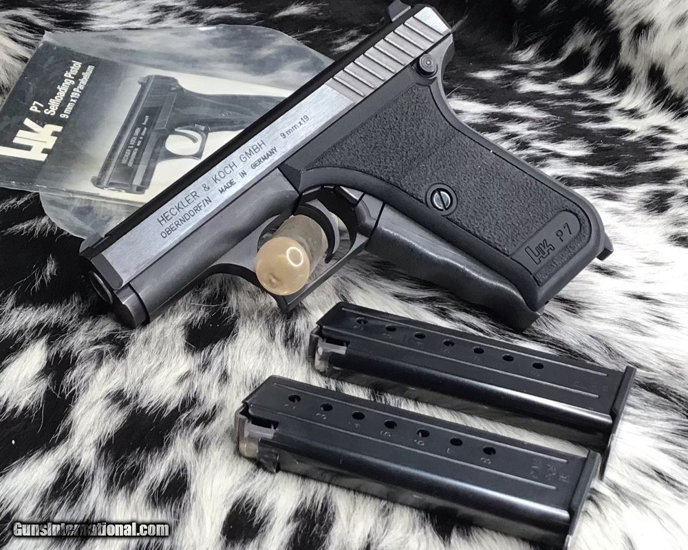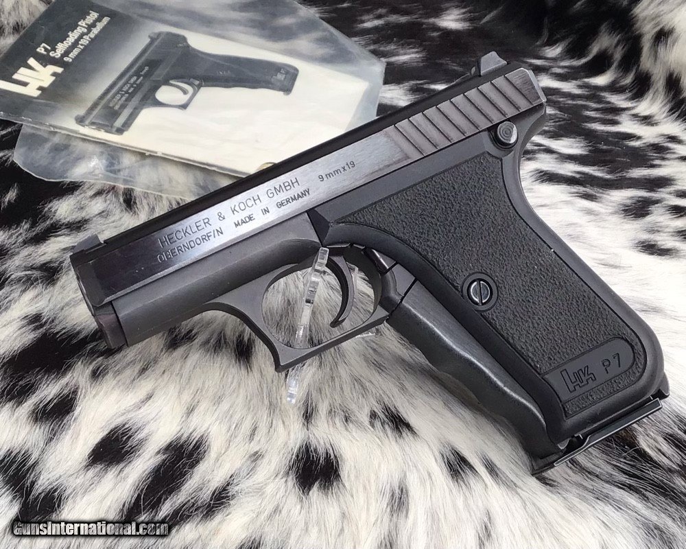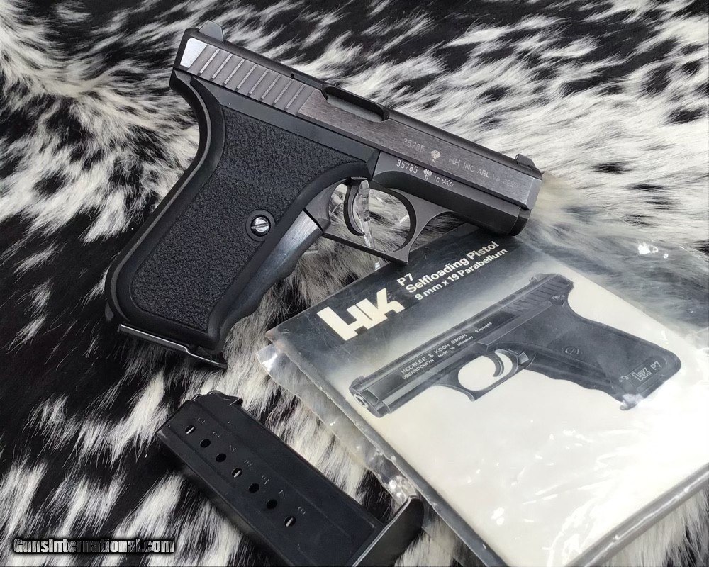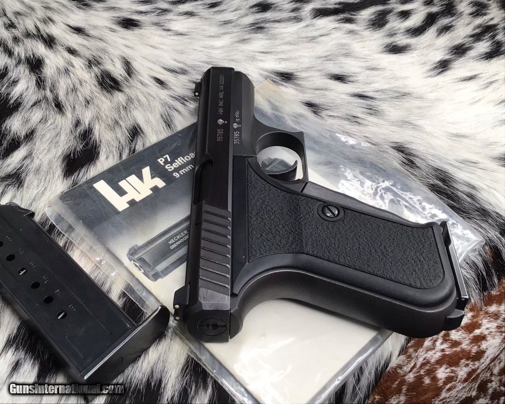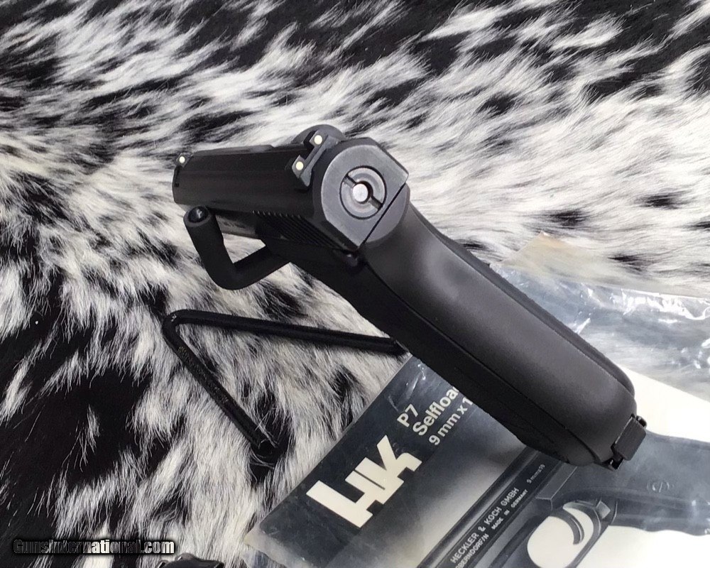 Description: The Heckler & Koch P7 is a German 9×19mm semi-automatic pistol designed by Helmut Weldle and produced from 1979 to 2008 by Heckler & Koch GmbH (H&K). It was revealed to the public for the first time in 1976 as the PSP (Polizei-Selbstlade-Pistole—"police self-loading pistol") Also Known as the H&K squeeze cocker here in the frozen North. This 9mm pistol is in excellent original finish condition with factory manual. Gun appears to have been used very little by its condition. With the fixed barrel it is a very accurate carry gun with many safety features designed into the pistol. Long out of production model because of the high cost of manufacture. A great addition to any collection as well as an investment firearm that will only go up in value. Comes with two mags, manual and generic hard case. Add 3% if paying with credit card. Free shipping for US veterans. God Bless America from a proud American, and a Viet Nam Vet , thankful for our freedoms.. paid for by the Blood ,Sweat and Tears of our brave men and women in uniform. Ten Below Firearms is a Veteran owned and operated business. We specialize in out of production models of high quality firearms. We love to ship! If you are out of state or can't make it to our store, just give us a call! Handguns normally ship for $30 and Long guns for $40 to $65 for extra length long guns. That's 2-3 day USPS Priority shipping, Delivery conformation and with tracking number. Optional Postal insurance is additional $1.70 per $100 and highly recommended. We are OPEN BY APPOINTMENT ONLY FOR IN PERSON VISITS Layaway:If needed we offer a 60 day layaway program. Terms, 1/3 of purchase price down, 1/3 due in 30 days, and the final third to include card fees and shipping due at 60 days. Funds are non transferable and non refundable .Layaway is not available on negotiated prices. SOLD Handgun Caliber: 9x19mm Parabellum (9mm Luger, 9x19mm NATO) Manufacturer: Heckler and Koch Model: P7 PSP Serial Number: 35785 Barrel Length: 4.1 inch Condition: Excellent Metal Condition: Excellent Bore Condition: Excellent Action: Semi auto Finish: Black Manufacture Date: 1985 Case: Generic hardcase Item Location: Mn |