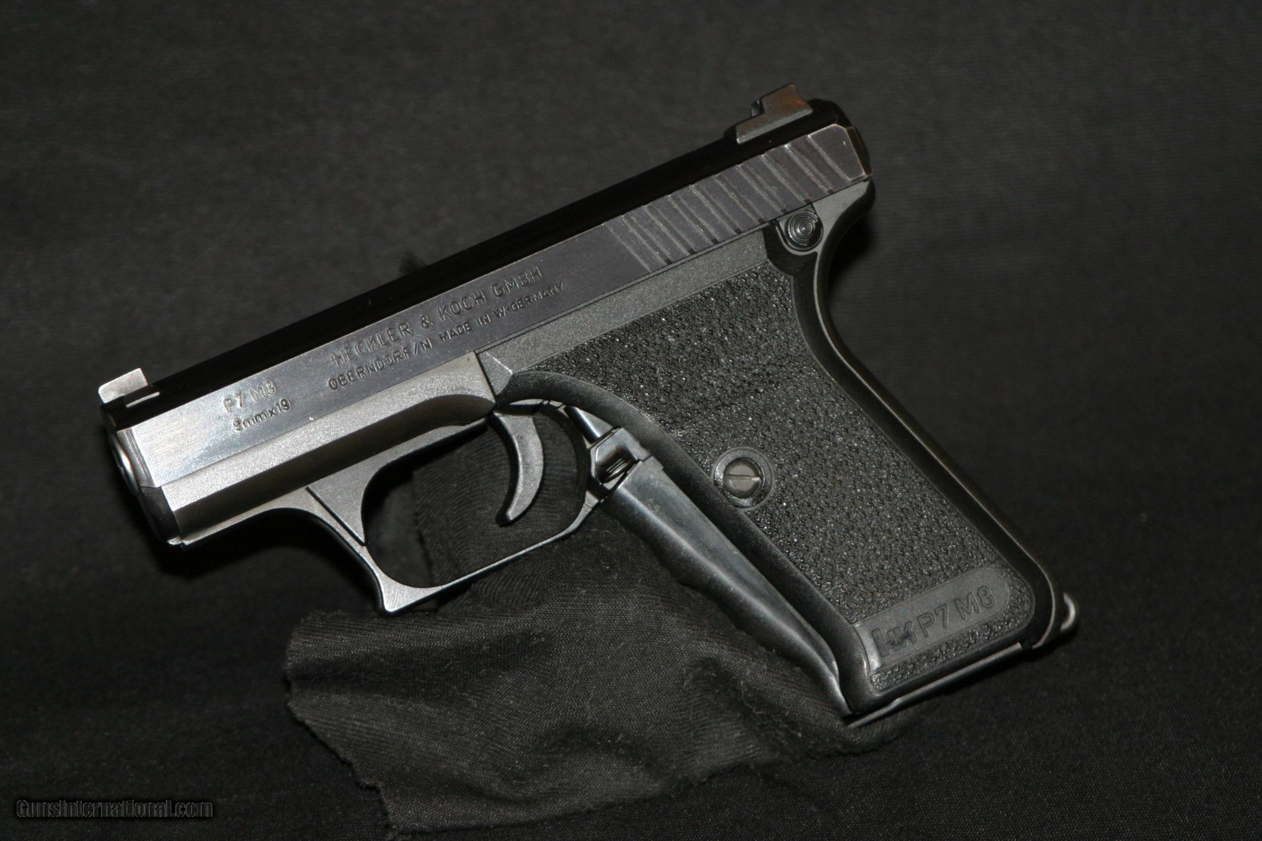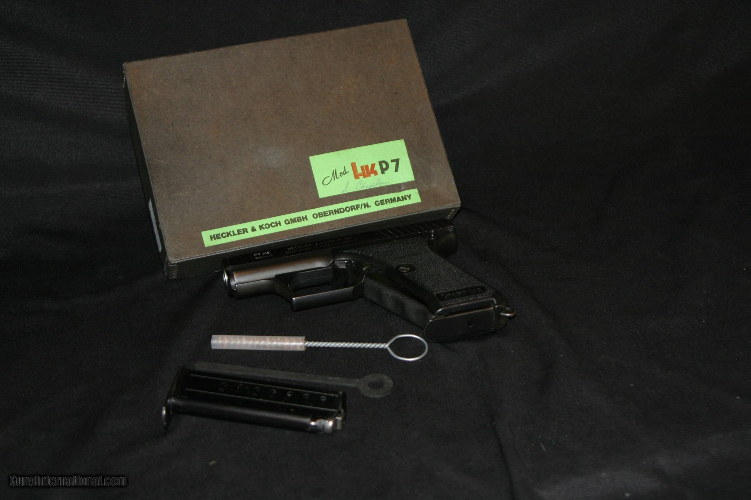 Description: AS NEW IN BOX, H&K P7M8 SQUEEZE COCKING ACTION IN 9MM,COMES WITH BOX,TWO MAGS AND TOOLS. SOLD |