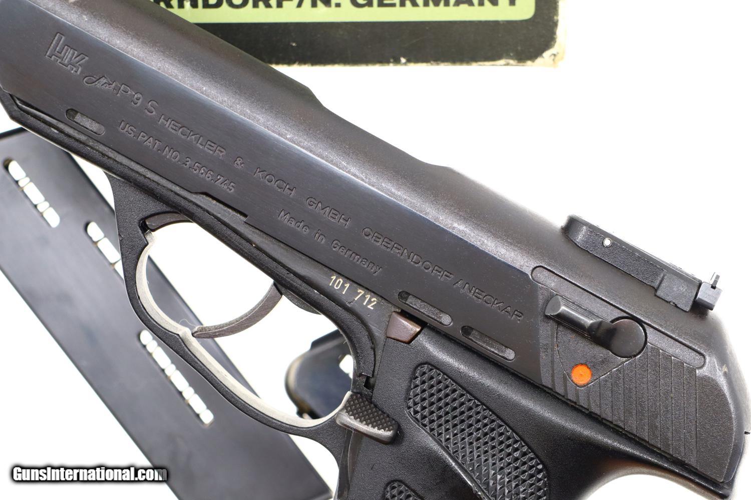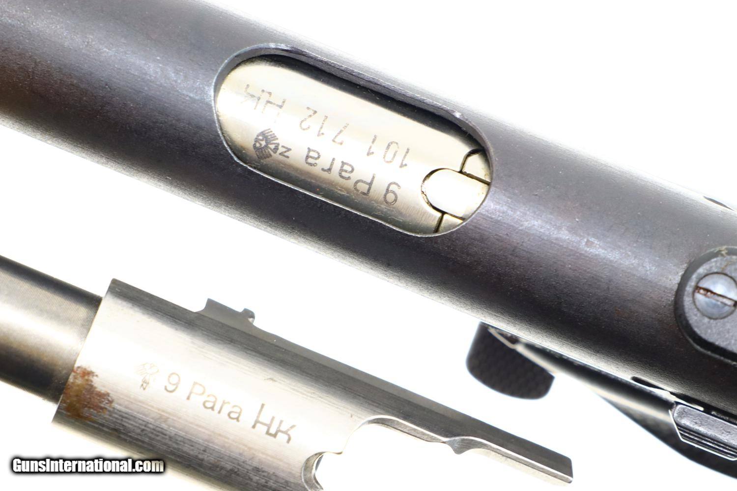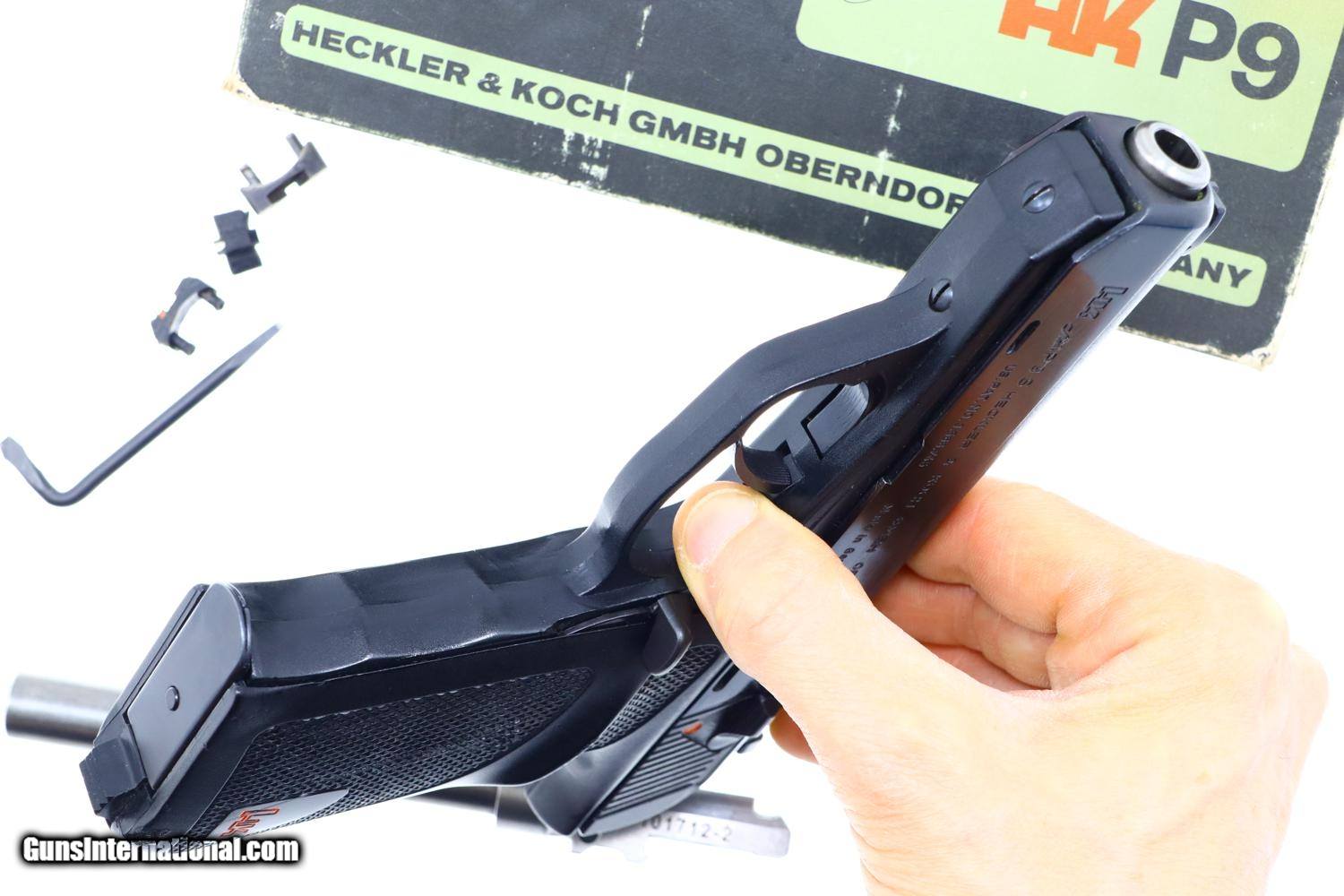 Description: Early H&K P9S in 9mmP with polished slide and fully matching slide, barrel and frame, fitted with drift adjustable front sight and fully adjustable target rear sight. Standard P9S grip with red outlined “H&K” on left side, the single piece grip secured to the frame with two slotted screws on rear spine. Primary and spare magazines unmarked. Complete with spare, matching, extended barrel “KE” proofed (1994) along with replaced front and rear sights, take down tool and factory box. Synopsis: Scarce H&K P9S, 9mmP, Early Production, Spare Barrel, Parts, Boxed Condition: VG+, approximately 97%, with superficial scuffs as carefully pictured. Comparable condition grip and magazines. Scuffed box with oil darkened styrofoam insert. Primary and spare barrel with mirror bores. Perfect manual mechanics. A difficult to find H&K, particularly with a spare, matching, extended barrel. ~~Insured shipping fee of $65; most packages shipped using FedEx 2nd Day.~~ SOLD Manufacturer: Heckler & Koch Serial Number: 101712 Caliber Info: 9mmP |