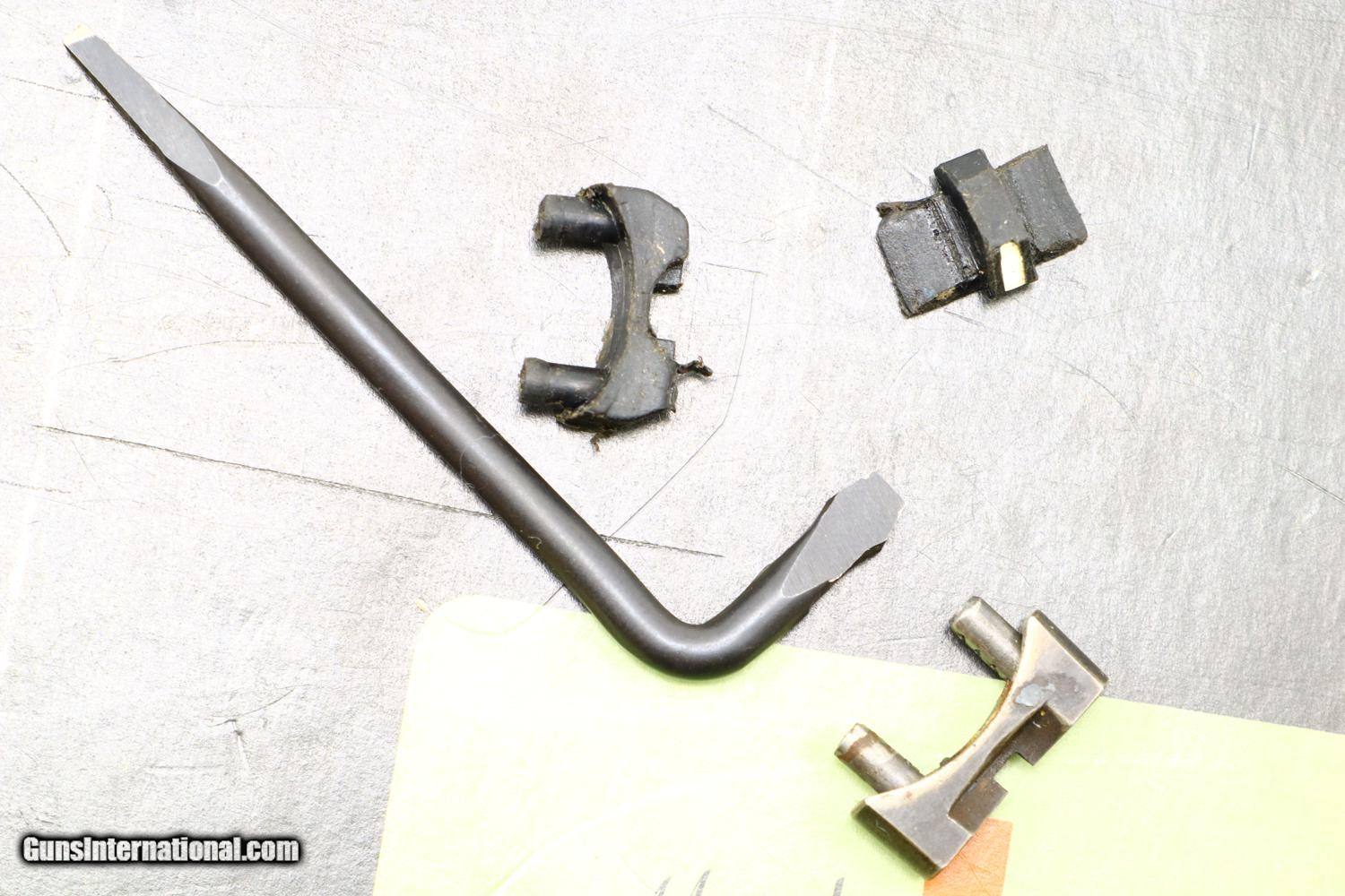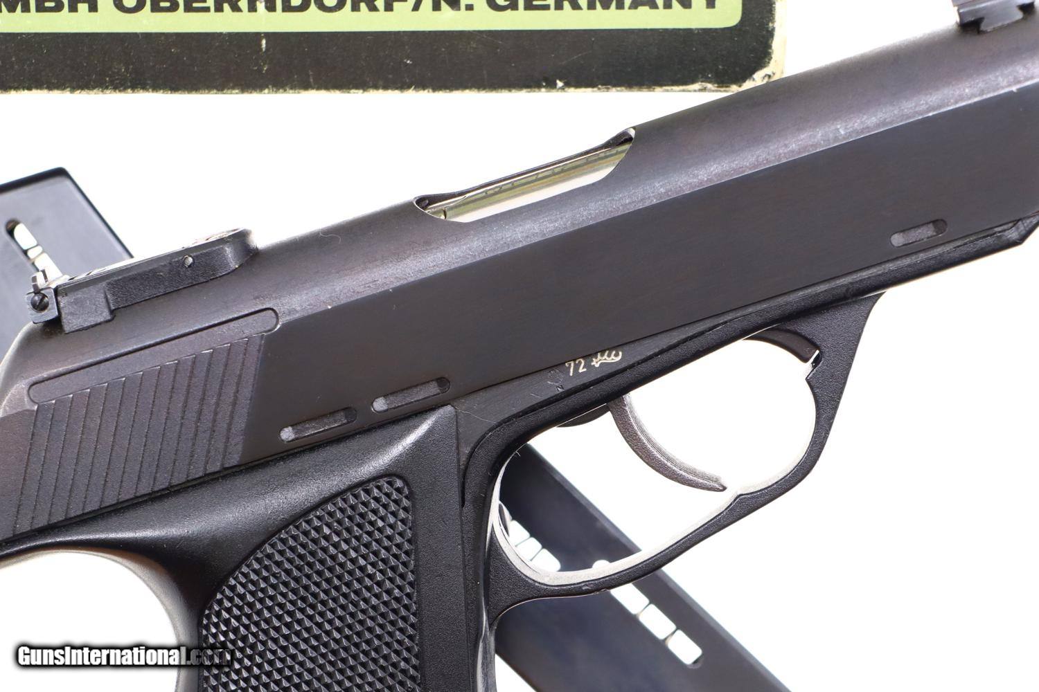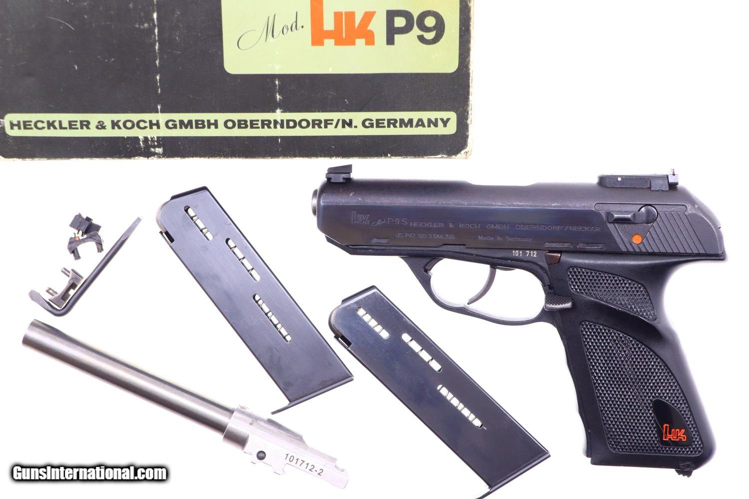 Description: Early H&K P9S in 9mmP with polished slide and fully matching slide, barrel and frame, fitted with drift adjustable front sight and fully adjustable target rear sight. Standard P9S grip with red outlined “H&K” on left side, the single piece grip secured to the frame with two slotted screws on rear spine. Primary and spare magazines unmarked. Complete with spare, matching, extended barrel “KE” proofed (1994) along with replaced front and rear sights, take down tool and factory box. Synopsis: Scarce H&K P9S, 9mmP, Early Production, Spare Barrel, Parts, Boxed Condition: VG+, approximately 97%, with superficial scuffs as carefully pictured. Comparable condition grip and magazines. Scuffed box with oil darkened styrofoam insert. Primary and spare barrel with mirror bores. Perfect manual mechanics. A difficult to find H&K, particularly with a spare, matching, extended barrel. ~~Insured shipping fee of $65; most packages shipped using FedEx 2nd Day.~~ SOLD Manufacturer: Heckler & Koch Serial Number: 101712 Caliber Info: 9mmP |