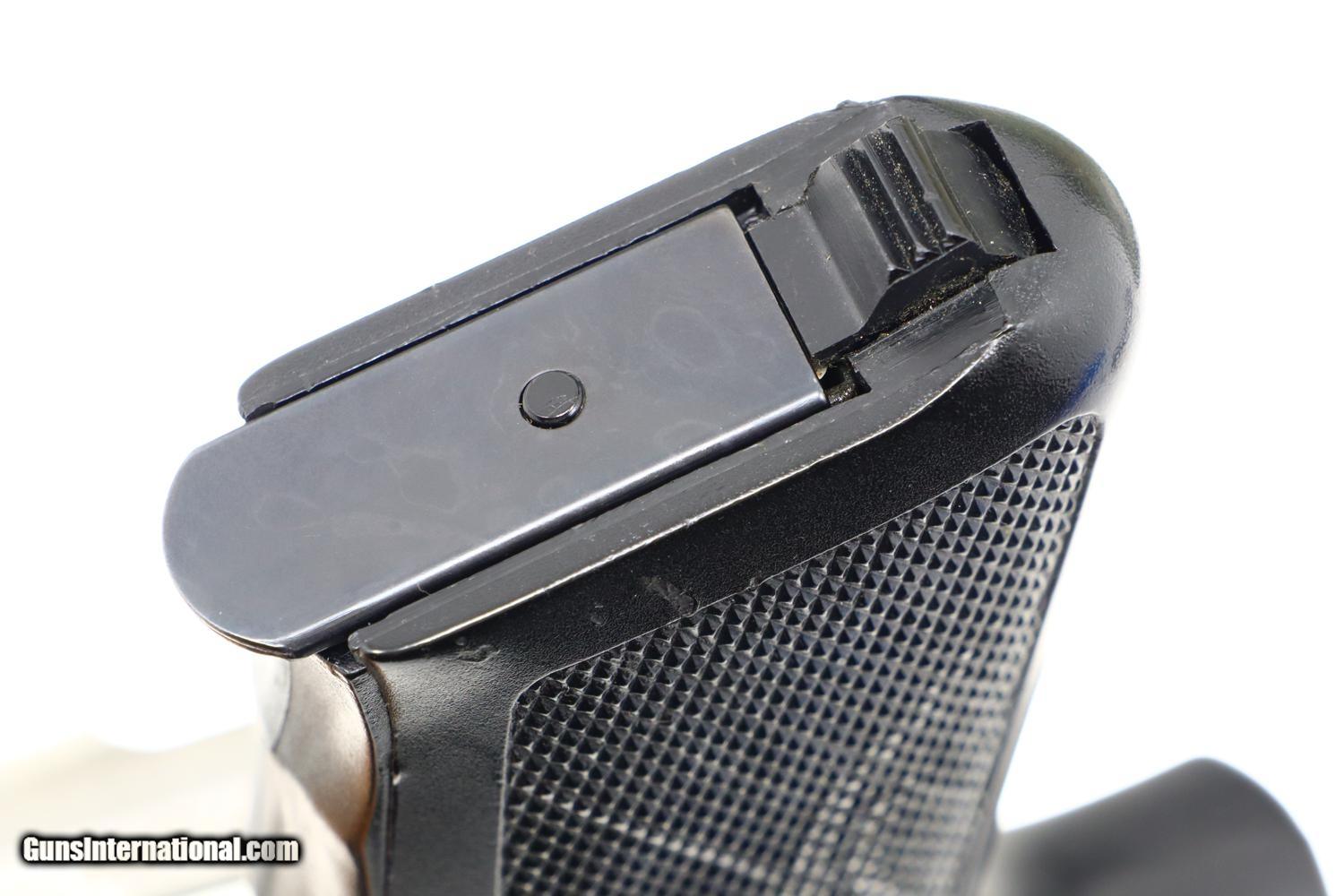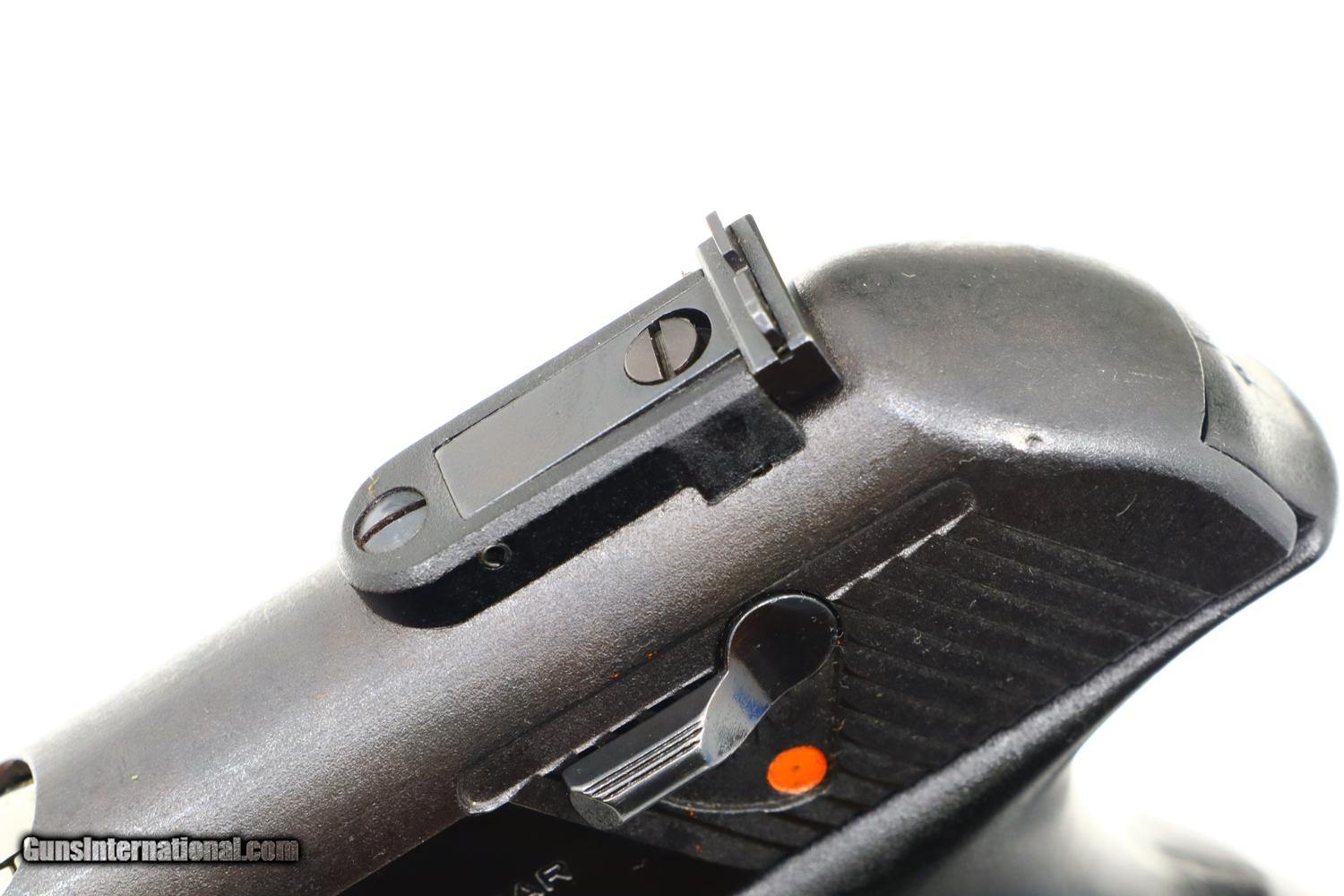 Description: Description: Early H&K P9S in 9mmP with polished slide and fully matching slide, barrel and frame, fitted with drift adjustable front sight and fully adjustable target rear sight. Standard P9S grip with red outlined “H&K” on left side, the single piece grip secured to the frame with two slotted screws on rear spine. Primary and spare magazines unmarked. Complete with spare, matching, extended barrel “KE” proofed (1994) along with replaced front and rear sights, take down tool and factory box. Synopsis: Scarce H&K P9S, 9mmP, Early Production, Spare Barrel, Parts, Boxed Condition: VG+, approximately 97%, with superficial scuffs as carefully pictured. Comparable condition grip and magazines. Scuffed box with oil darkened styrofoam insert. Primary and spare barrel with mirror bores. Perfect manual mechanics. A difficult to find H&K, particularly with a spare, matching, extended barrel. SOLD Manufacturer: Heckler & Koch Model: P9S Serial Number: 101712 Caliber Info: 9mmP Condition: VG |