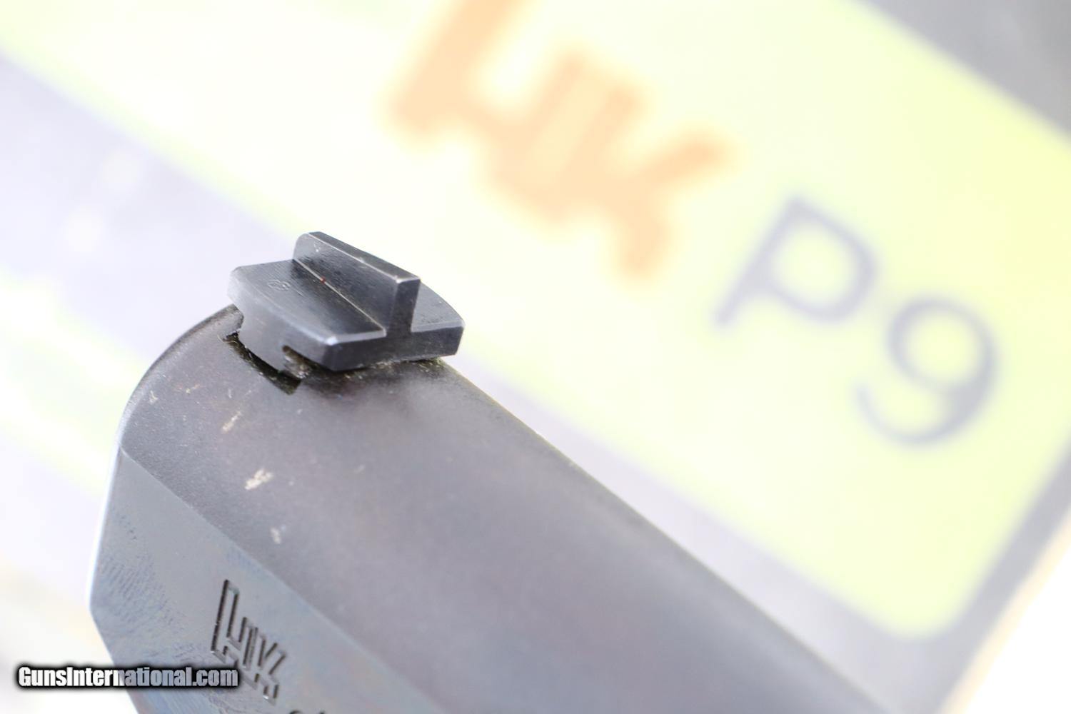Early H&K P9S in 9mmP with polished slide and fully matching slide, barrel and frame, fitted with drift adjustable front sight and fully adjustable target rear sight. Standard P9S grip with red outlined “H&K” on left side, the single piece grip secured to the frame with two slotted screws on rear spine. Primary and spare magazines unmarked. Complete with spare, matching, extended barrel “KE” proofed (1994) along with replaced front and rear sights, take down tool and factory box.