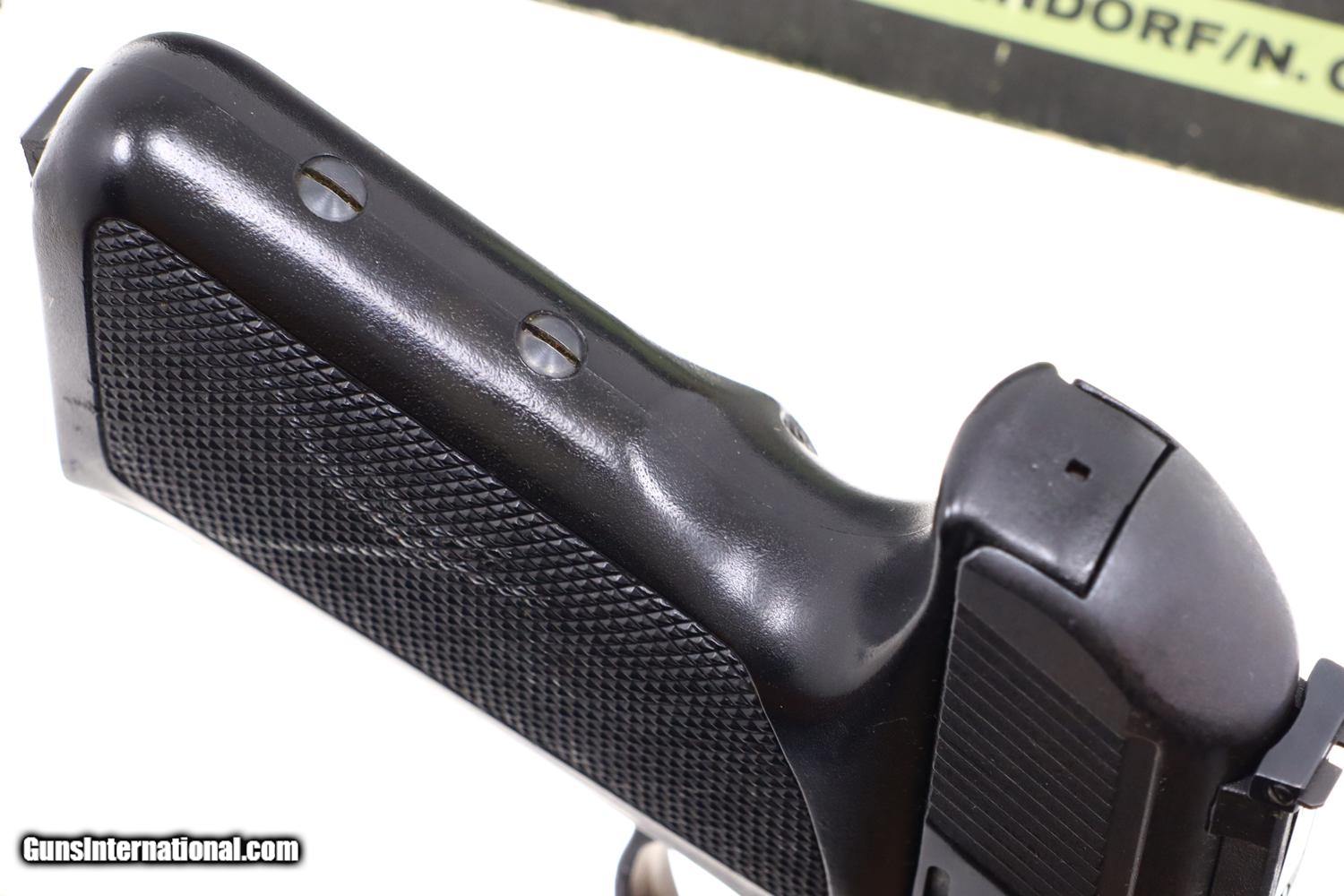 VG+, approximately 97%, with superficial scuffs as carefully pictured. Comparable condition grip and magazines. Scuffed box with oil darkened styrofoam insert. Primary and spare barrel with mirror bores. Perfect manual mechanics. A difficult to find H&K, particularly with a spare, matching, extended barrel.