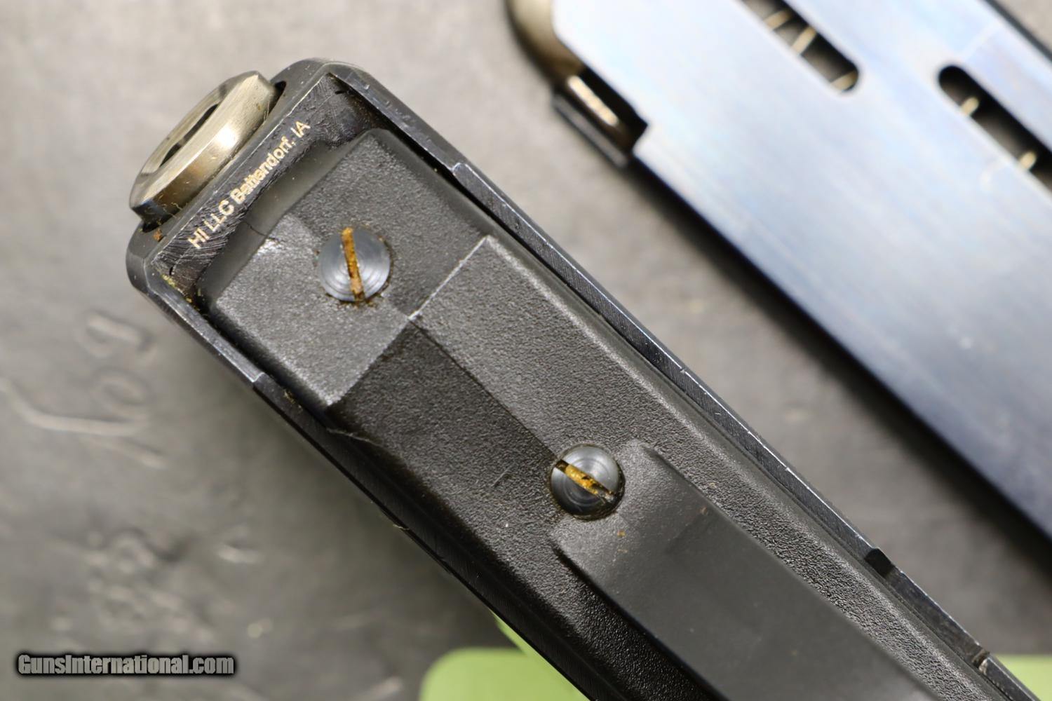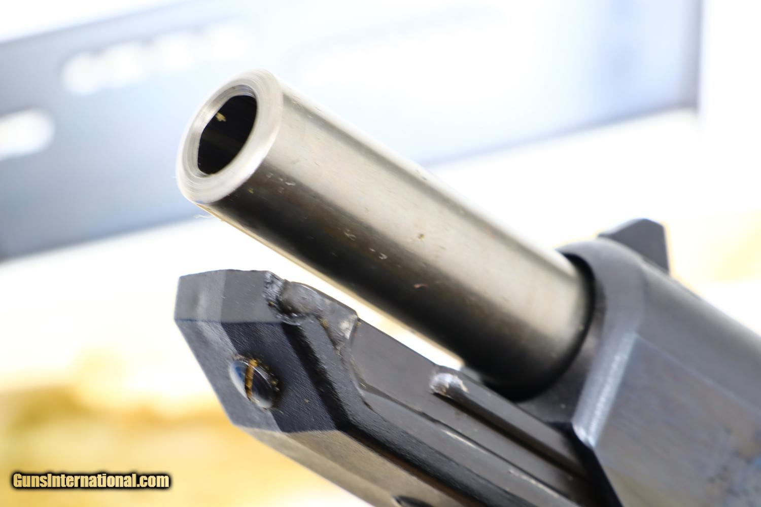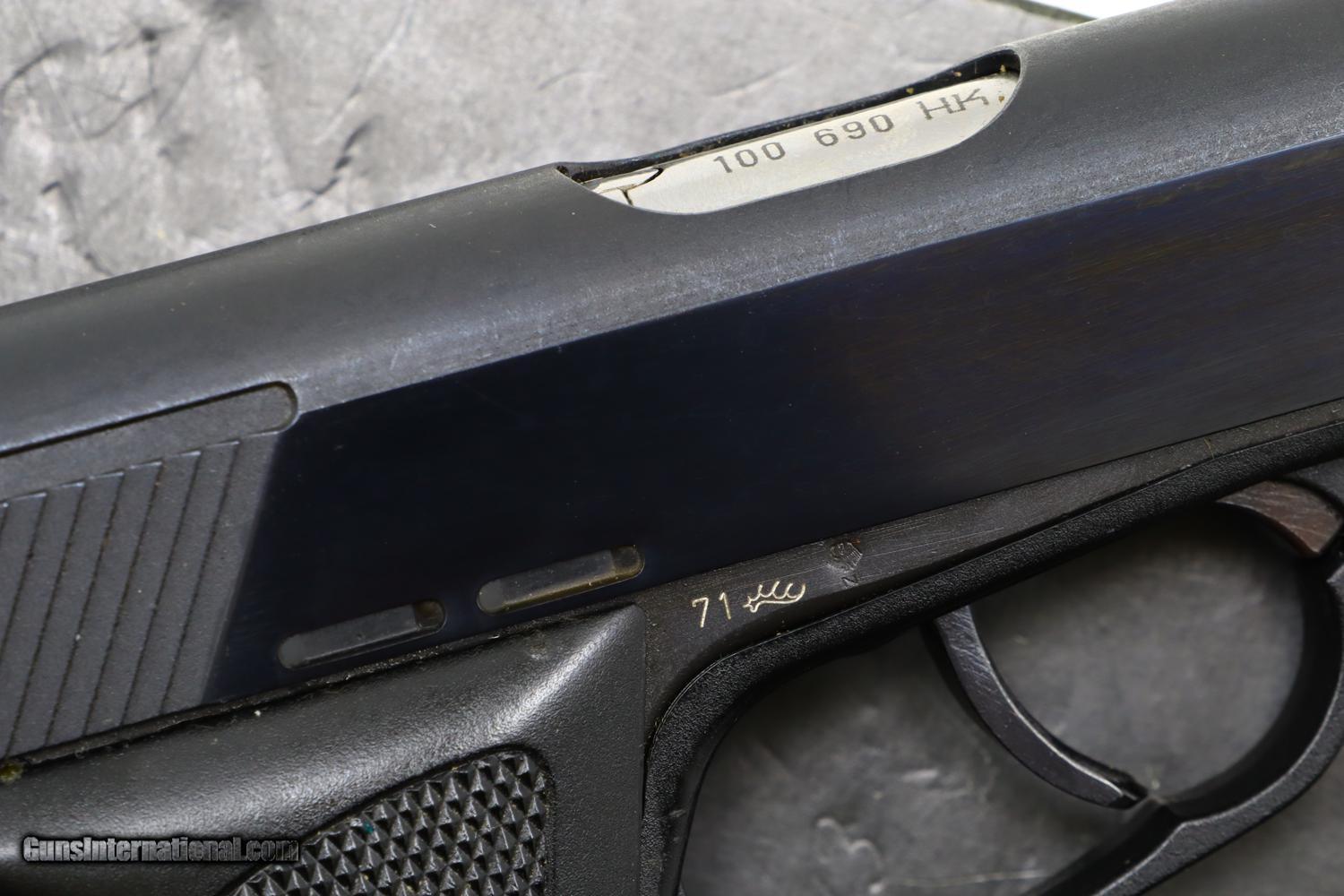 Description: Description: Early H&K P9S in 9mmP, made in 1971, with polished slide and fully matching barrel and frame, fitted with drift adjustable front sight (white highlights)and rear sight (red highlights). Standard P9S grip with red outlined “H&K” on left side, the single piece grip secured to the frame with two slotted screws on rear spine. Primary and spare magazines unmarked. Complete with original shipping box with slip in styrofoam insert for pistol and spare magazine. No literature. Synopsis: H&K, P9S, Early Production, Spare Mag, Original box, 100690, I-411 Condition: Near Exc, the only flaw related to a small chip on the left side of forward frame at muzzle. Comparable condition grip and magazines. Scuffed box with oil darkened styrofoam insert. Mirror bore. Perfect manual mechanics. A difficult to find H&K, particularly a high polished gun in the original box. SOLD Manufacturer: H&K Model: P9S Serial Number: 100690 Caliber Info: 9mmP Condition: Near EXC |